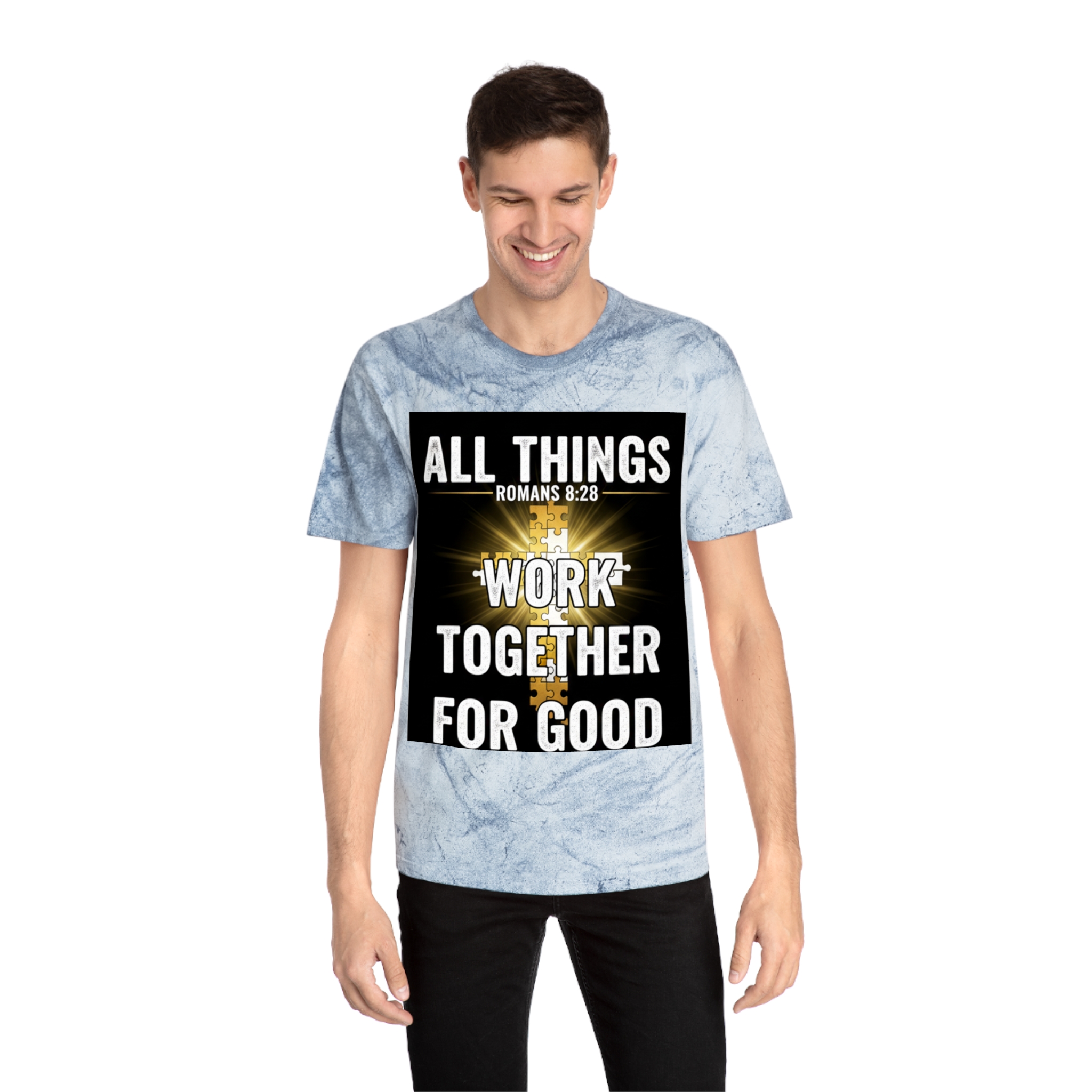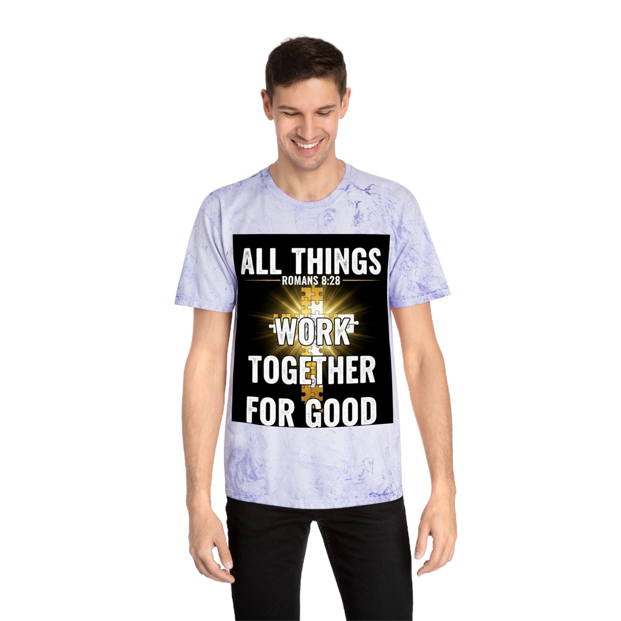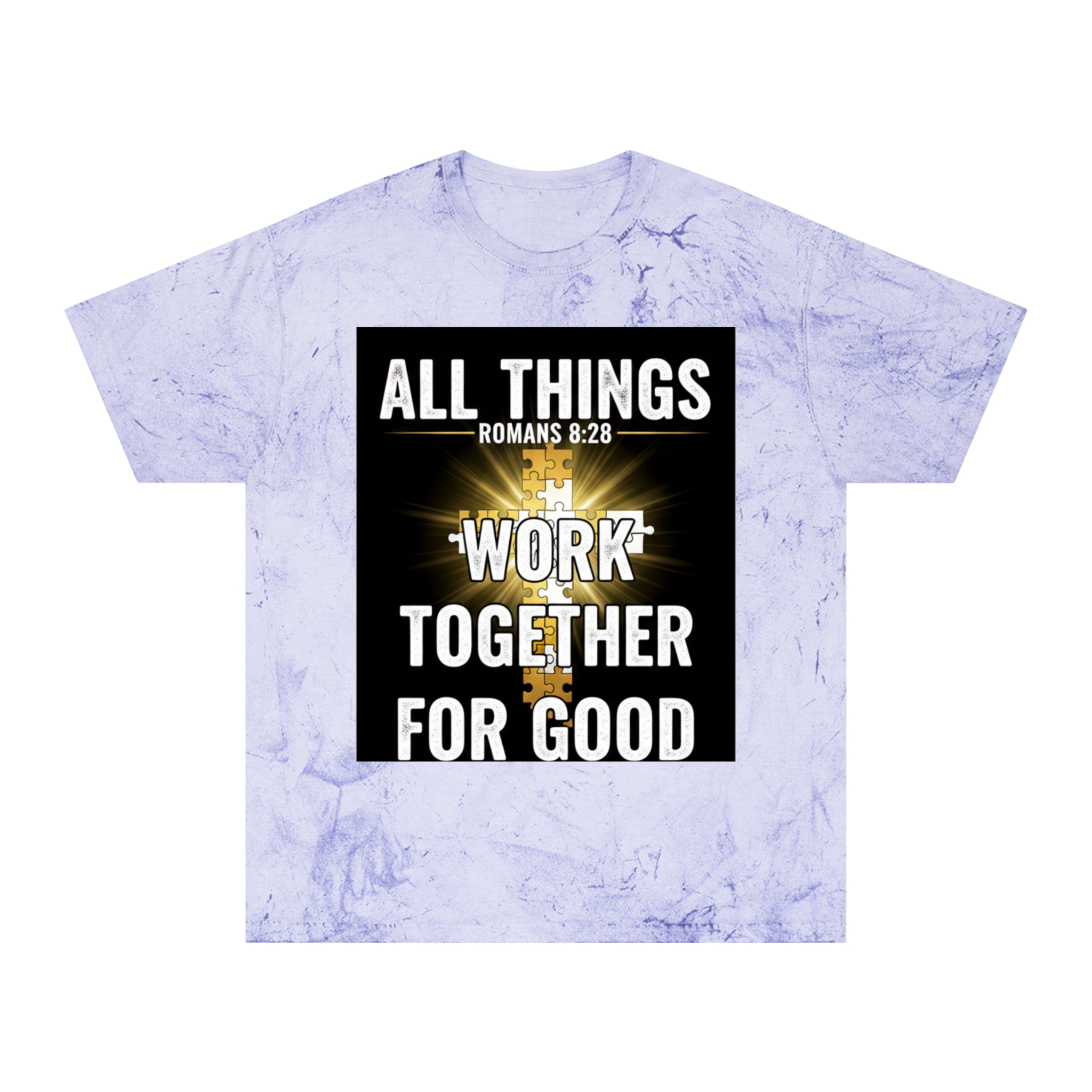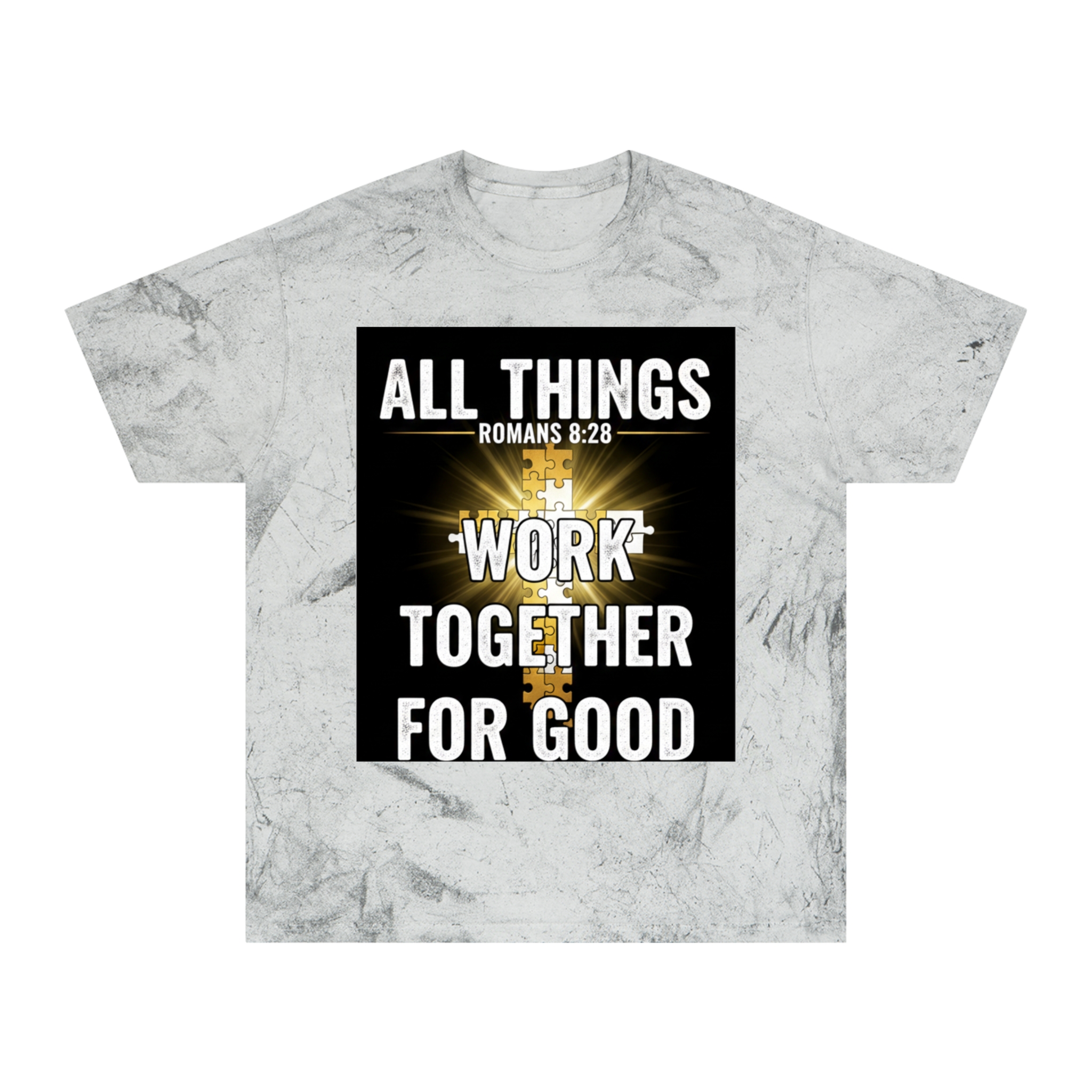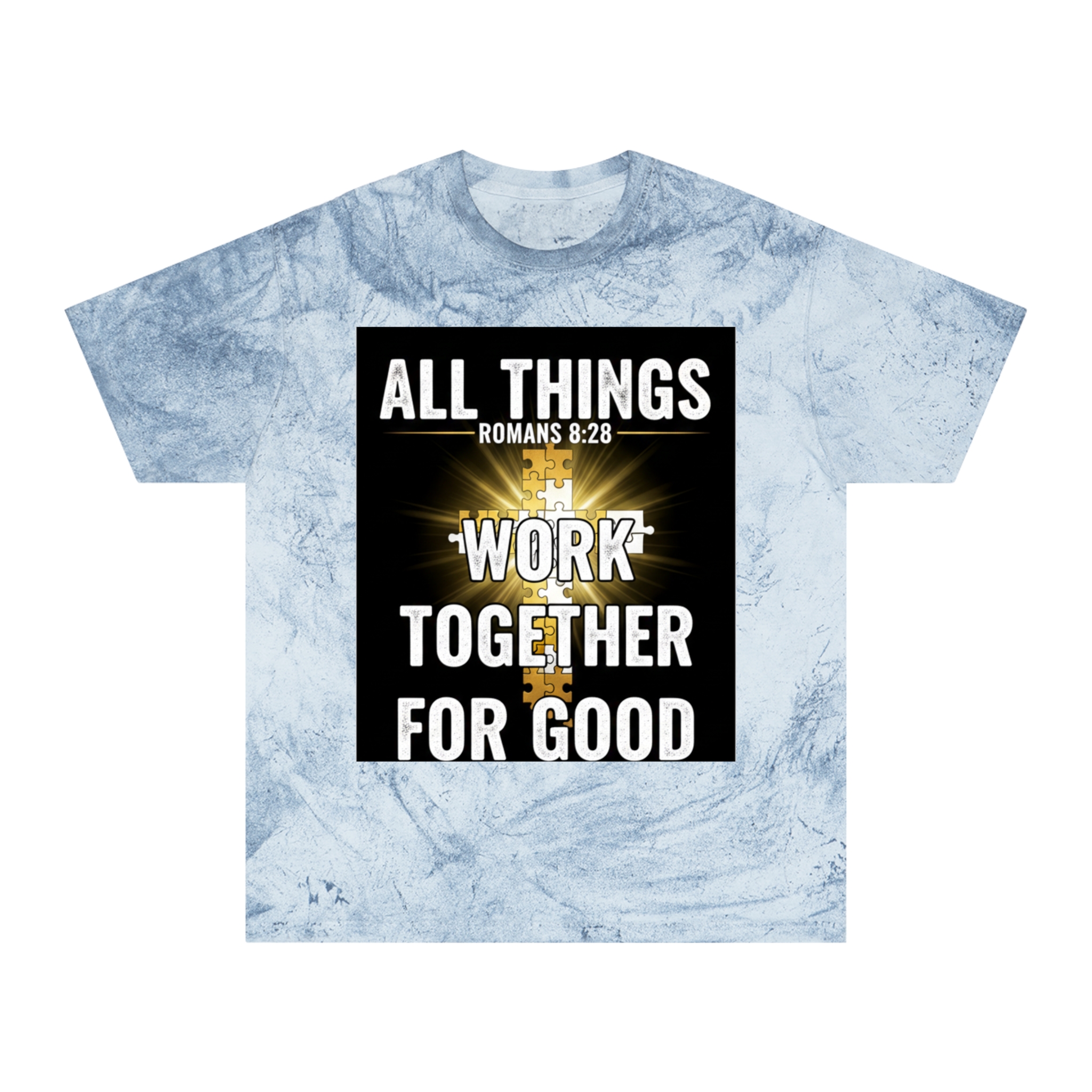 This Color Blast T-shirt brings quiet confidence to everyday wear. The garment-dyed, marbled fabric gives each shirt a lived-in, textured look that pairs naturally with the bold scripture graphic at the chest — a radiant cross and the words “All things work together for good” (Romans 8:28). It sits relaxed on the body and feels soft from the first wear, thanks to ring-spun cotton and stable necktape. The result is a wearable statement piece for weekday routines, volunteer days, church gatherings, or Sunday services that reads like a personal reminder rather than loud branding. Because each shirt’s pigment-dyed finish varies, every piece is one-of-a-kind and develops its own character over time.