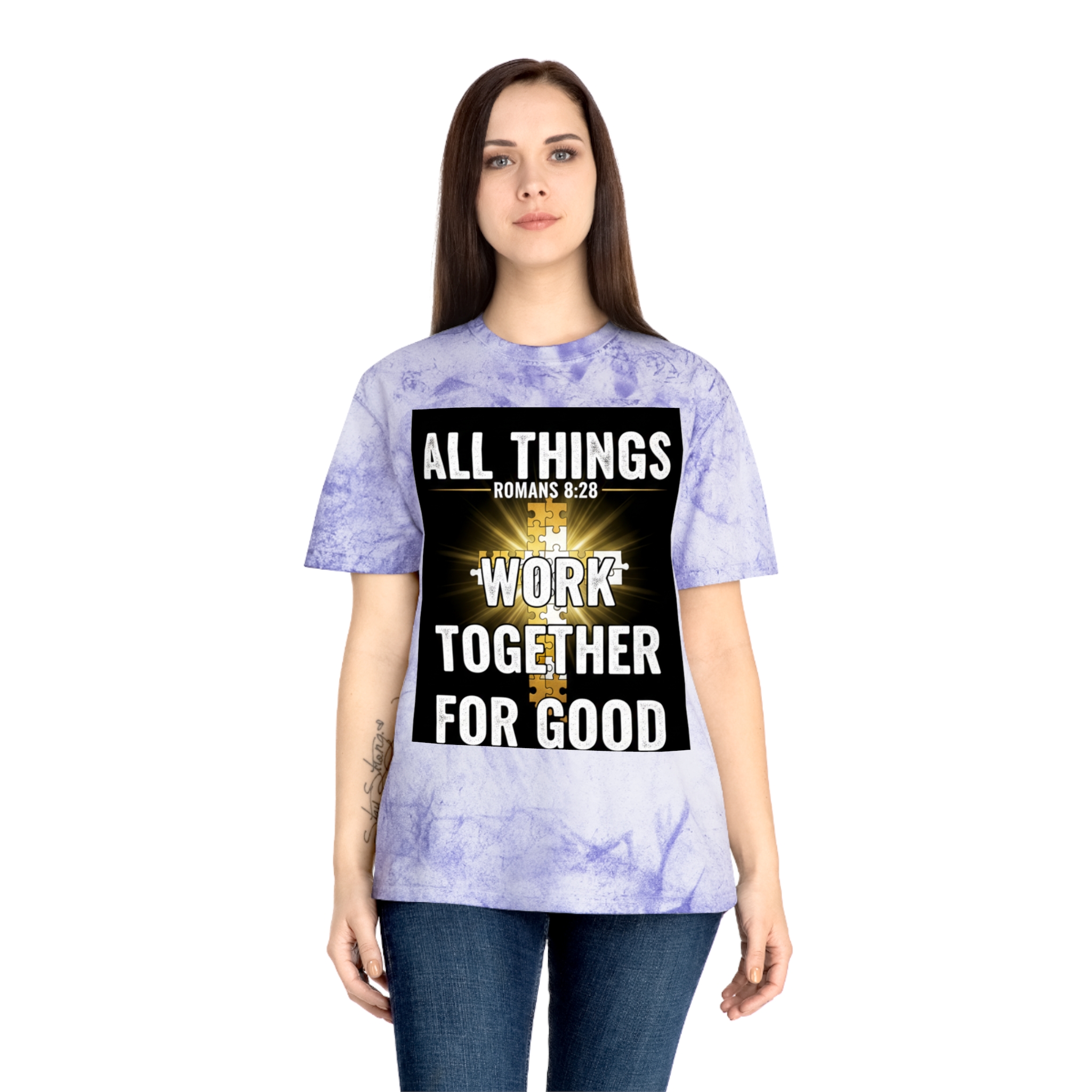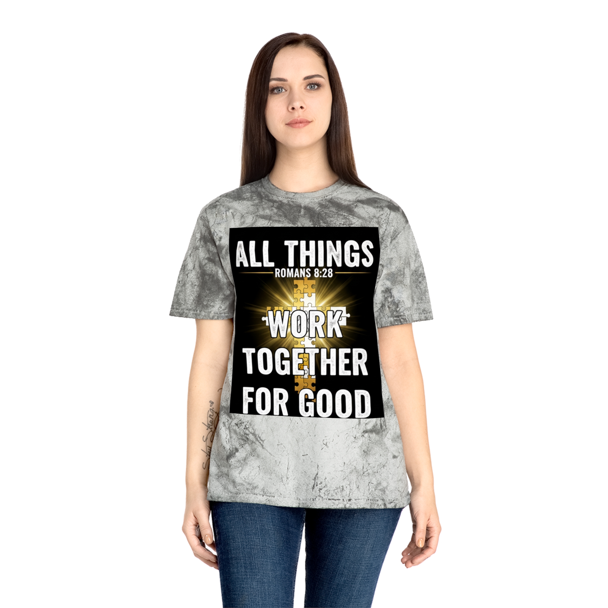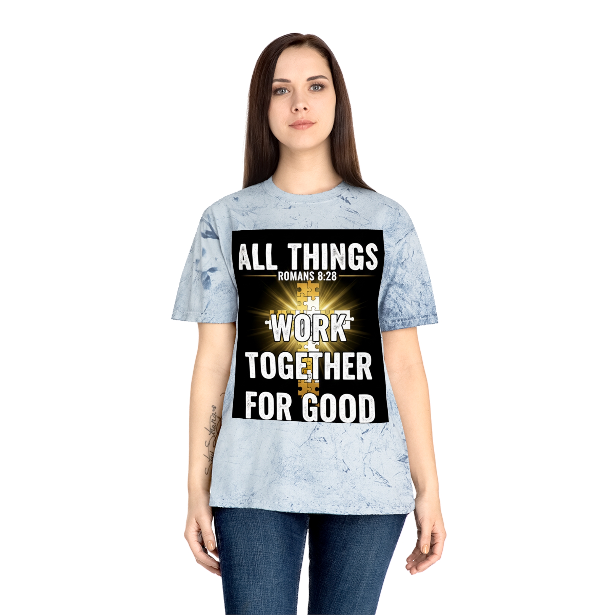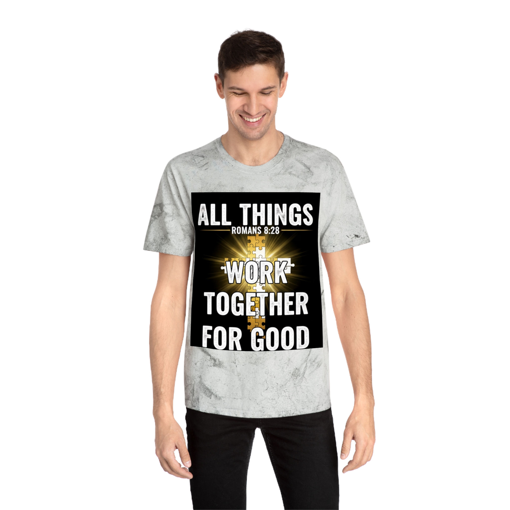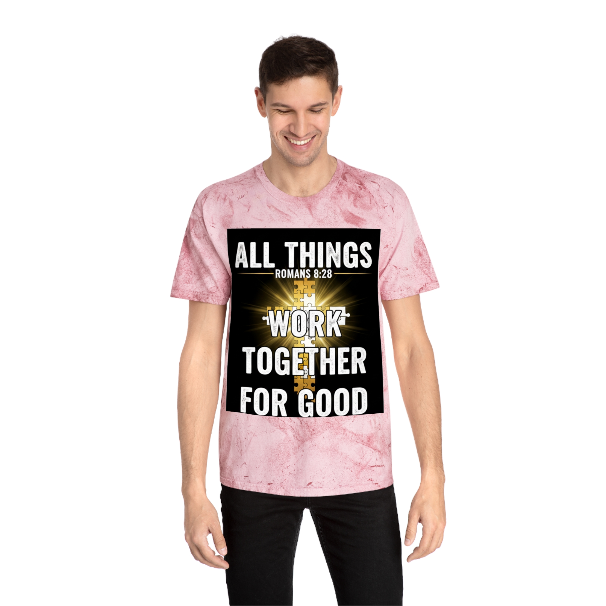 This Color Blast T-shirt brings quiet confidence to everyday wear. The garment-dyed, marbled fabric gives each shirt a lived-in, textured look that pairs naturally with the bold scripture graphic at the chest — a radiant cross and the words “All things work together for good” (Romans 8:28). It sits relaxed on the body and feels soft from the first wear, thanks to ring-spun cotton and stable necktape. The result is a wearable statement piece for weekday routines, volunteer days, church gatherings, or Sunday services that reads like a personal reminder rather than loud branding. Because each shirt’s pigment-dyed finish varies, every piece is one-of-a-kind and develops its own character over time.
