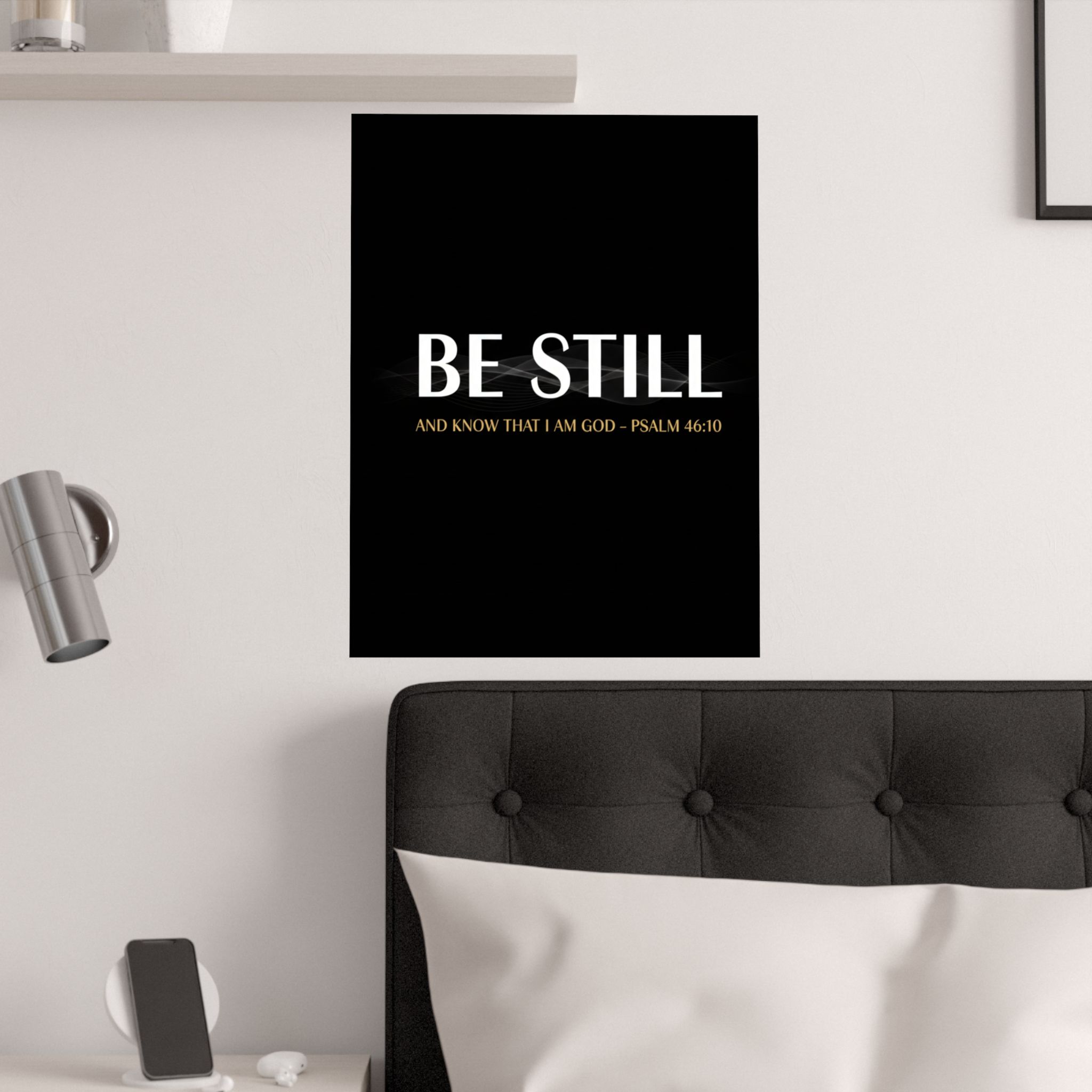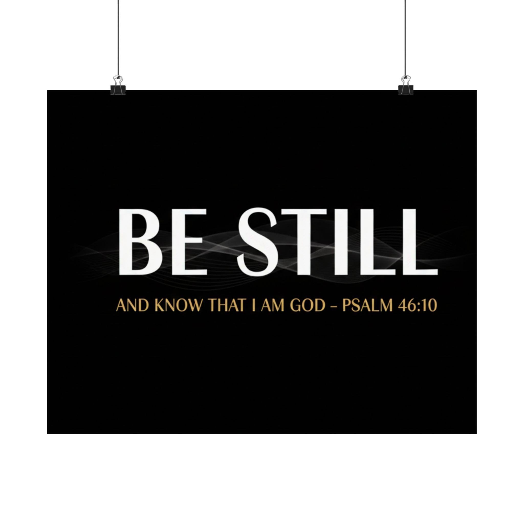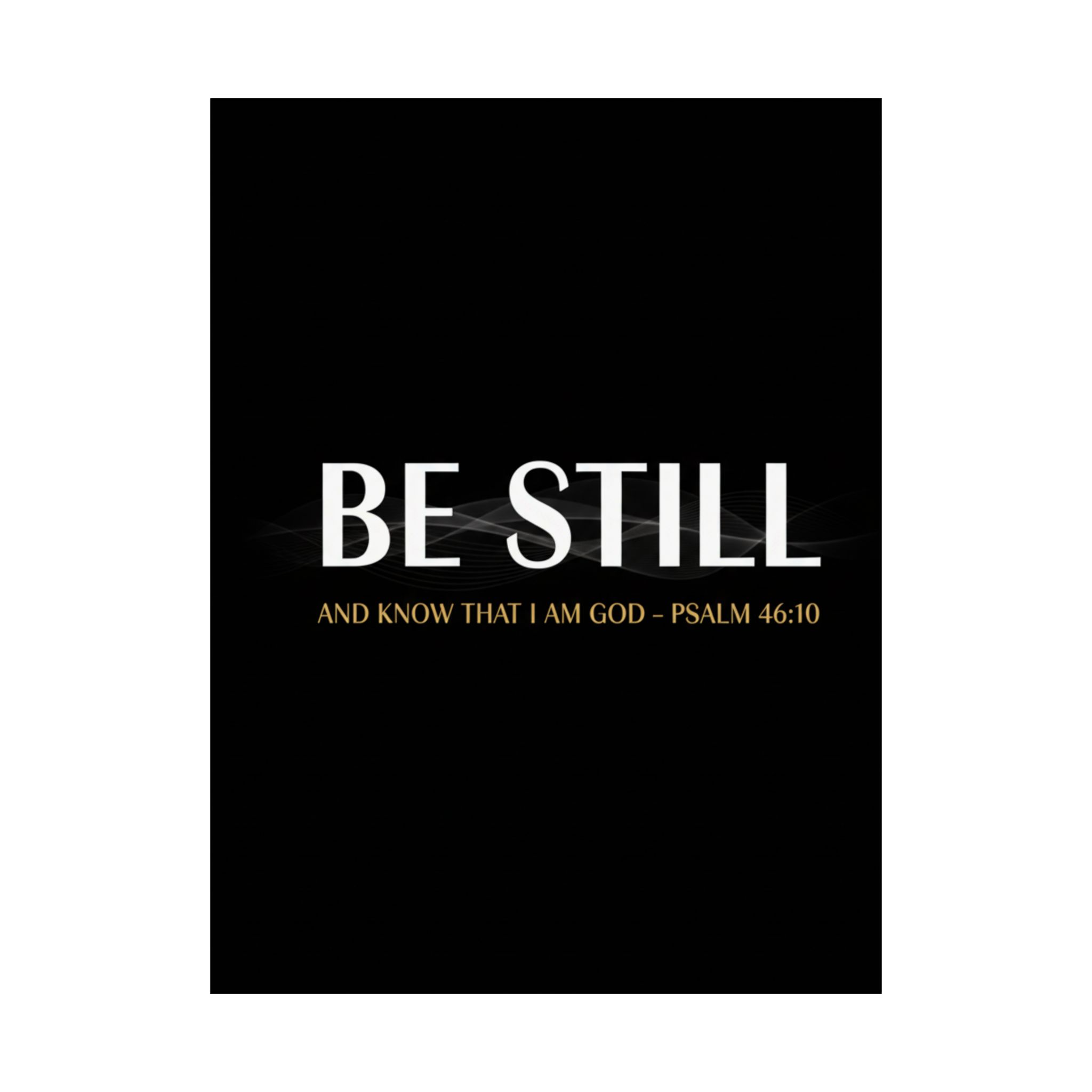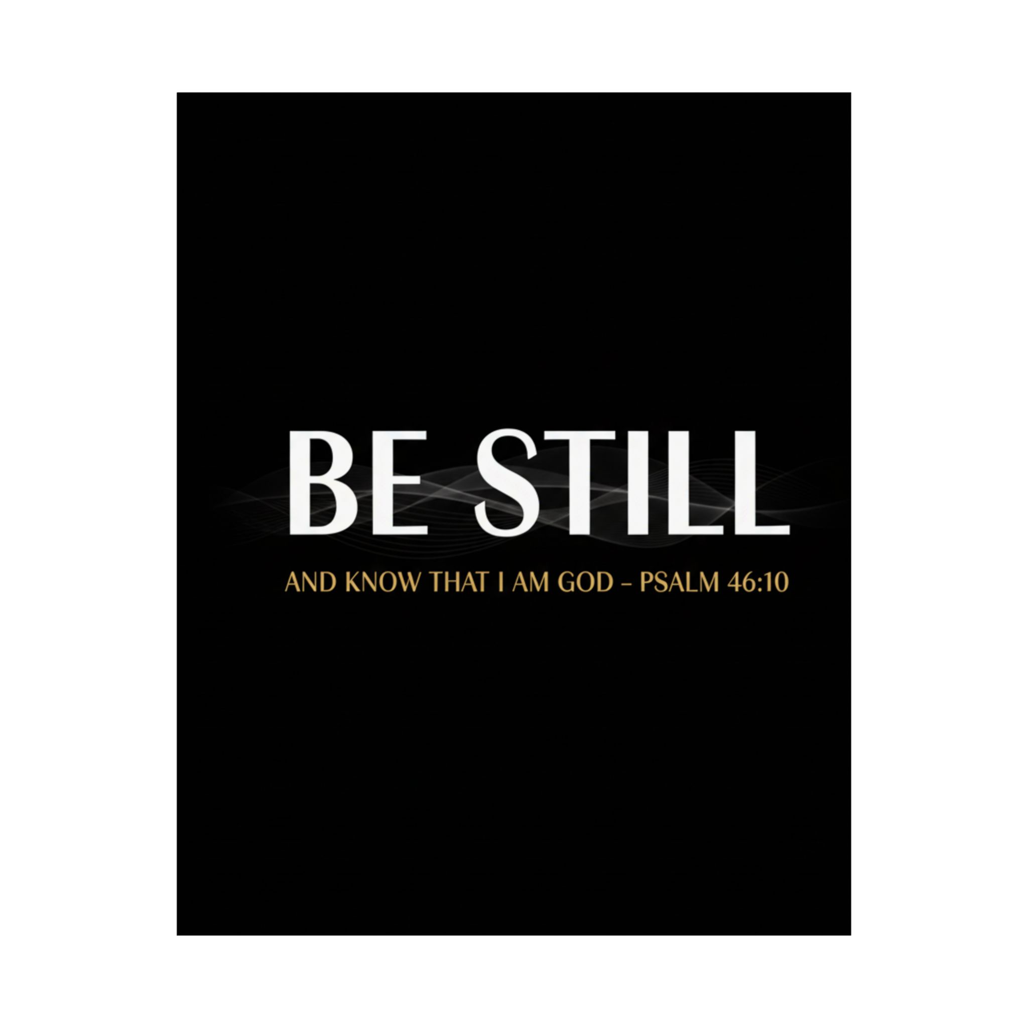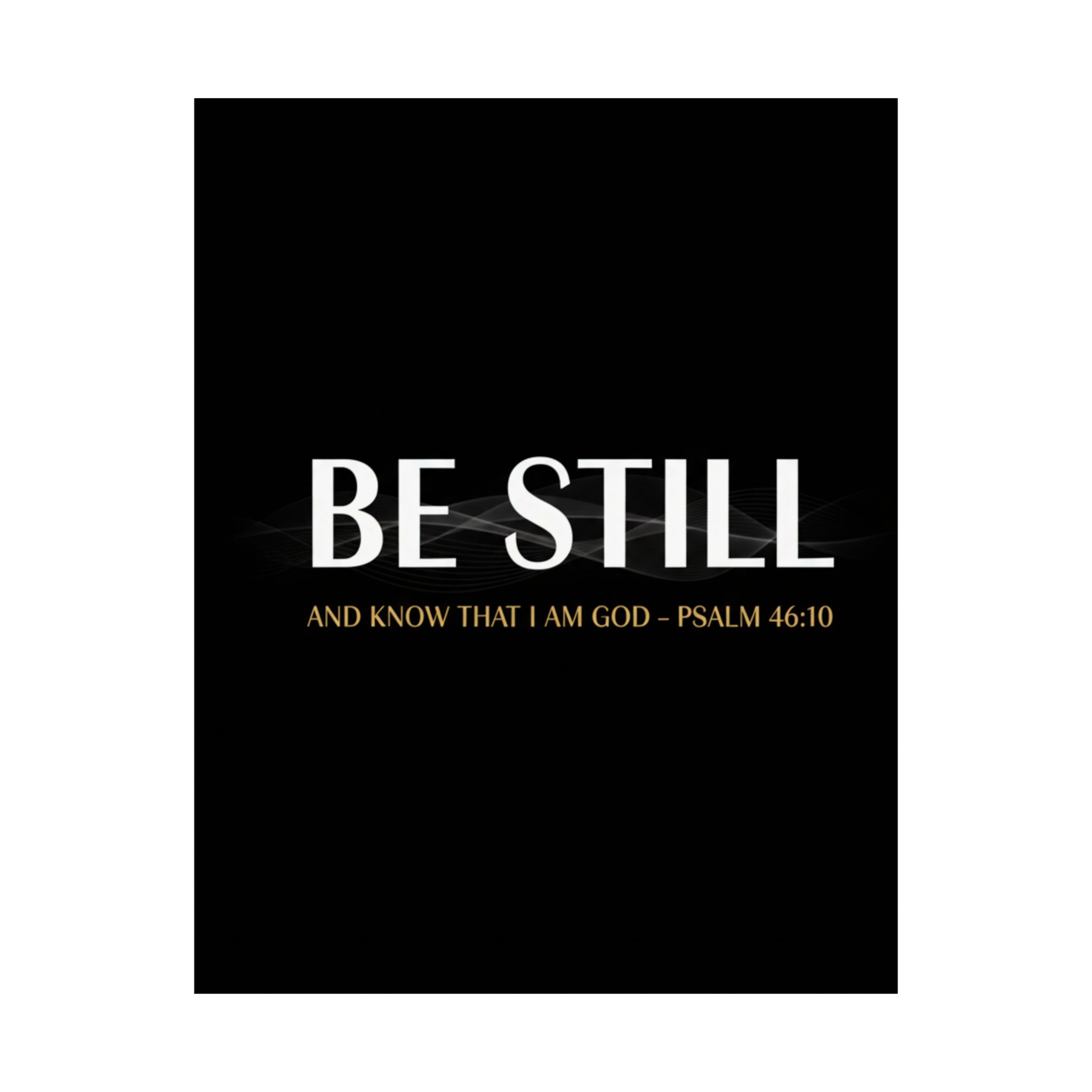 A calming, minimalist satin poster that brings a quiet, reverent moment into any room. Bold white type “BE STILL” sits against deep black with a subtle, smoky texture beneath, and a warm gold line of scripture—“AND KNOW THAT I AM GOD – PSALM 46:10”—that catches the eye without shouting. The low-glare satin finish and museum-grade paper give the piece a polished, archival feel that holds rich blacks and crisp lettering. Hang it above a bedside table, in a reading nook, or near a prayer corner to create a space for pause, reflection, and steadying breath.