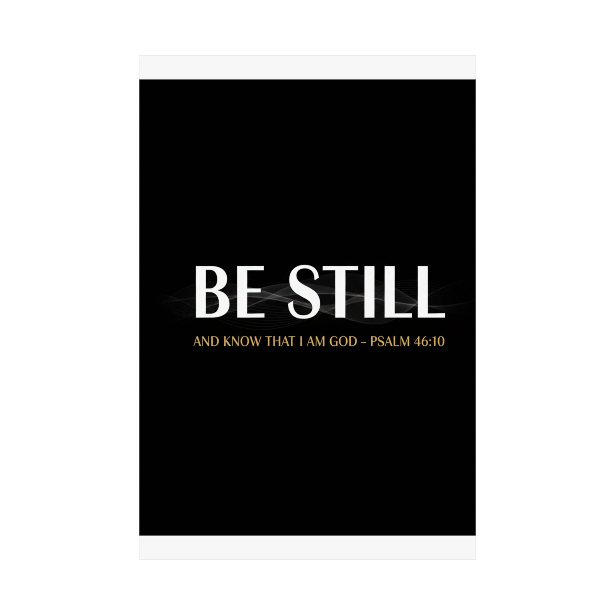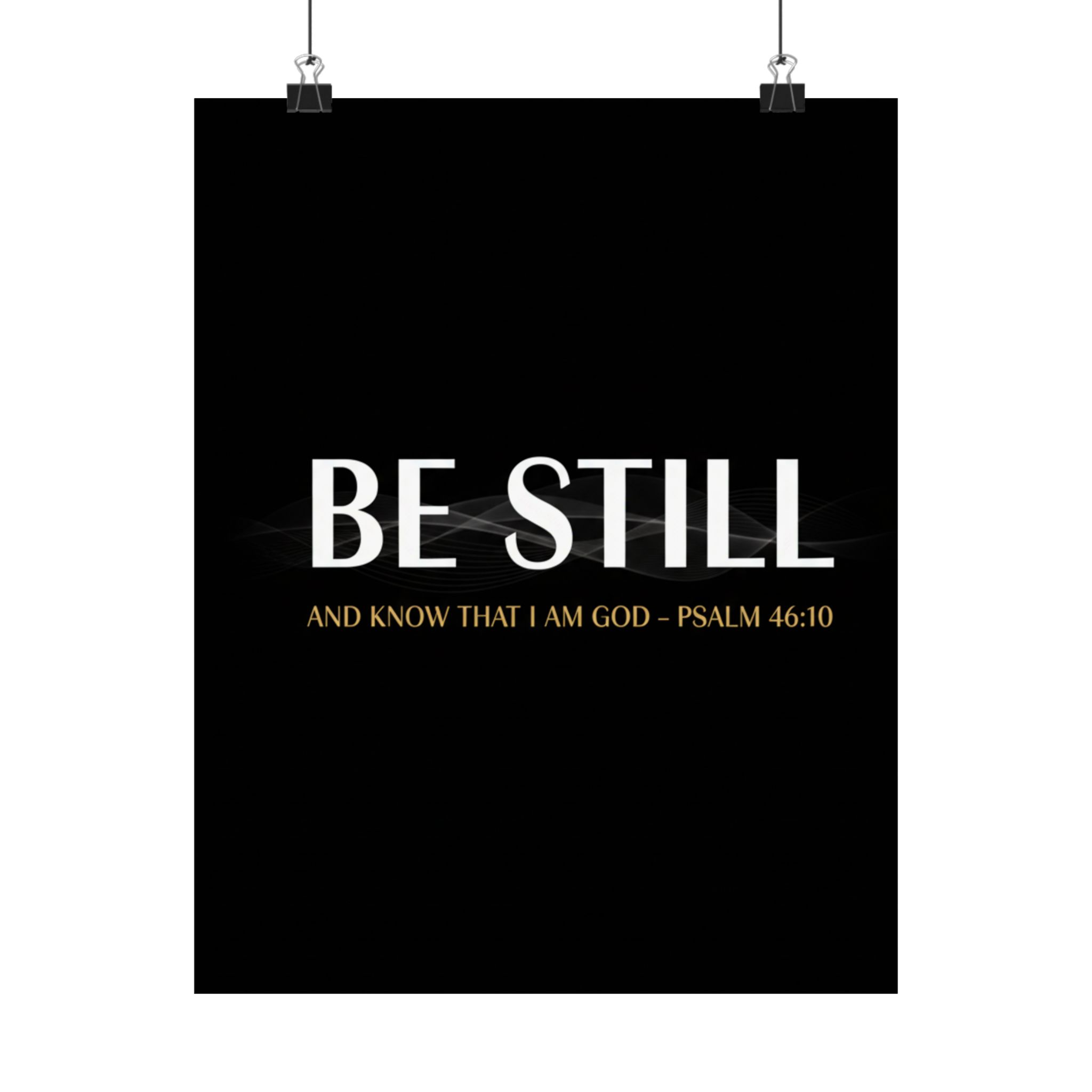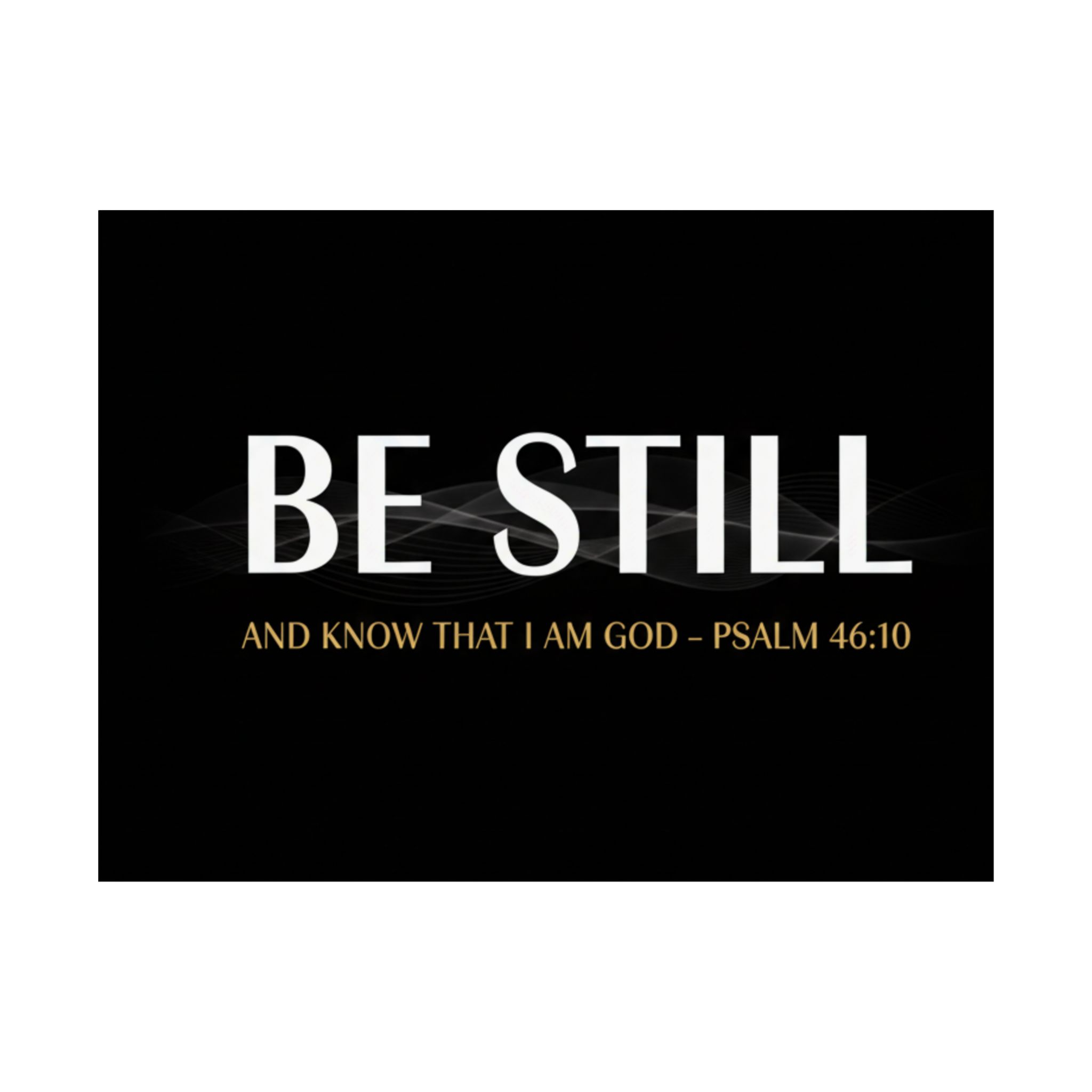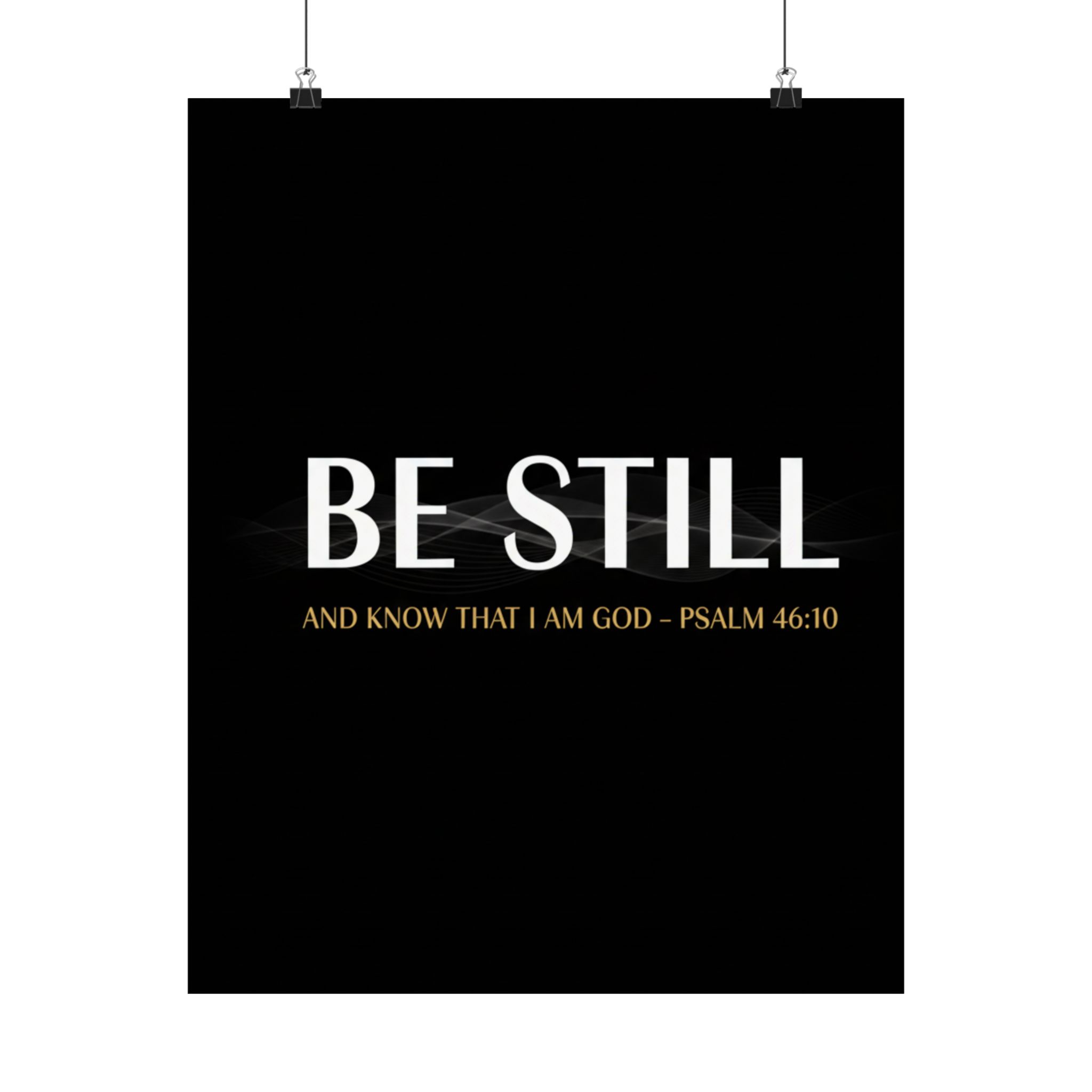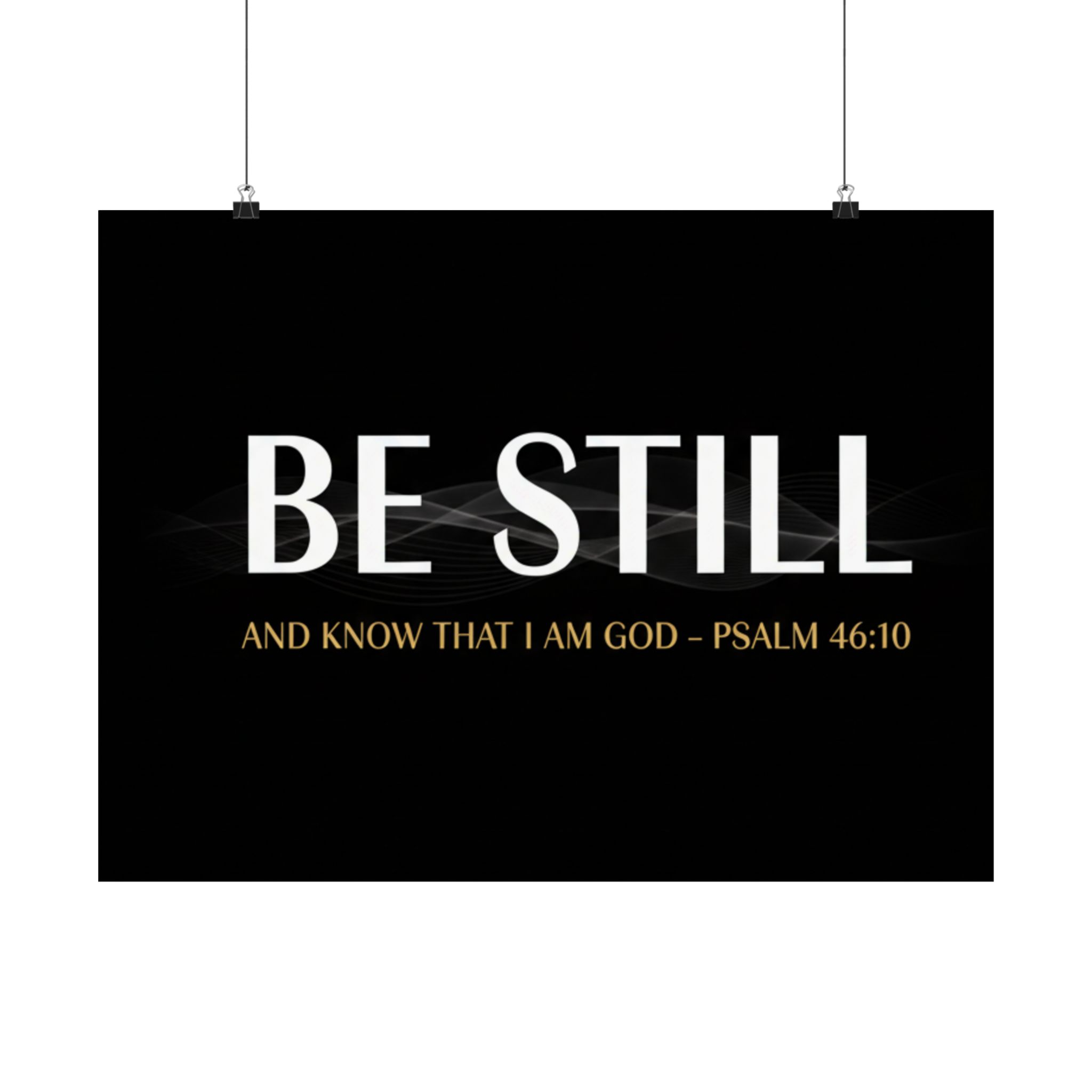 A calming, minimalist satin poster that brings a quiet, reverent moment into any room. Bold white type “BE STILL” sits against deep black with a subtle, smoky texture beneath, and a warm gold line of scripture—“AND KNOW THAT I AM GOD – PSALM 46:10”—that catches the eye without shouting. The low-glare satin finish and museum-grade paper give the piece a polished, archival feel that holds rich blacks and crisp lettering. Hang it above a bedside table, in a reading nook, or near a prayer corner to create a space for pause, reflection, and steadying breath.