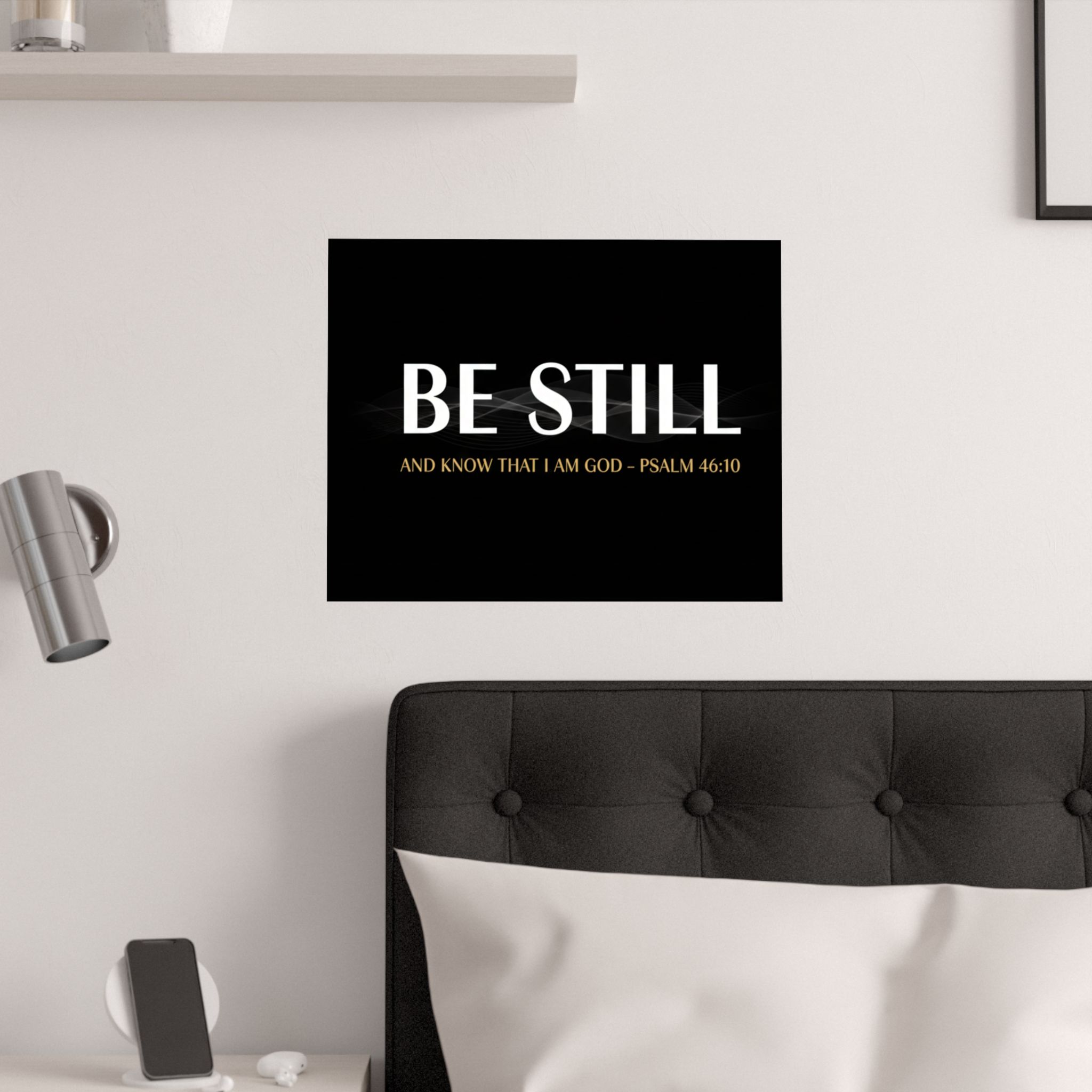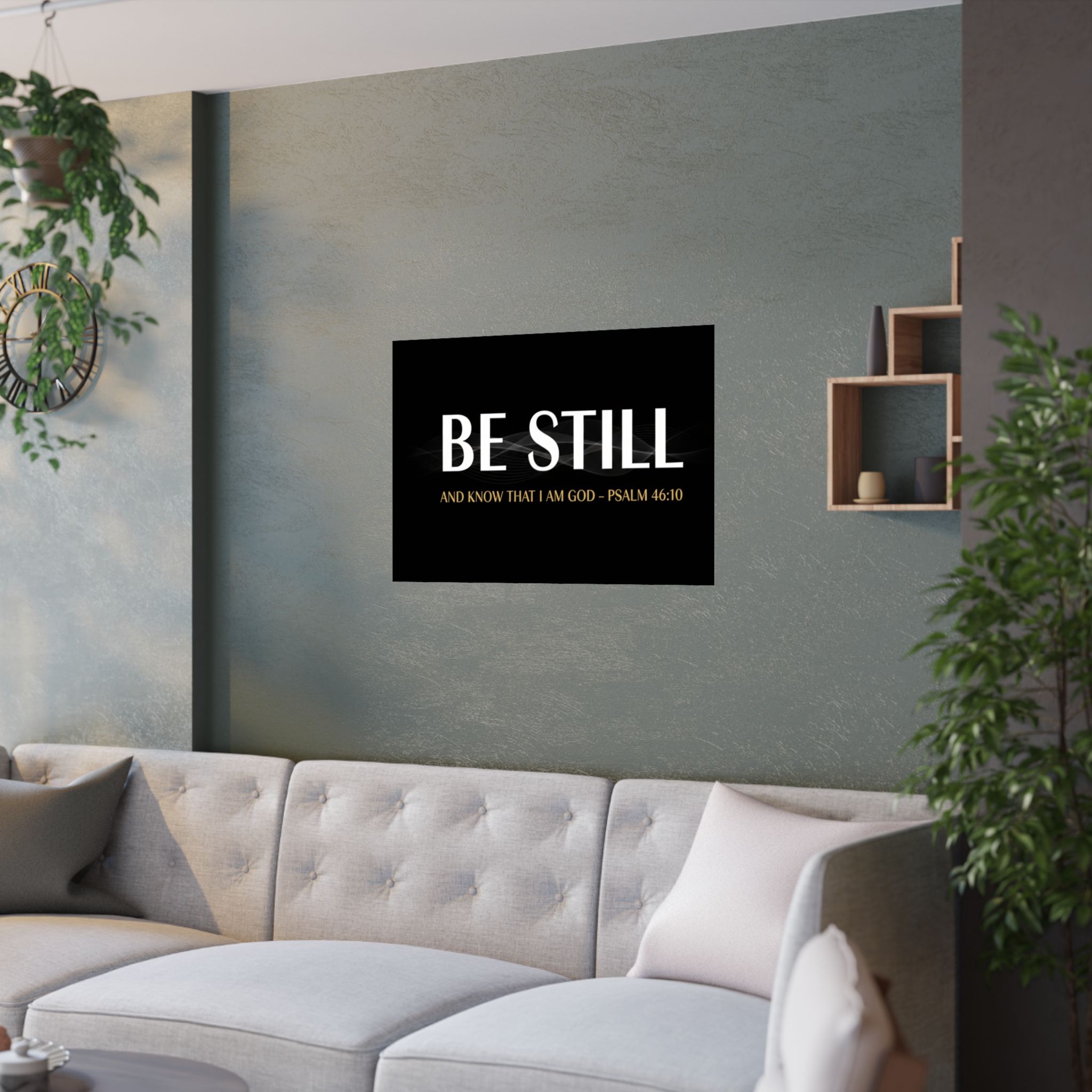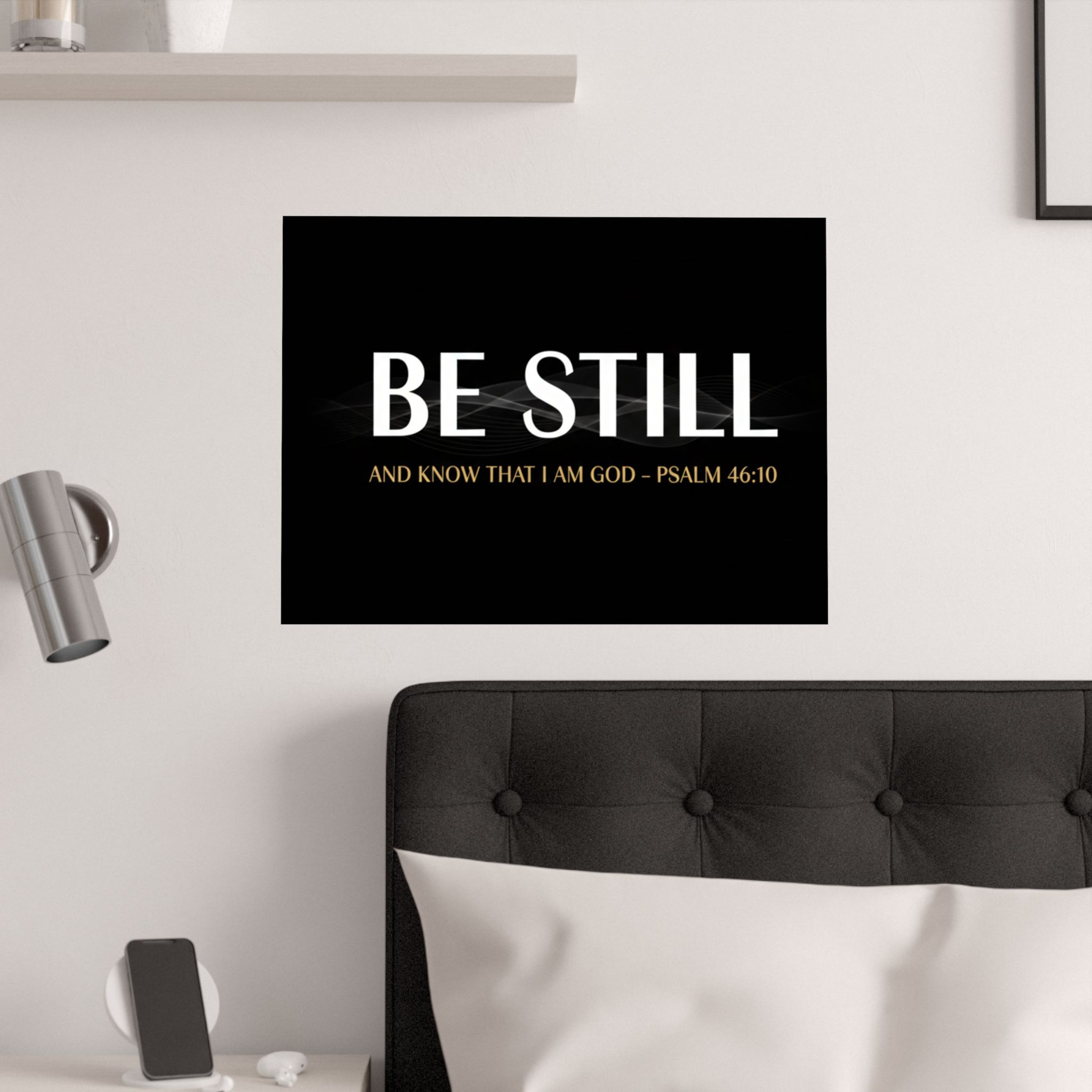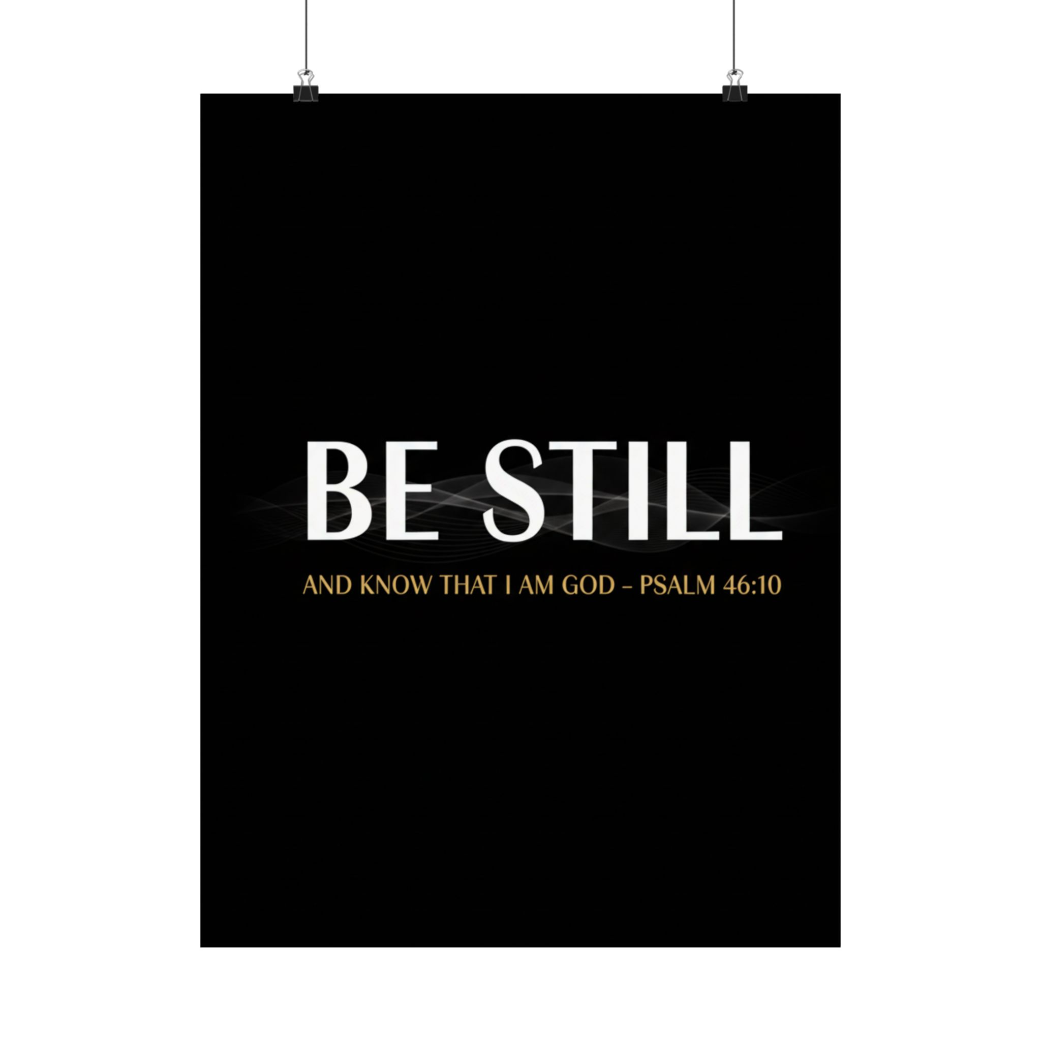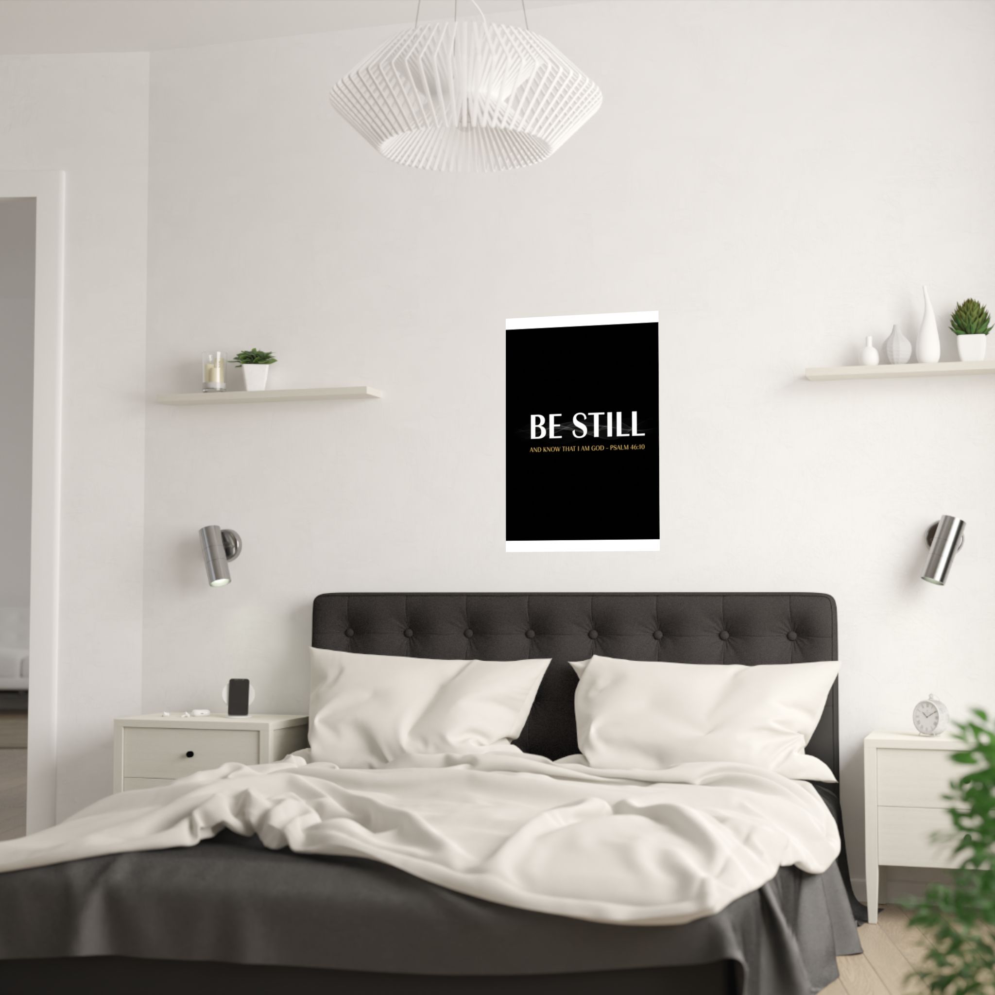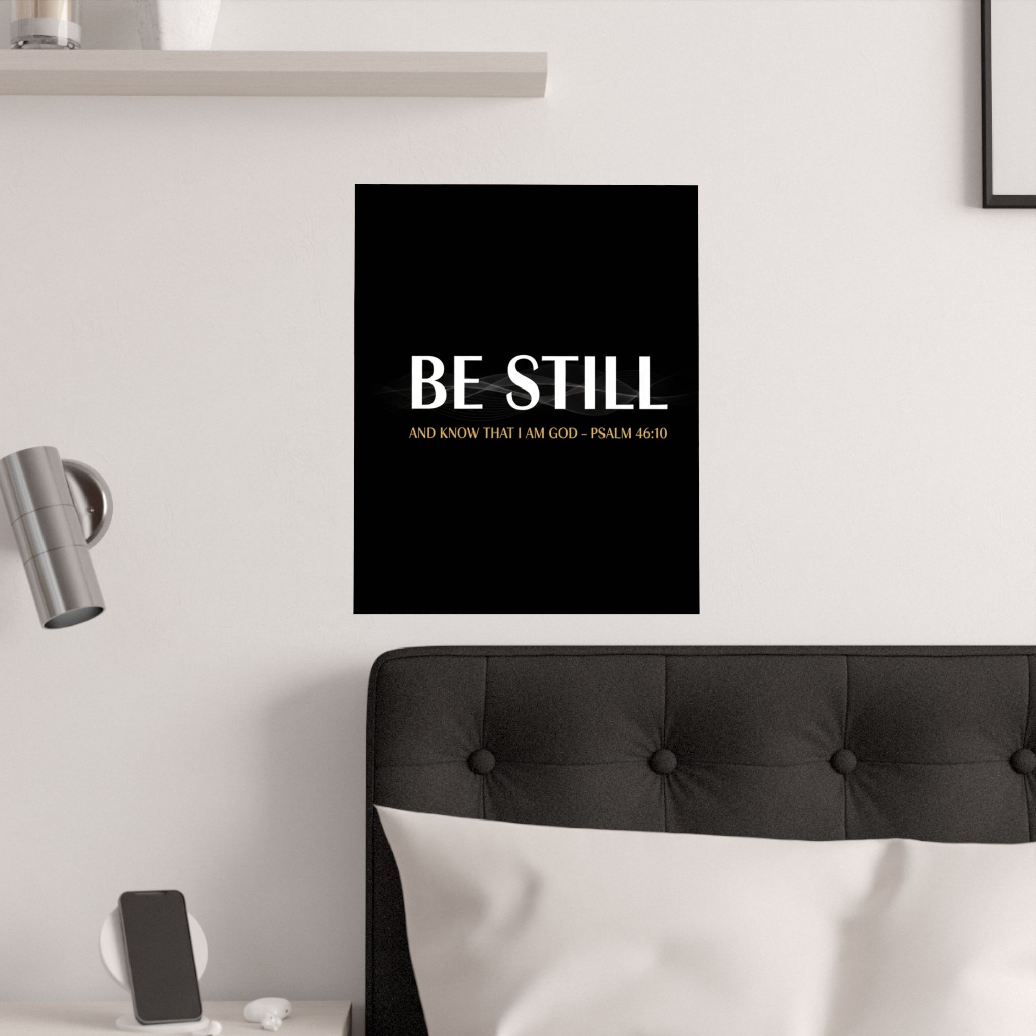 A calming, minimalist satin poster that brings a quiet, reverent moment into any room. Bold white type “BE STILL” sits against deep black with a subtle, smoky texture beneath, and a warm gold line of scripture—“AND KNOW THAT I AM GOD – PSALM 46:10”—that catches the eye without shouting. The low-glare satin finish and museum-grade paper give the piece a polished, archival feel that holds rich blacks and crisp lettering. Hang it above a bedside table, in a reading nook, or near a prayer corner to create a space for pause, reflection, and steadying breath.