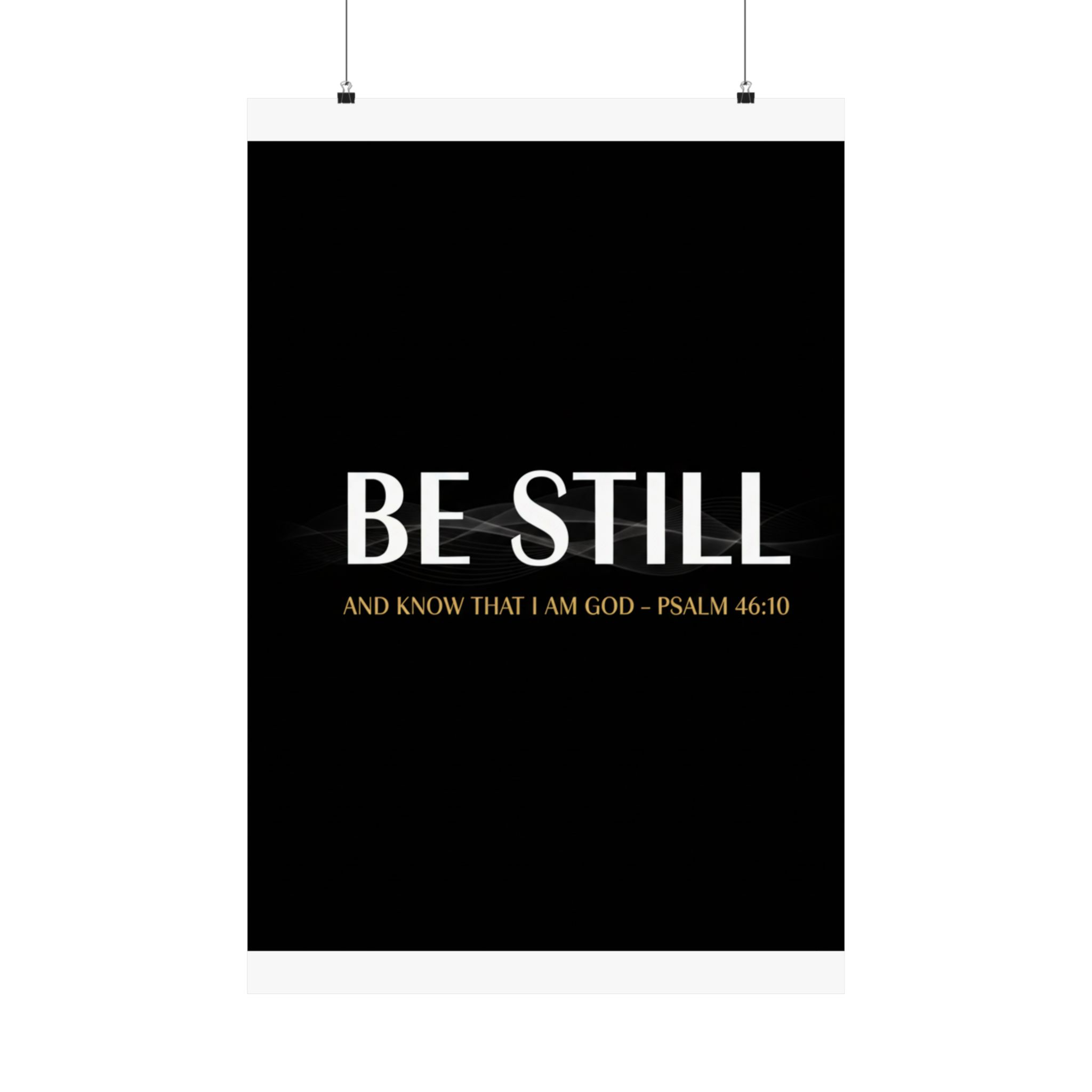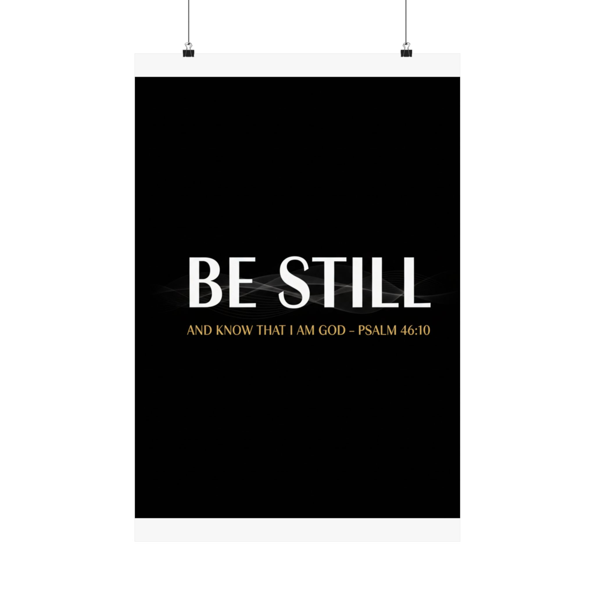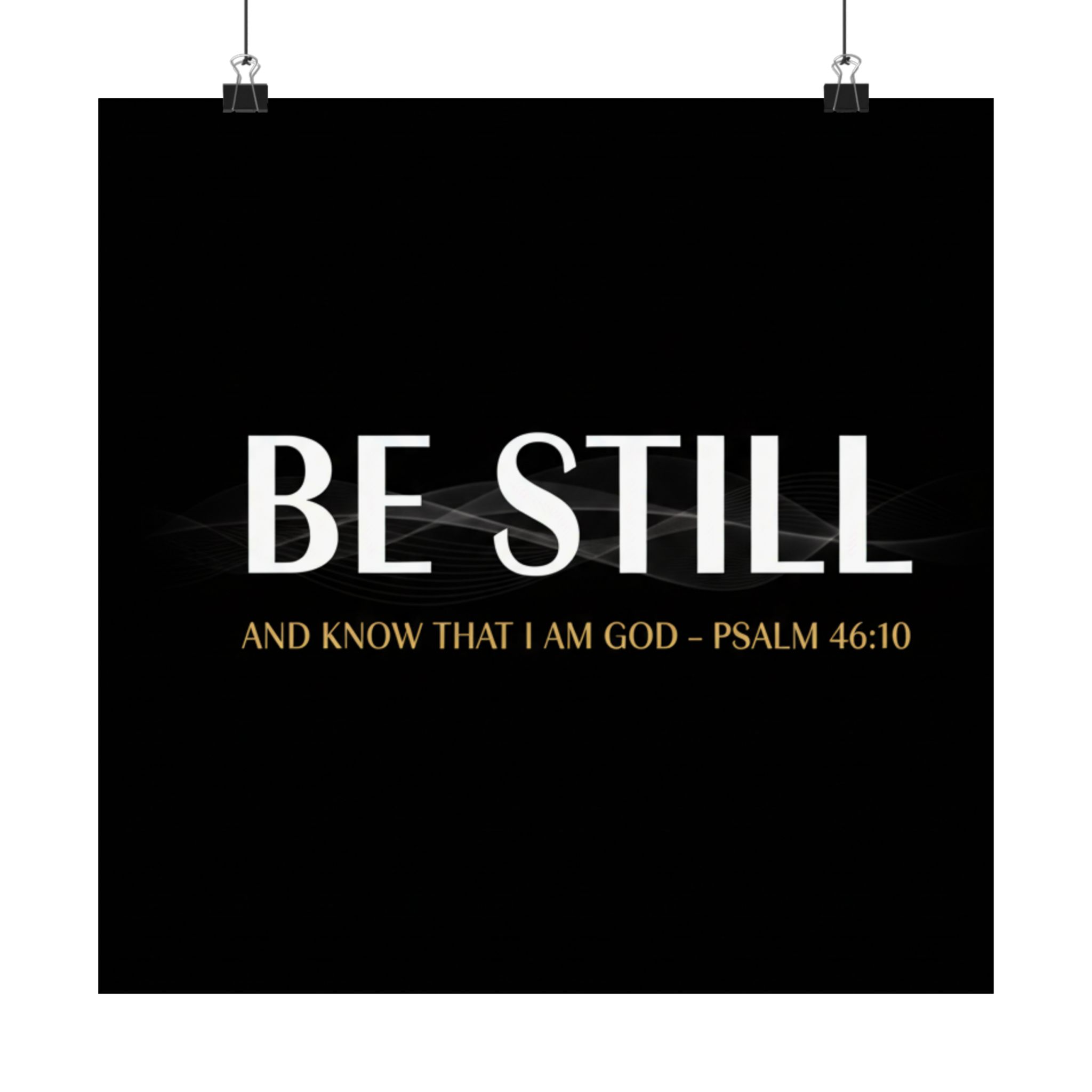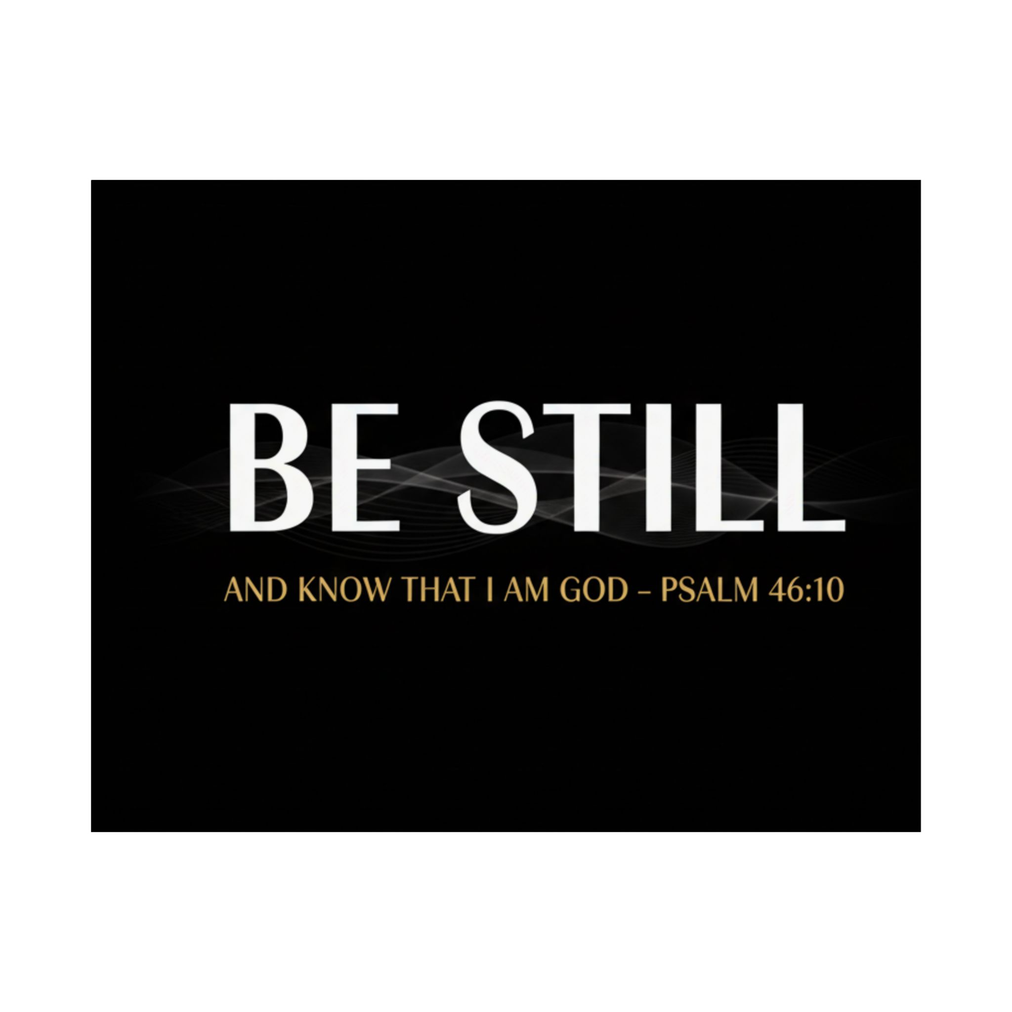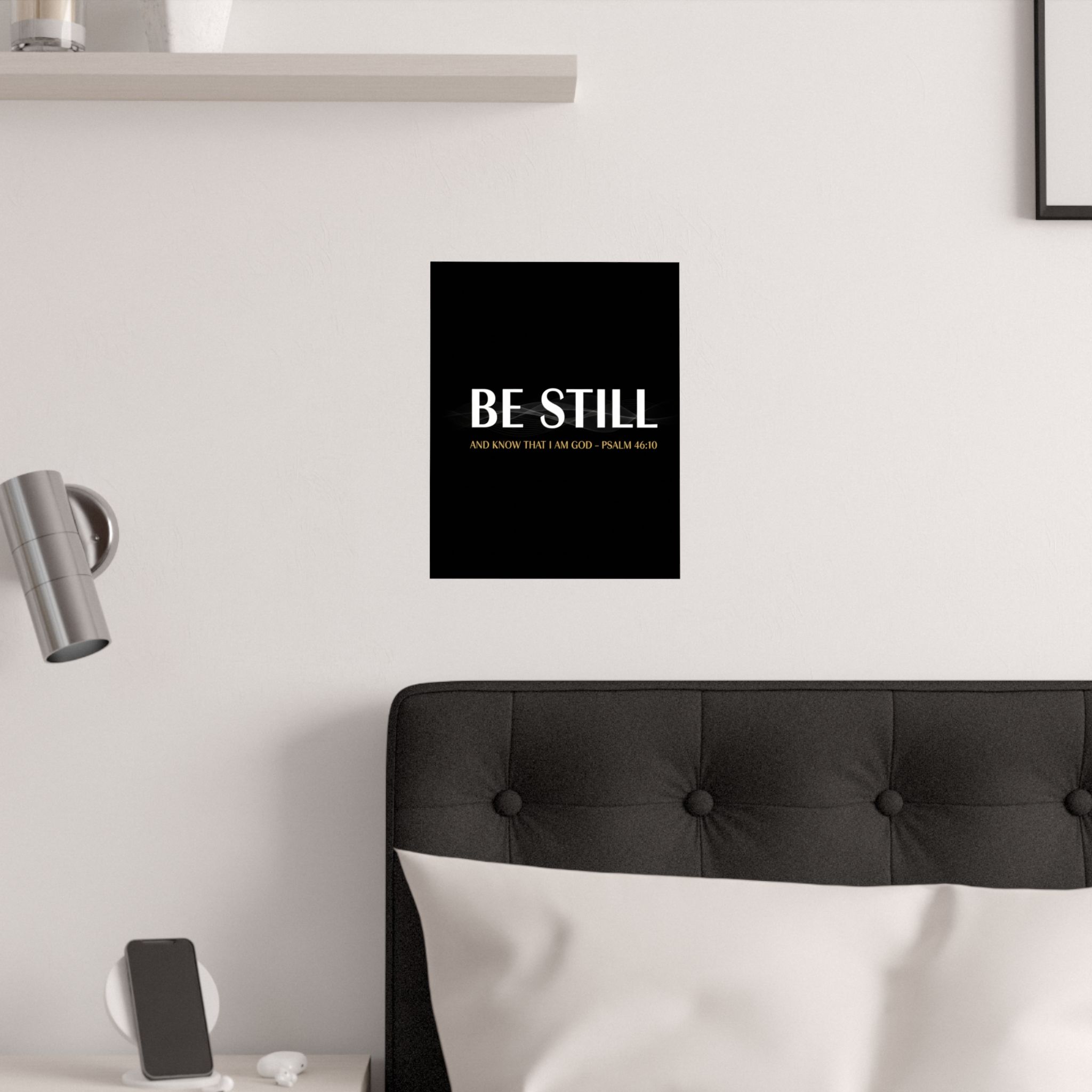 A calming, minimalist satin poster that brings a quiet, reverent moment into any room. Bold white type “BE STILL” sits against deep black with a subtle, smoky texture beneath, and a warm gold line of scripture—“AND KNOW THAT I AM GOD – PSALM 46:10”—that catches the eye without shouting. The low-glare satin finish and museum-grade paper give the piece a polished, archival feel that holds rich blacks and crisp lettering. Hang it above a bedside table, in a reading nook, or near a prayer corner to create a space for pause, reflection, and steadying breath.