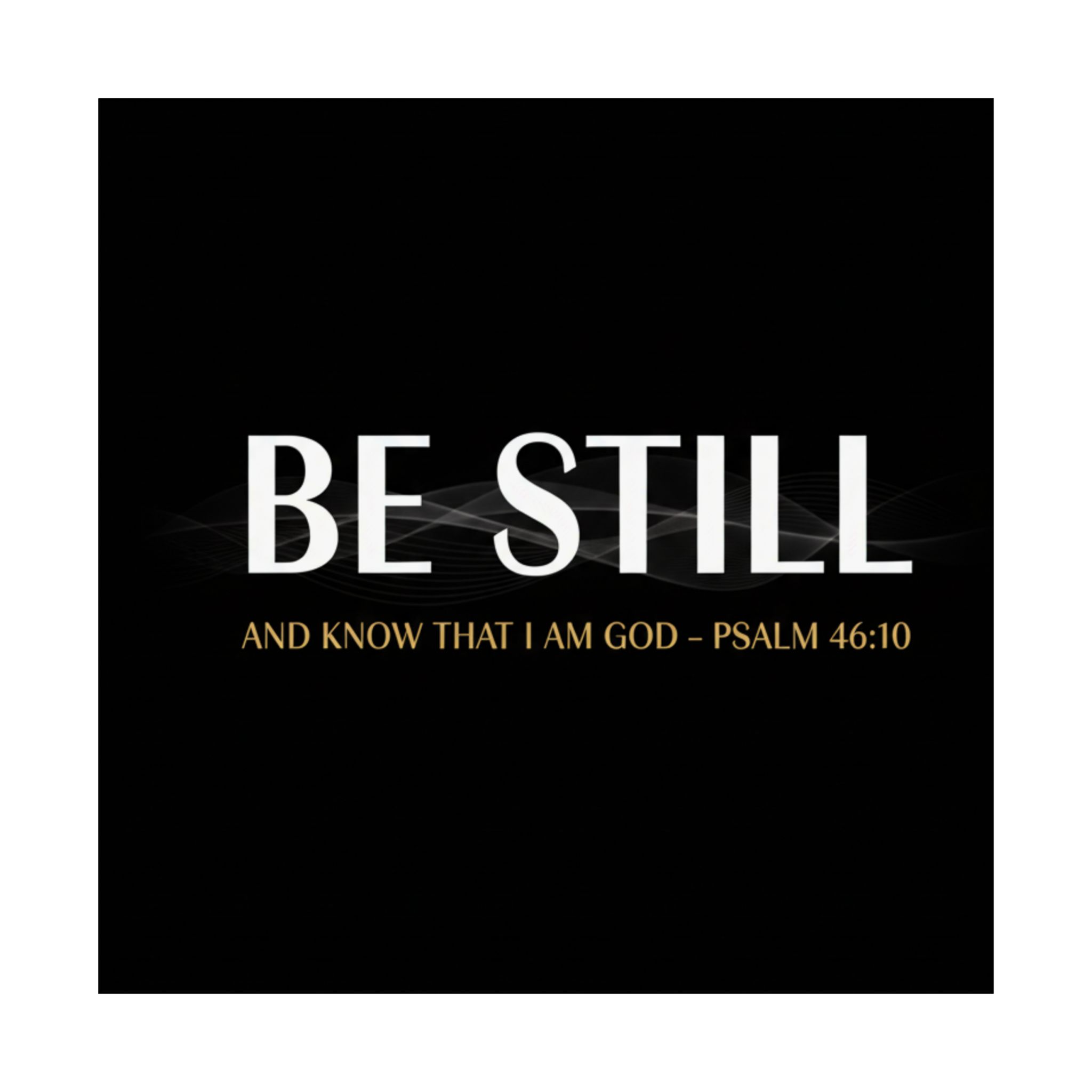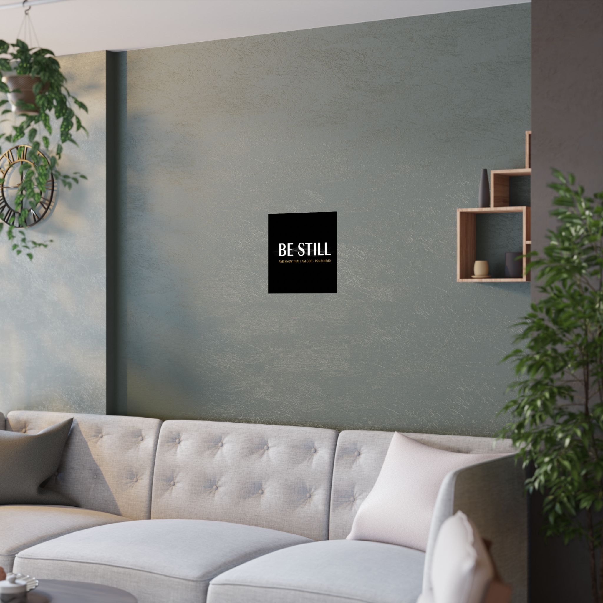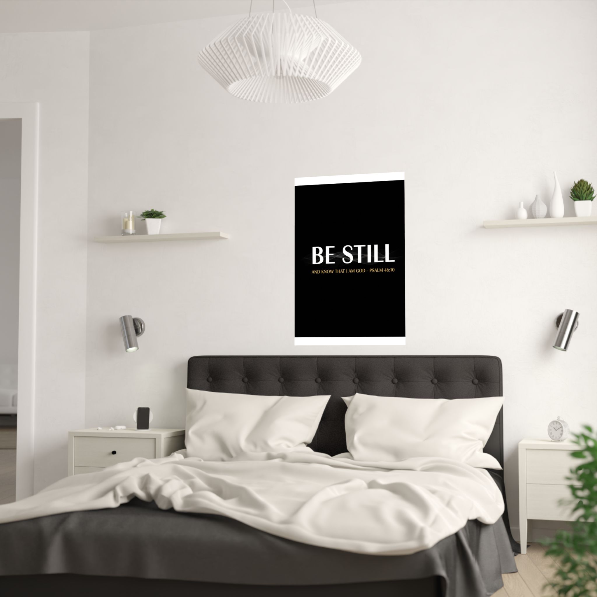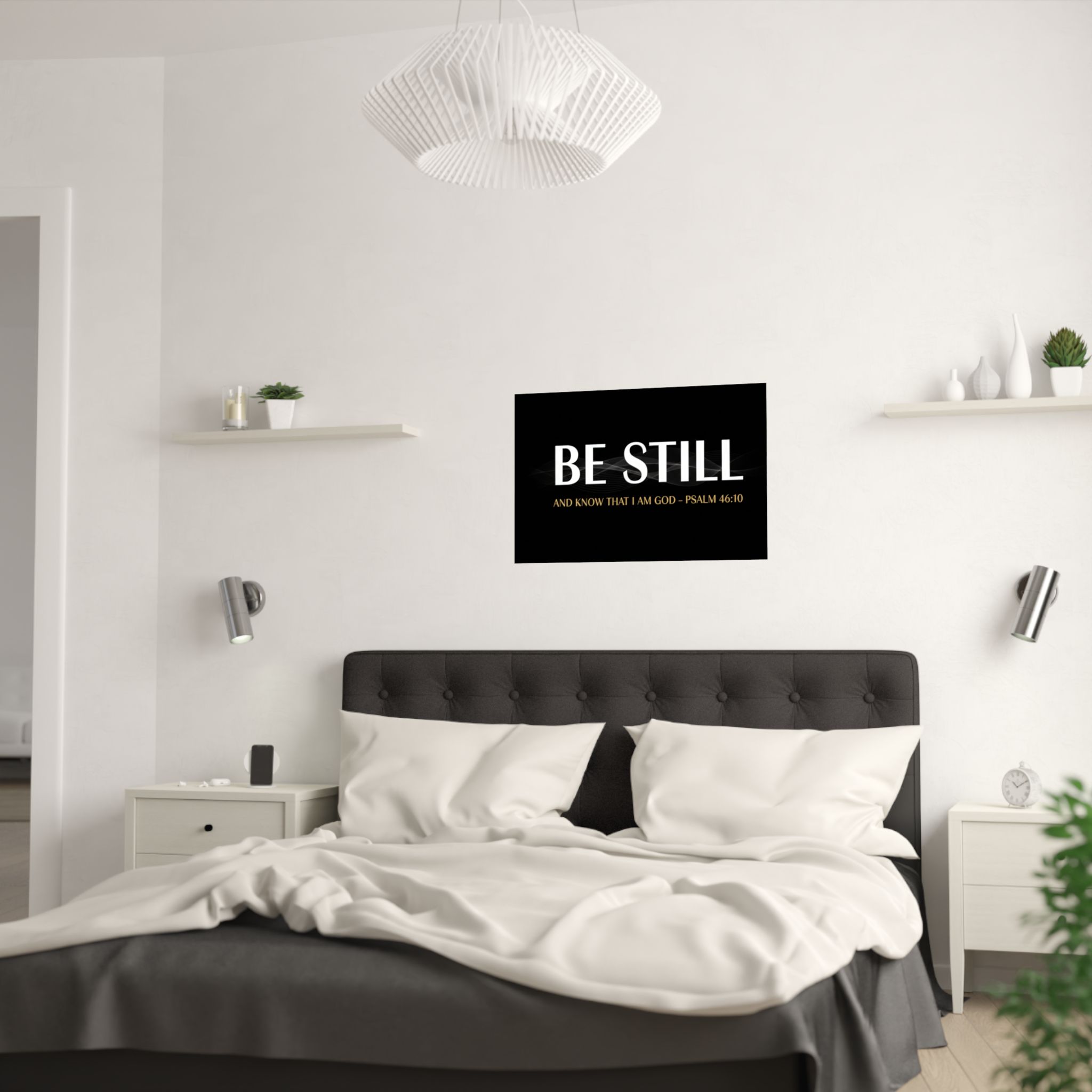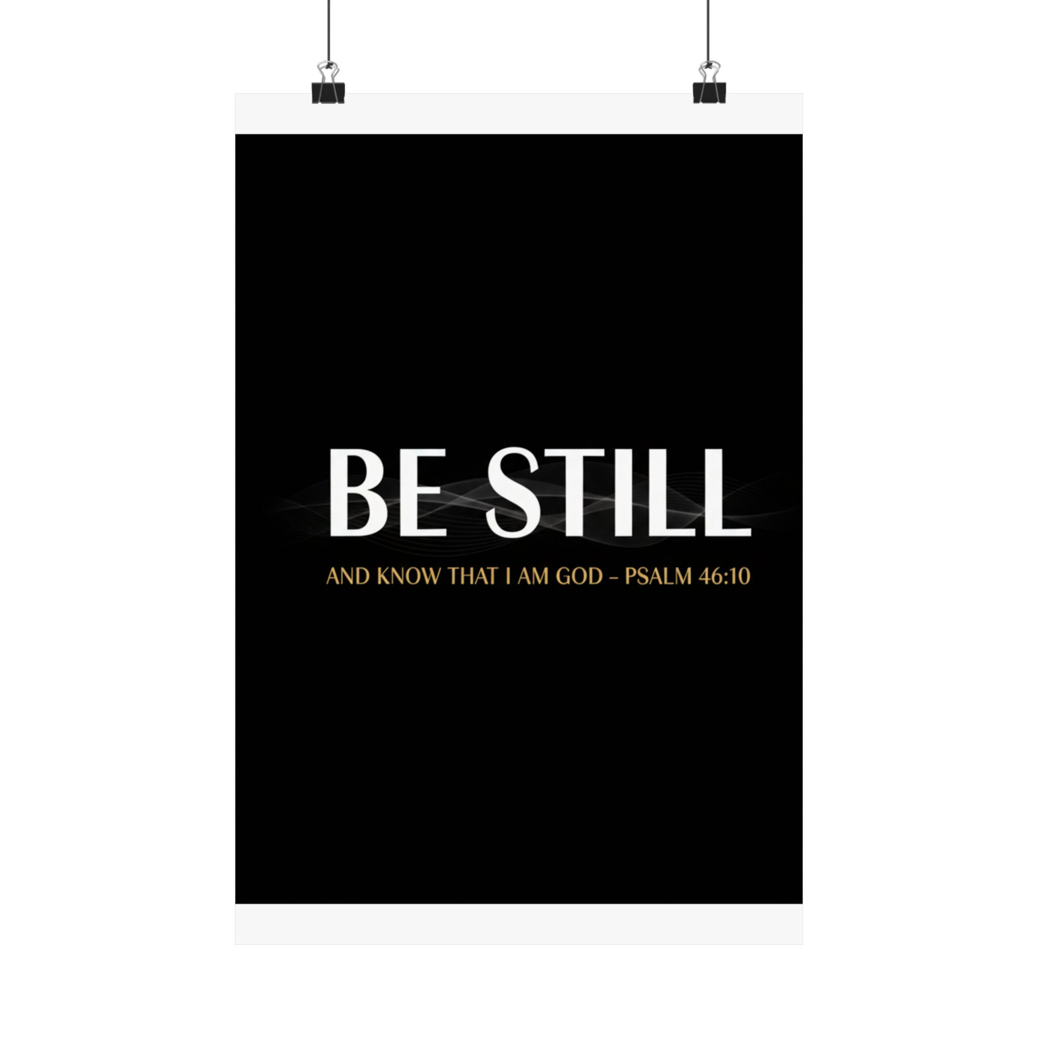 A calming, minimalist satin poster that brings a quiet, reverent moment into any room. Bold white type “BE STILL” sits against deep black with a subtle, smoky texture beneath, and a warm gold line of scripture—“AND KNOW THAT I AM GOD – PSALM 46:10”—that catches the eye without shouting. The low-glare satin finish and museum-grade paper give the piece a polished, archival feel that holds rich blacks and crisp lettering. Hang it above a bedside table, in a reading nook, or near a prayer corner to create a space for pause, reflection, and steadying breath.