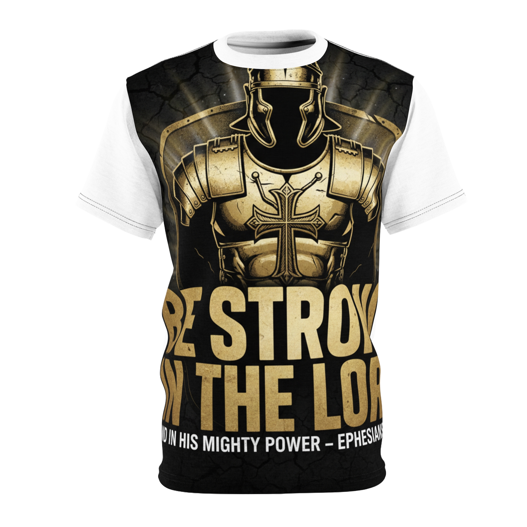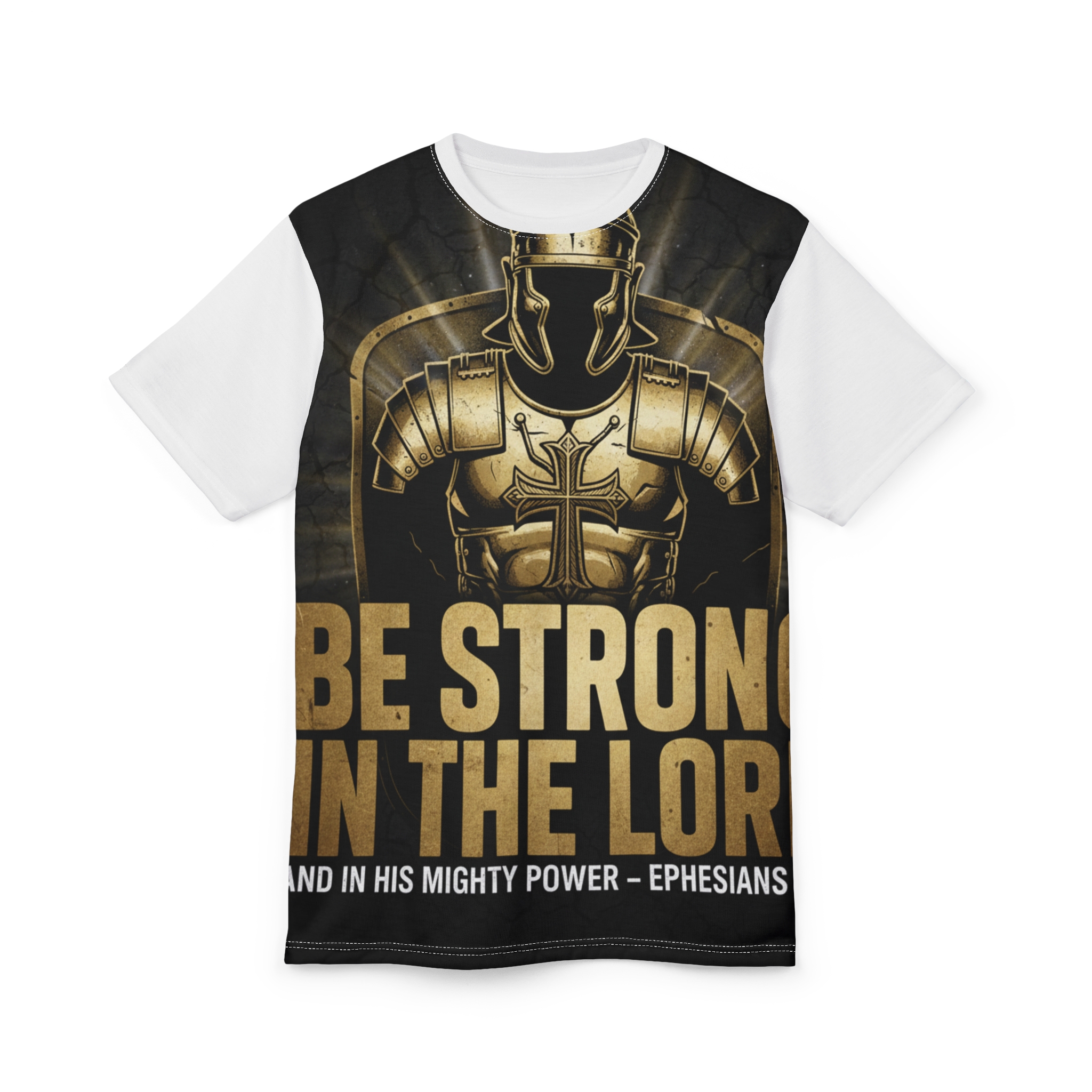 This all-over print tee channels quiet strength and steady faith. A bold, gold-armored knight stands at the center, chest marked with a cross and framed by the words “Be Strong in the Lord” and a scripture reference beneath — a visual reminder to stand firm. Lightweight polyester keeps the print vivid and the shape crisp, while the regular fit and tagless design make it comfortable for everyday wear. Wear it when you want your convictions to show without saying a word: layered under a jacket for weekday errands, worn alone at community gatherings, or taken to prayer meetups and church events where a simple, strong message resonates.