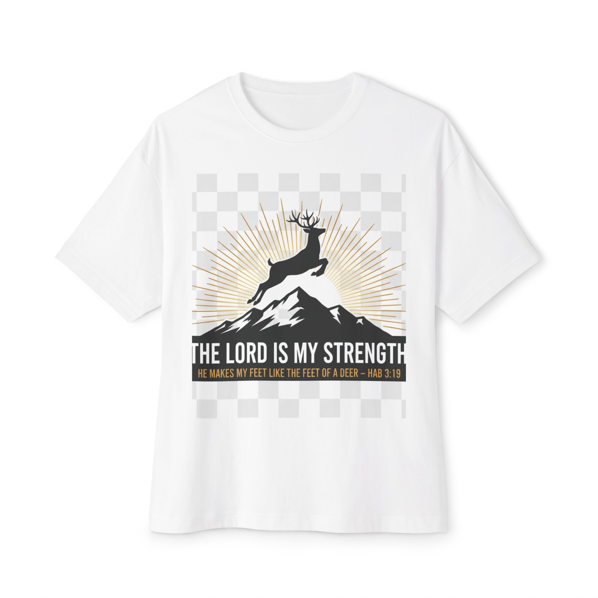 This oversized boxy tee carries a quiet confidence — sturdy cotton, relaxed drop-shoulder silhouette, and a bold outdoors-faith graphic that reads like a personal emblem. The artwork layers a majestic stag leaping above a mountain peak with radiant sunbeams, and a scripture band beneath that anchors the image. Lightweight but substantial, it drapes with an easy, lived-in feel and wears well over jeans or layered under a jacket. It’s the kind of shirt you reach for when you want your faith and love of the wild to show without shouting. Soft to the touch, built to last, and designed to move with you on morning hikes, small group meetups, or quiet moments of reflection by the trail.