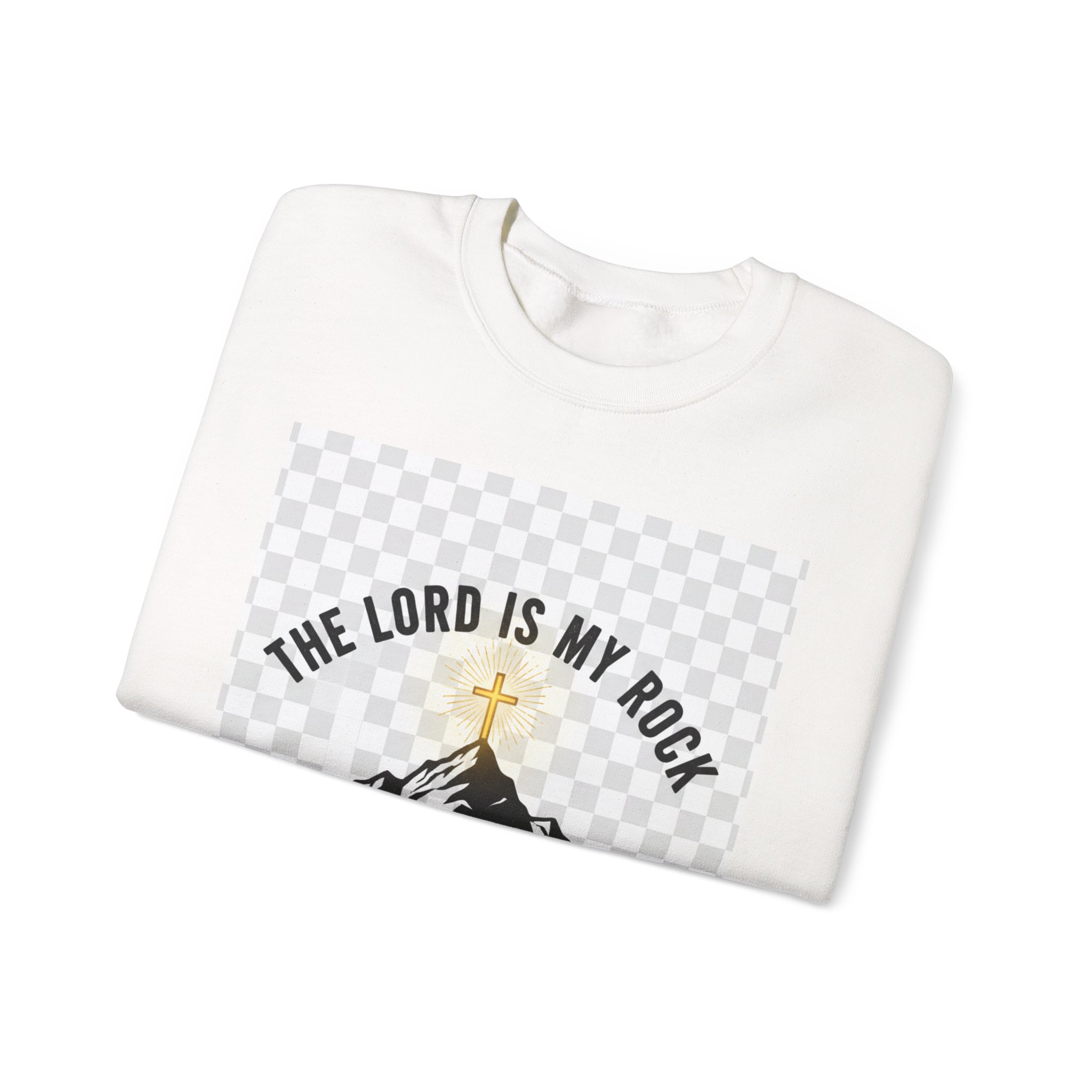 A soft, midweight crewneck sweatshirt with a quiet, faith-forward graphic that reads “The Lord Is My Rock” above a mountain topped by a glowing cross. The white sweatshirt keeps the design clean and visible, while the ribbed collar and cuffs hold shape through repeated wear. Wear it on cool mornings heading to church, for evening Bible study, or any day you want a subtle reminder of strength and shelter. The fit is classic and relaxed, so it layers easily over shirts or under jackets and feels familiar from the first wear. Thoughtful construction — tubular knit, double-needle stitching, and OEKO‑TEX dyes — makes this a dependable piece that balances comfort, durability, and responsibly sourced materials.