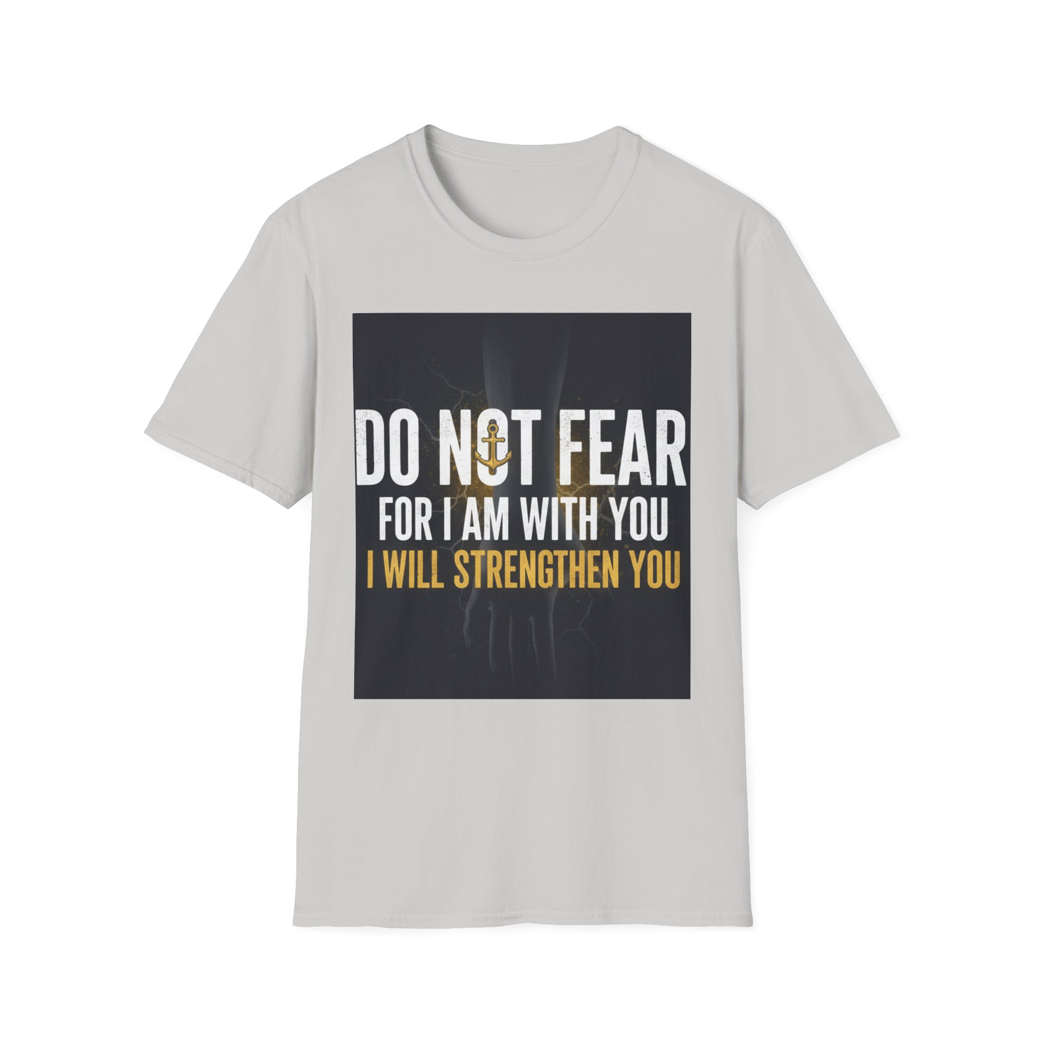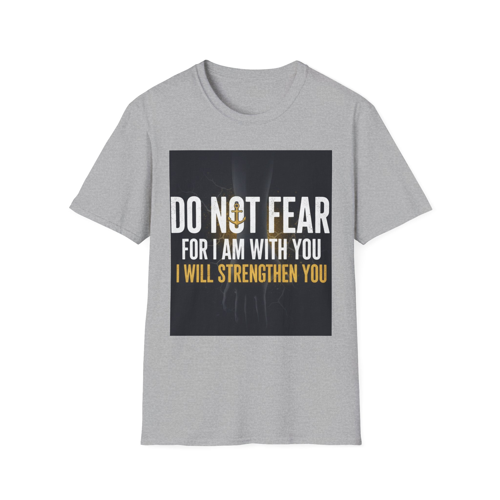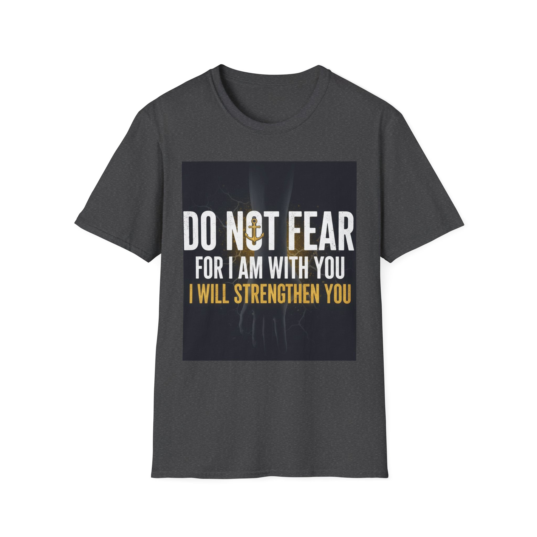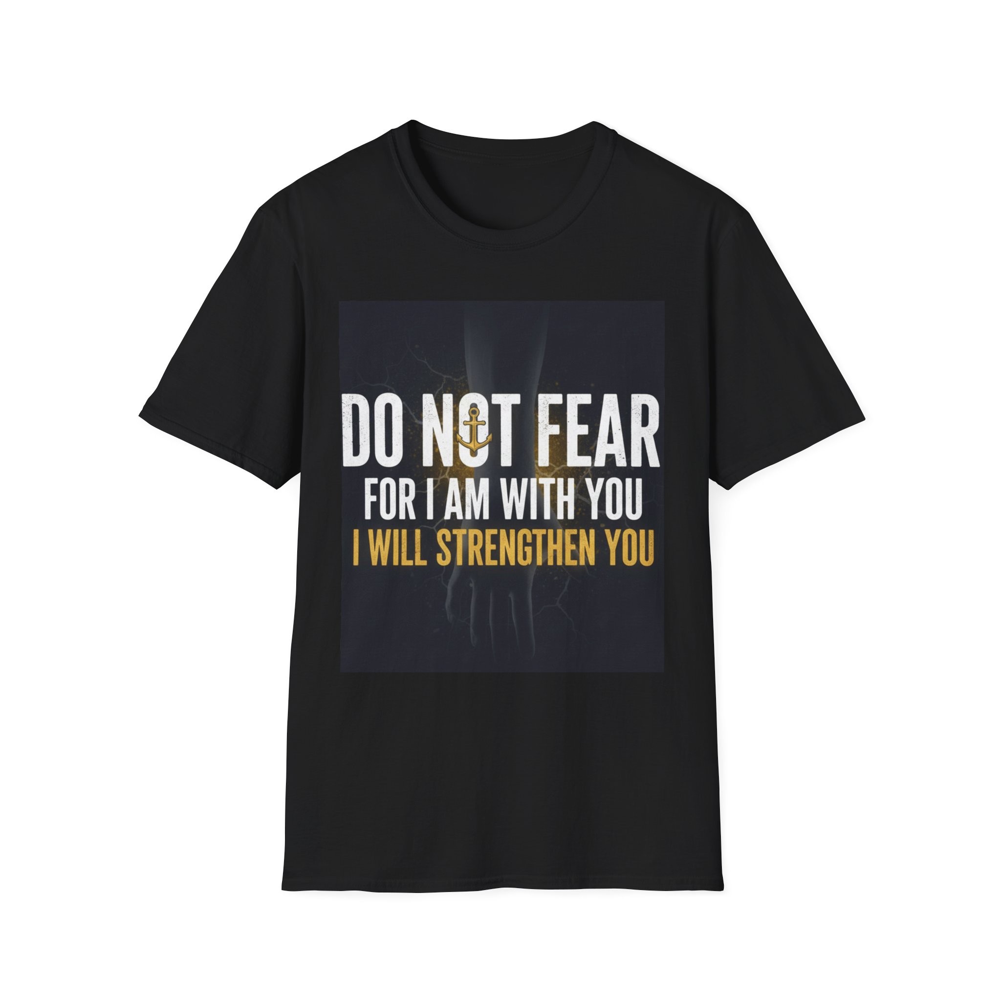 A soft, everyday tee that carries a quiet, courageous message. The shirt’s front print reads “DO NOT FEAR / FOR I AM WITH YOU / I WILL STRENGTHEN YOU” set against a subtle, dark background and a faint light burst—a design that feels both reassuring and steady. The lightweight ring-spun cotton drapes comfortably and keeps the print crisp, making this shirt a wearable reminder to face hard days with calm resolve. Wear it to small gatherings, church nights, volunteer shifts, or simply when you need a steadying word. The classic crew cut and clean silhouette make it easy to layer under jackets or pair with jeans, while the understated black keeps the focus on the message.