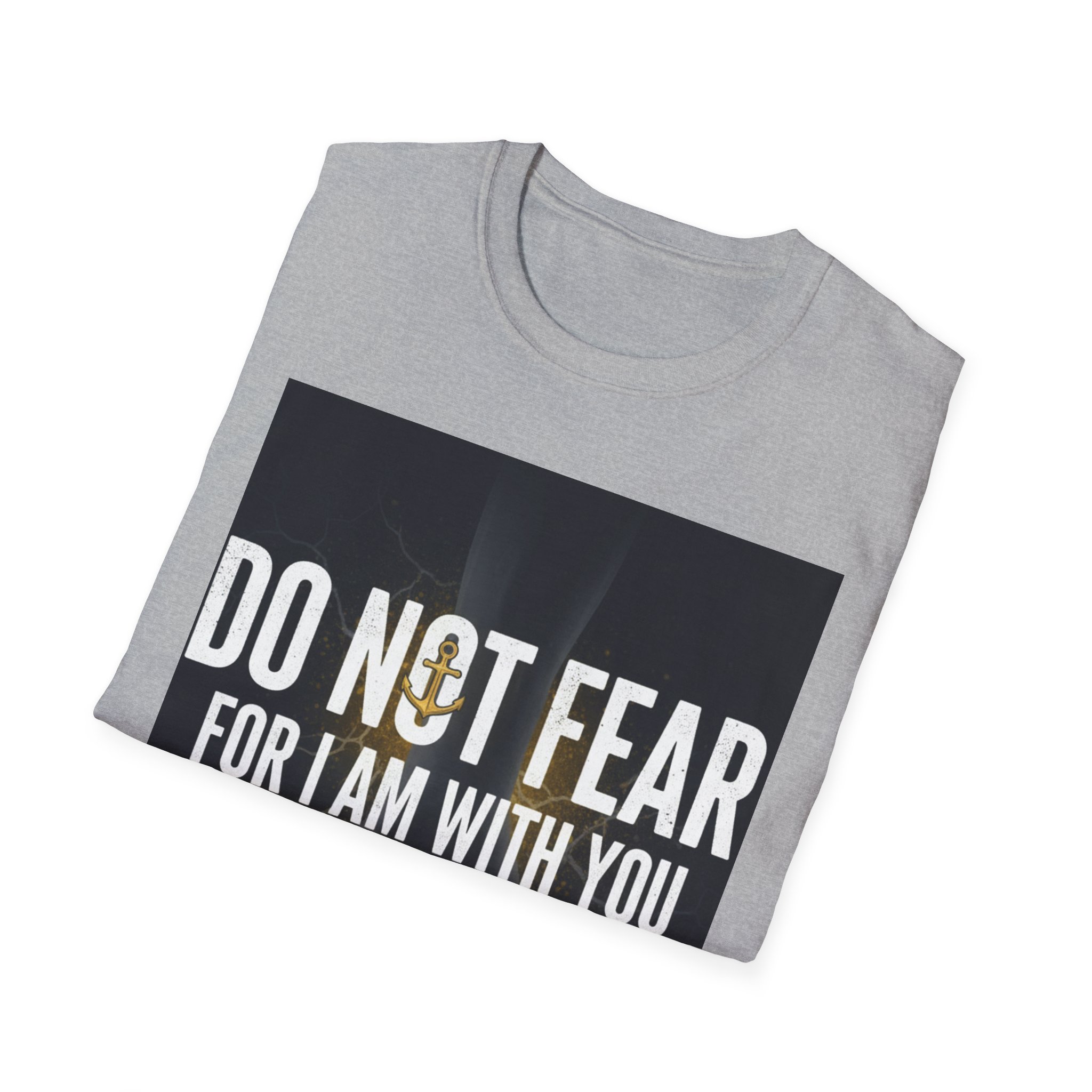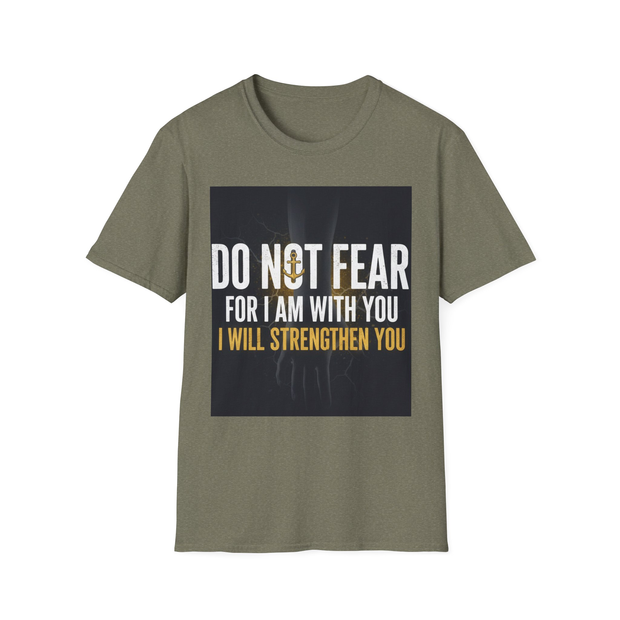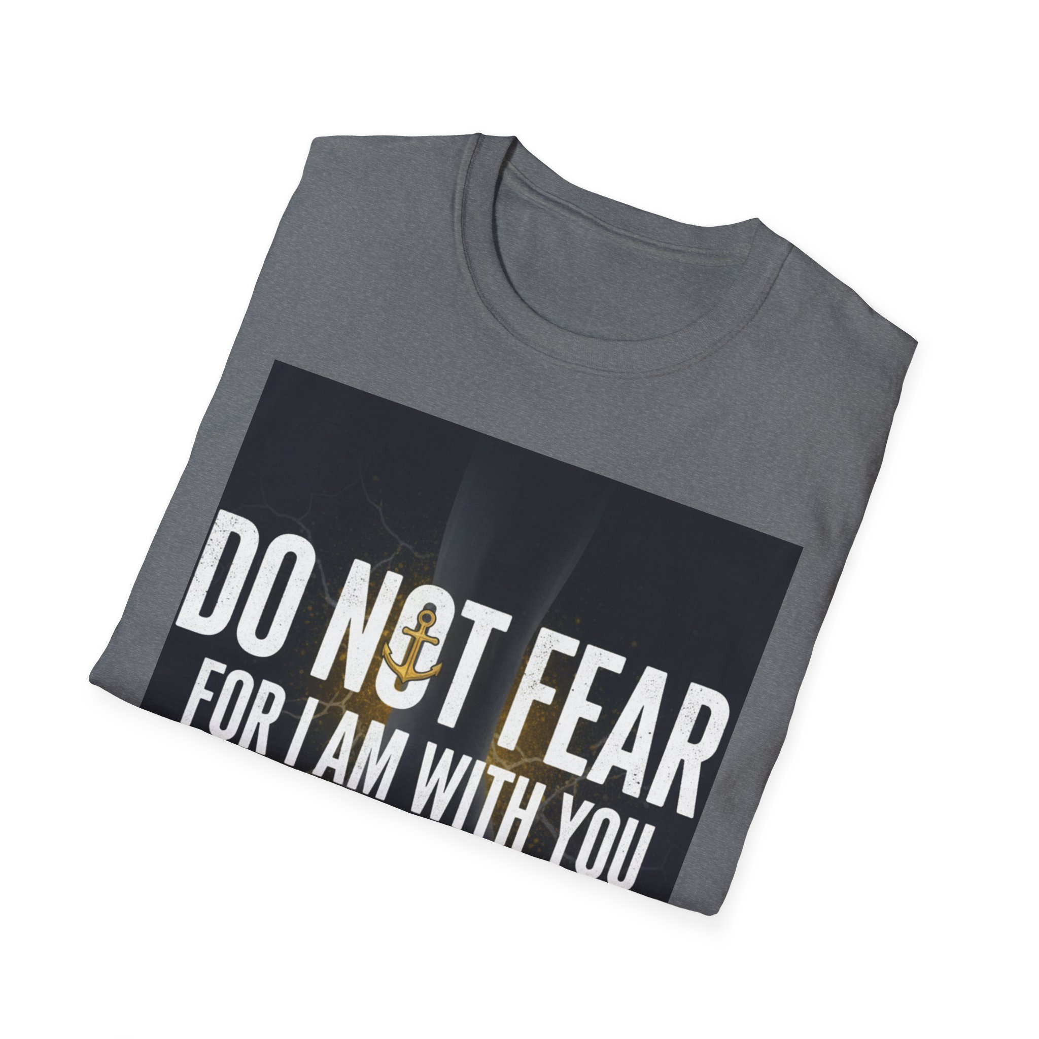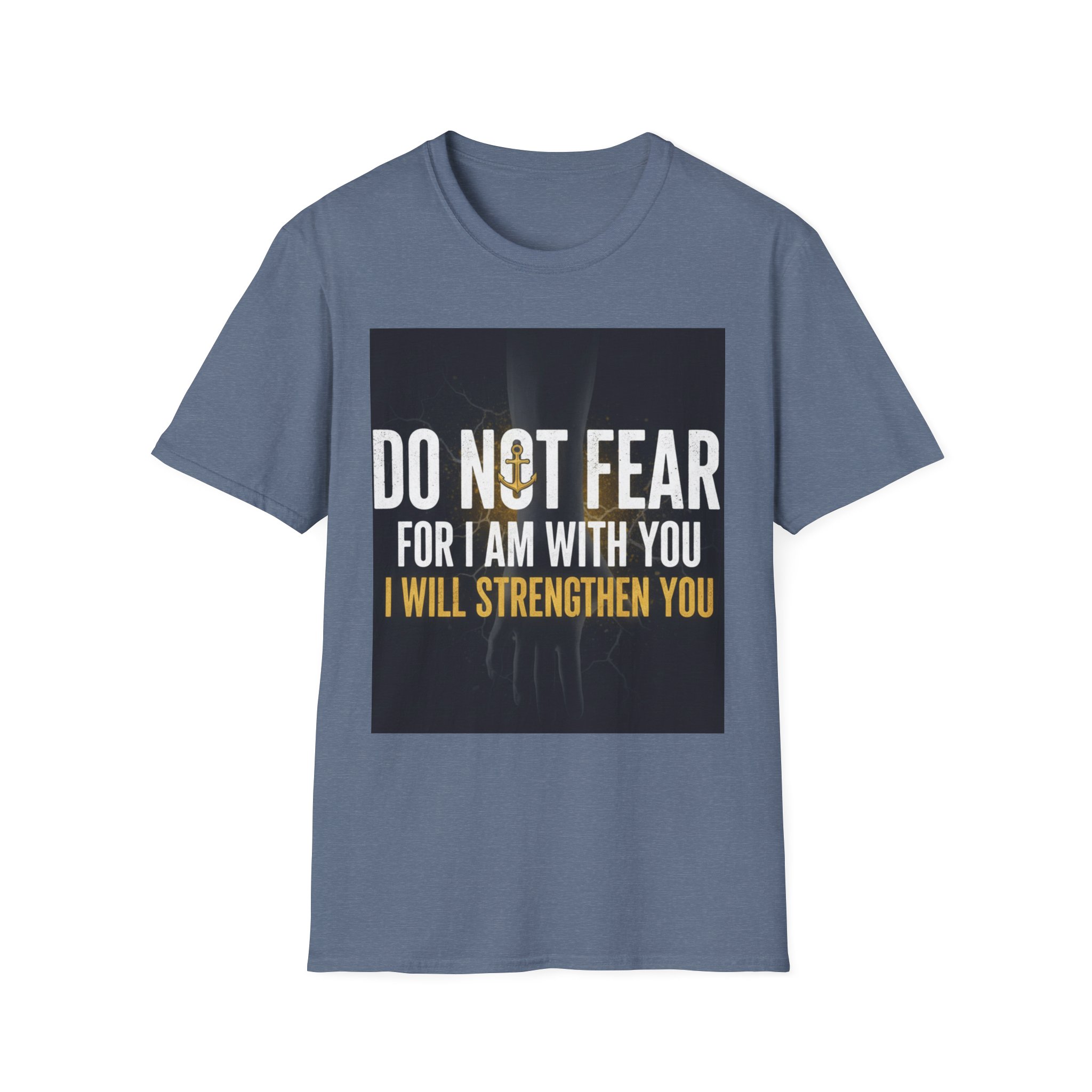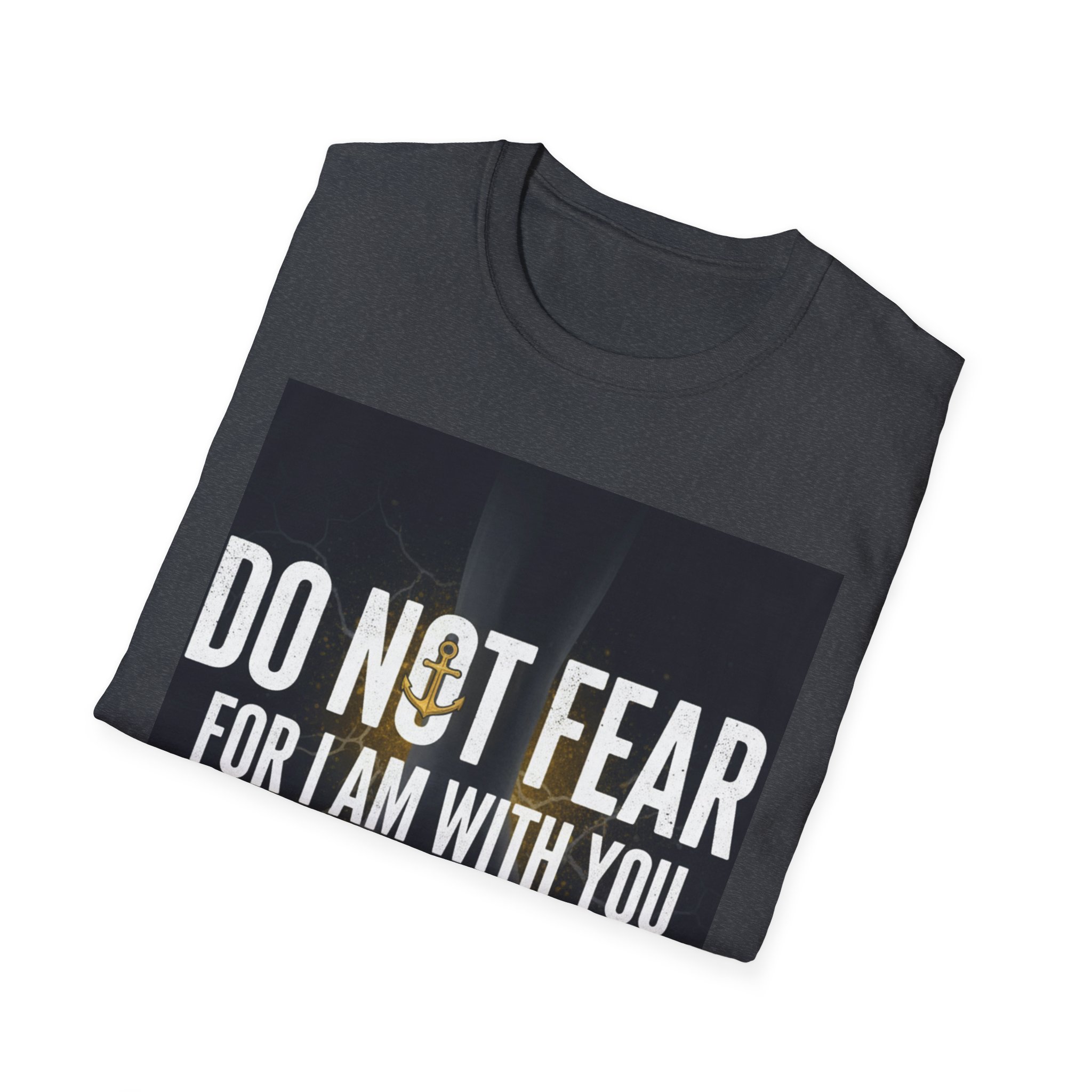 A soft, everyday tee that carries a quiet, courageous message. The shirt’s front print reads “DO NOT FEAR / FOR I AM WITH YOU / I WILL STRENGTHEN YOU” set against a subtle, dark background and a faint light burst—a design that feels both reassuring and steady. The lightweight ring-spun cotton drapes comfortably and keeps the print crisp, making this shirt a wearable reminder to face hard days with calm resolve. Wear it to small gatherings, church nights, volunteer shifts, or simply when you need a steadying word. The classic crew cut and clean silhouette make it easy to layer under jackets or pair with jeans, while the understated black keeps the focus on the message.