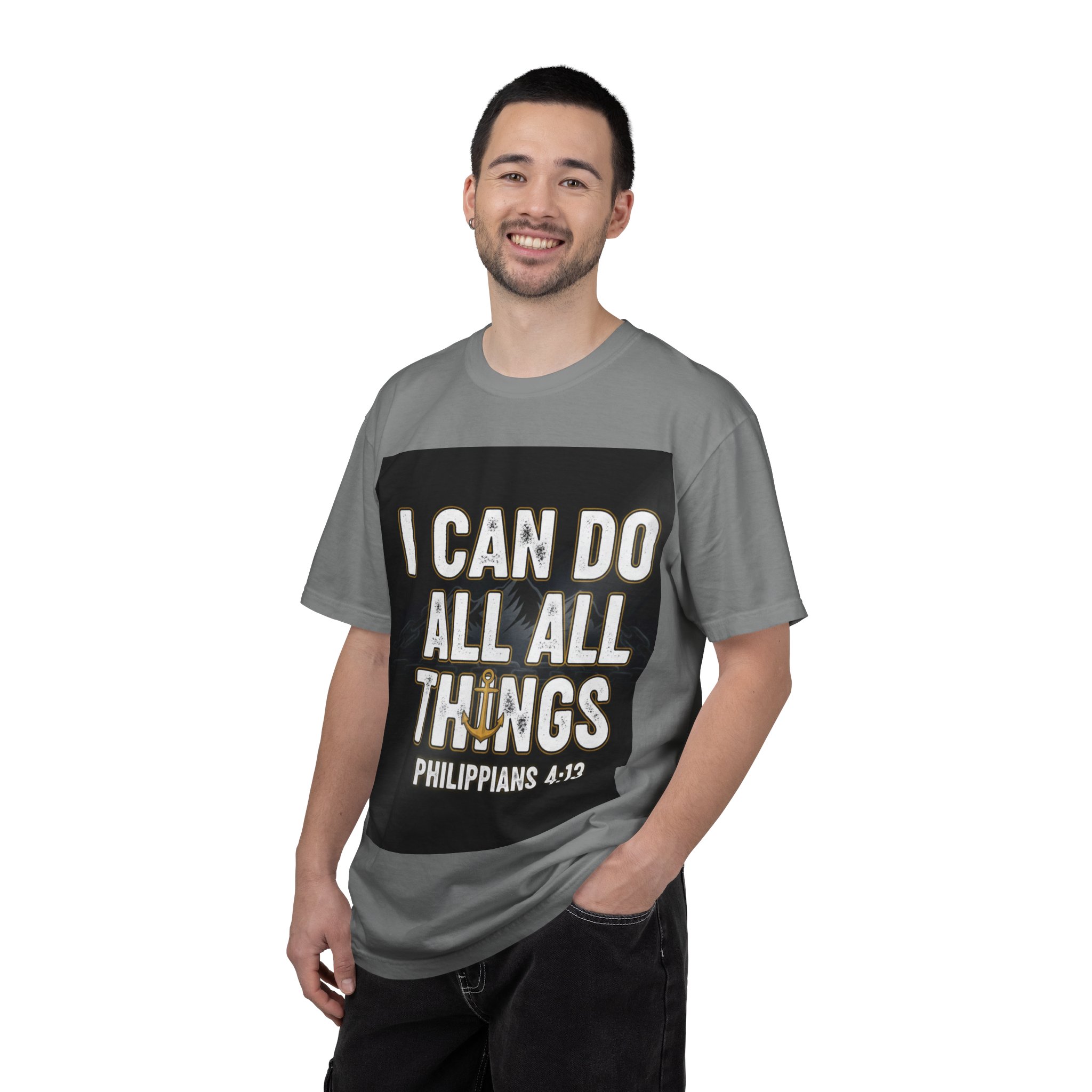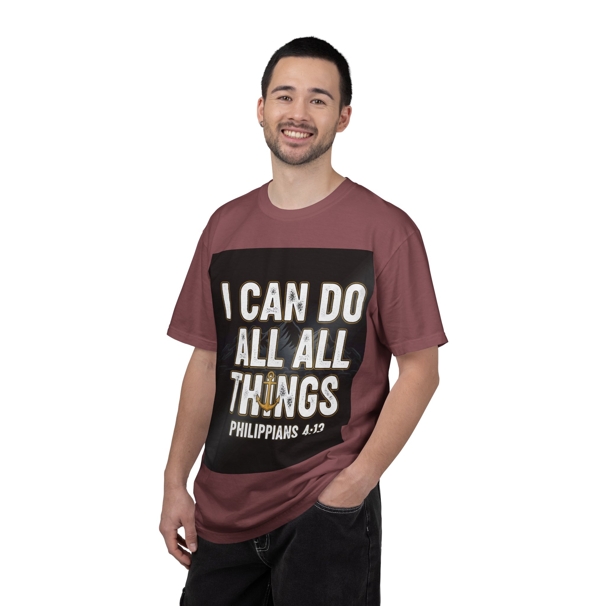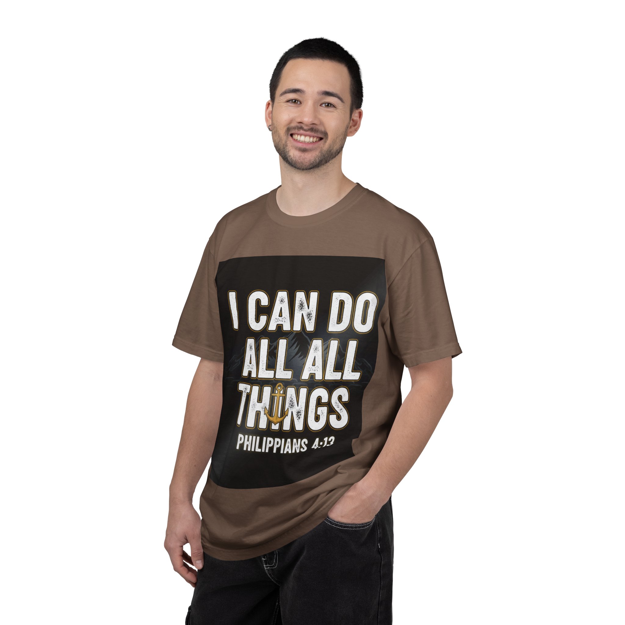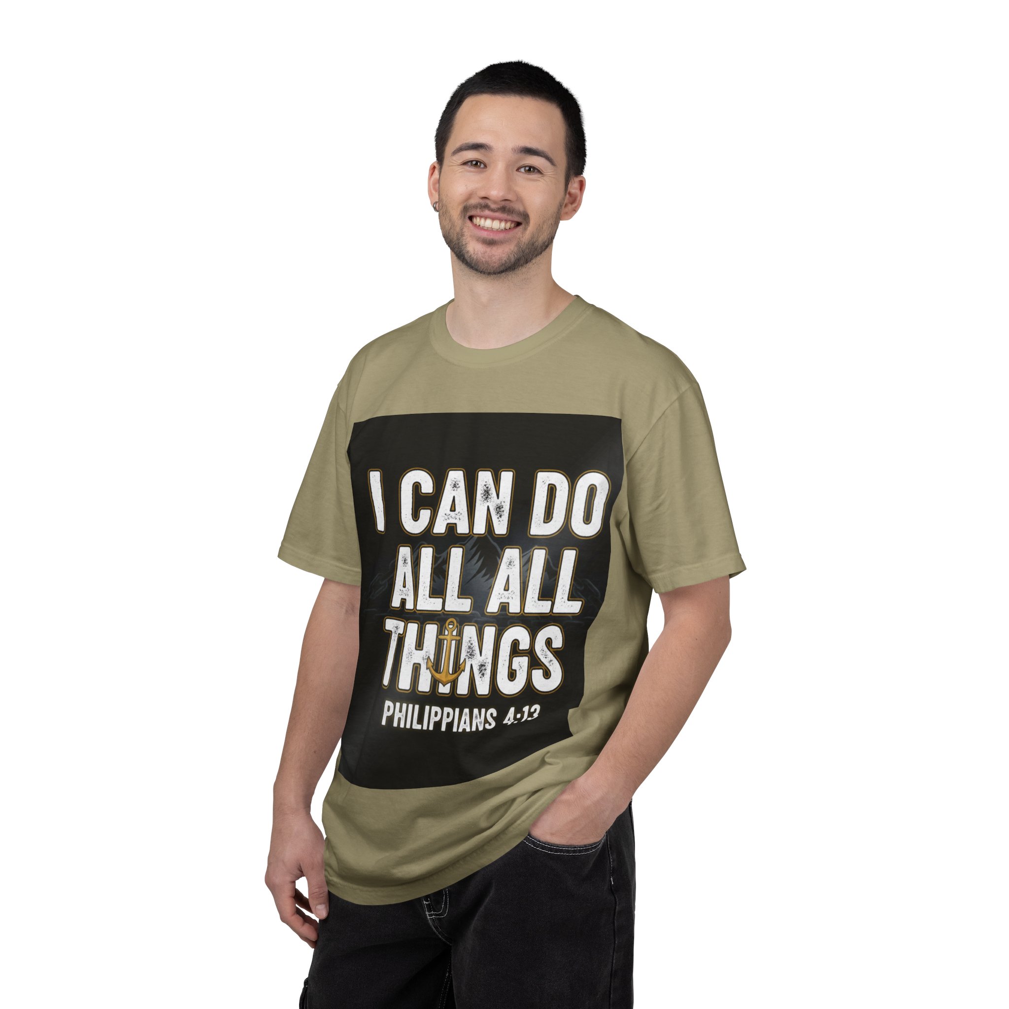 This relaxed, garment-dyed tee carries a bold, faith-forward message with warm, lived-in color and a soft hand. The centered print reads “I CAN DO ALL THINGS – Philippians 4:13” set against a dark square backdrop, creating a poster-like focal point that feels both confident and contemplative. The heavyweight, ring-spun cotton drapes comfortably and holds its shape; the garment-dye gives each shirt a slightly broken-in look that deepens with wear. Wear it to church gatherings, volunteer days, or quiet mornings with coffee — it’s the kind of shirt that announces faith without fanfare and wears like a memory in the best way.