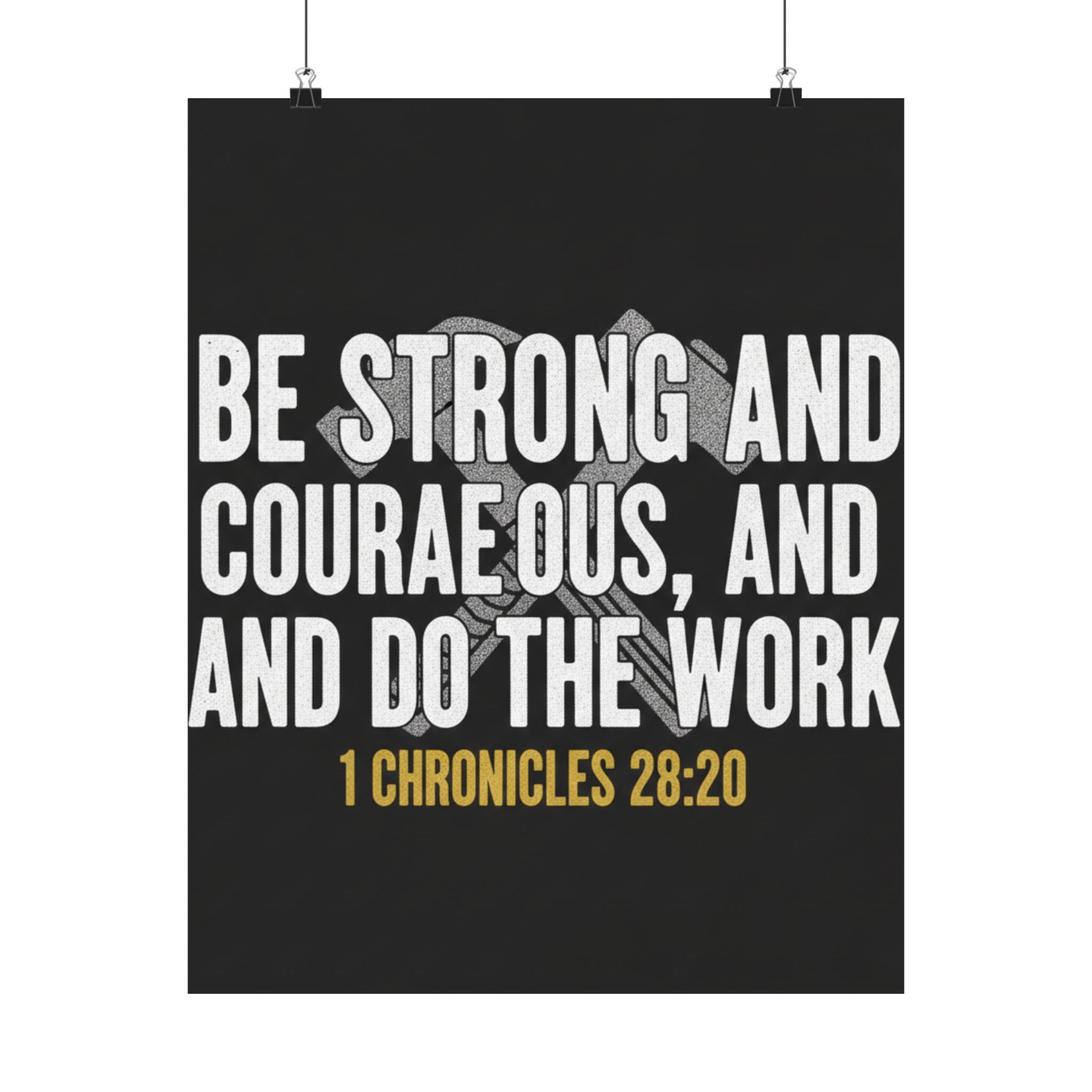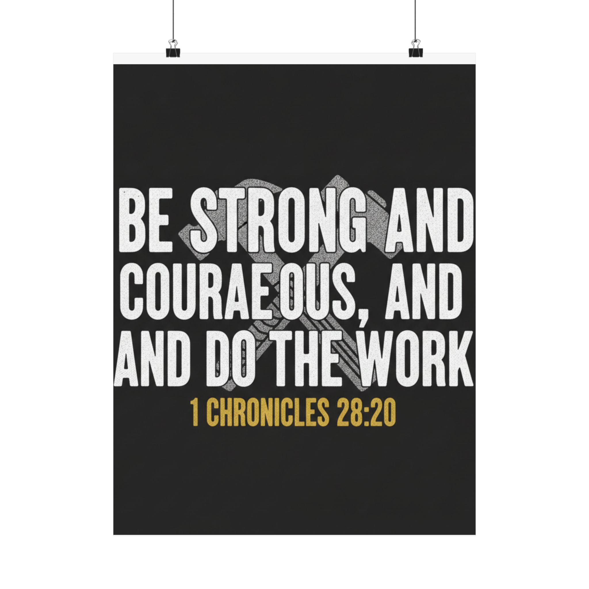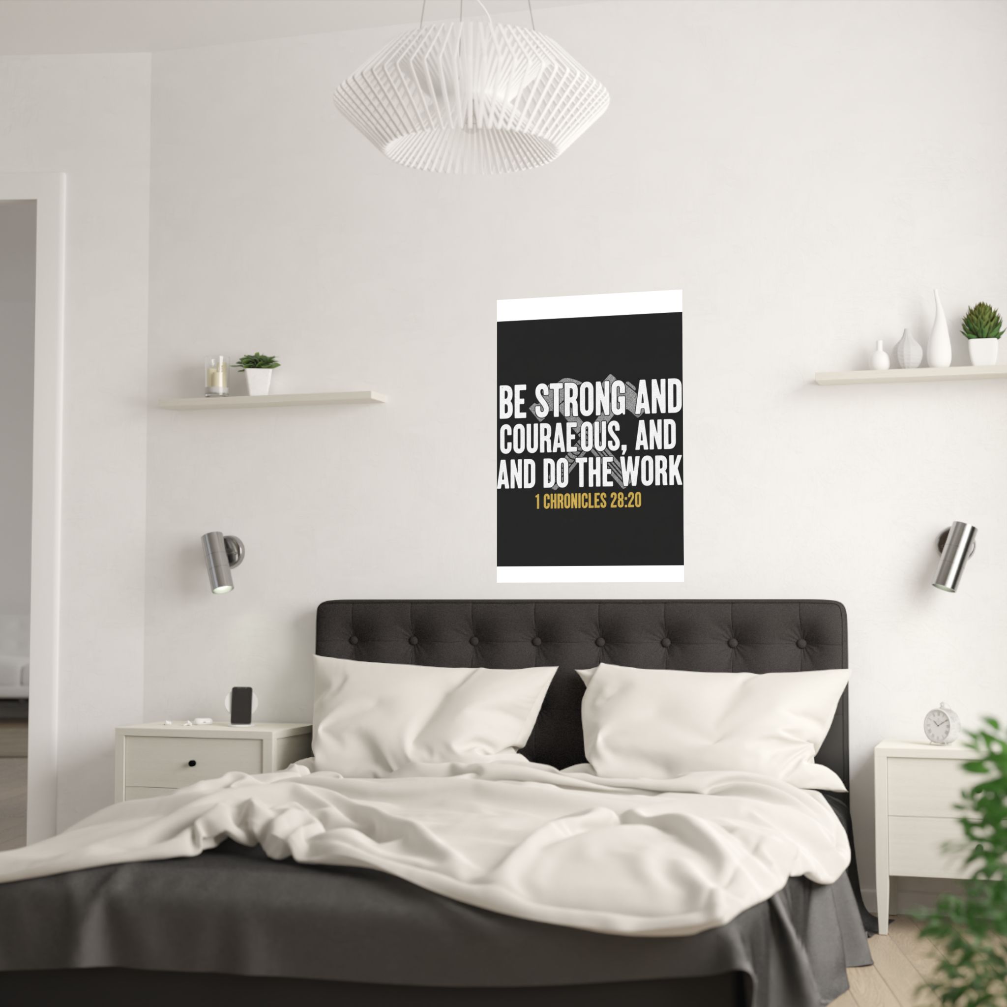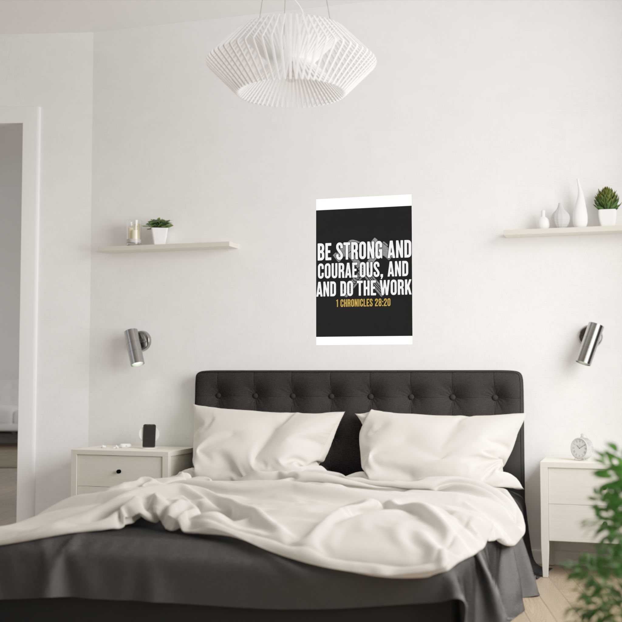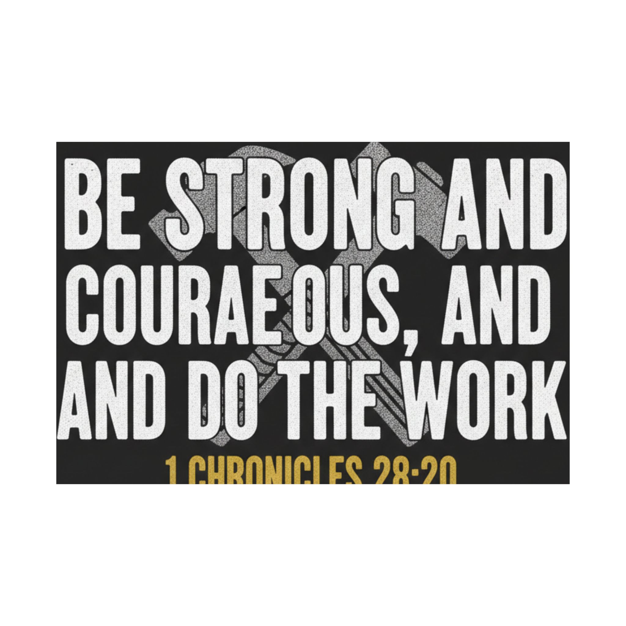 A bold, satin-finish poster that speaks straight to the steady, faithful heart. Thick museum-grade paper and pigment-rich inks bring the white-and-gold typography to life against the deep charcoal background. The design frames a short, powerful scripture—1 Chronicles 28:20—so the message reads clearly from across a room. Hang it in a home office, entryway, church nook, or workshop to anchor a space with quiet resolve and steady encouragement. The low-glare satin surface keeps contrast sharp without harsh reflection, and multiple orientation and size options let you place this statement where it will steady you or someone you love during seasons of decision and duty.