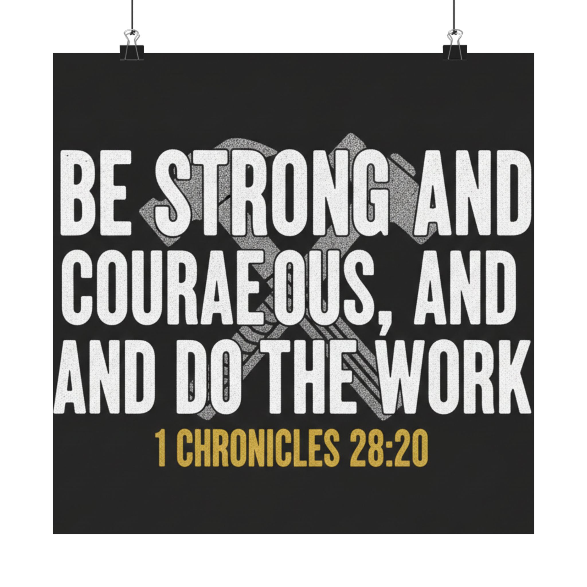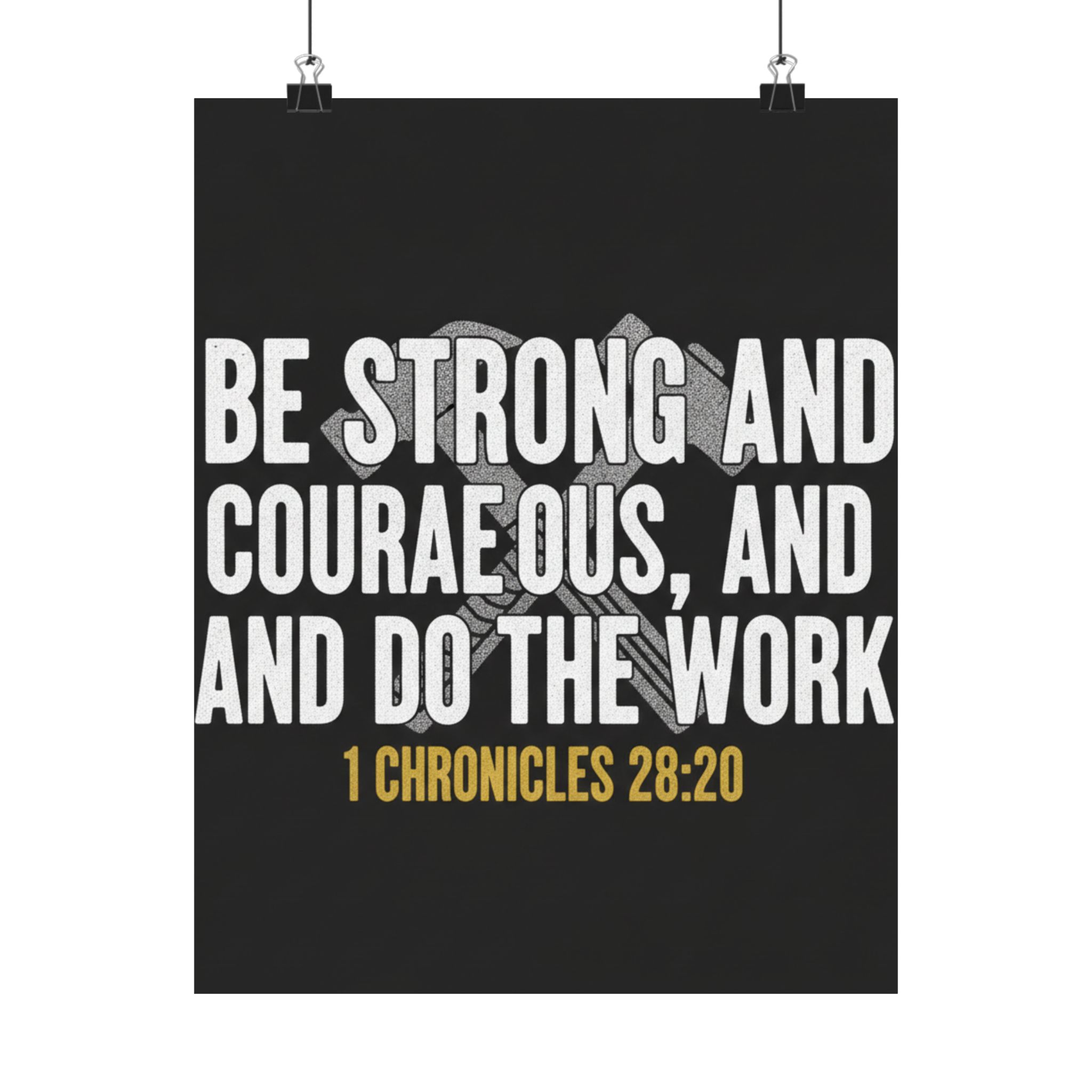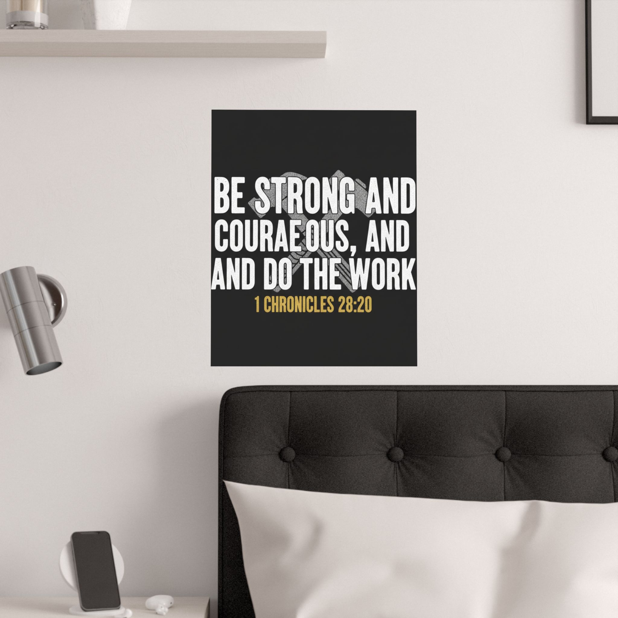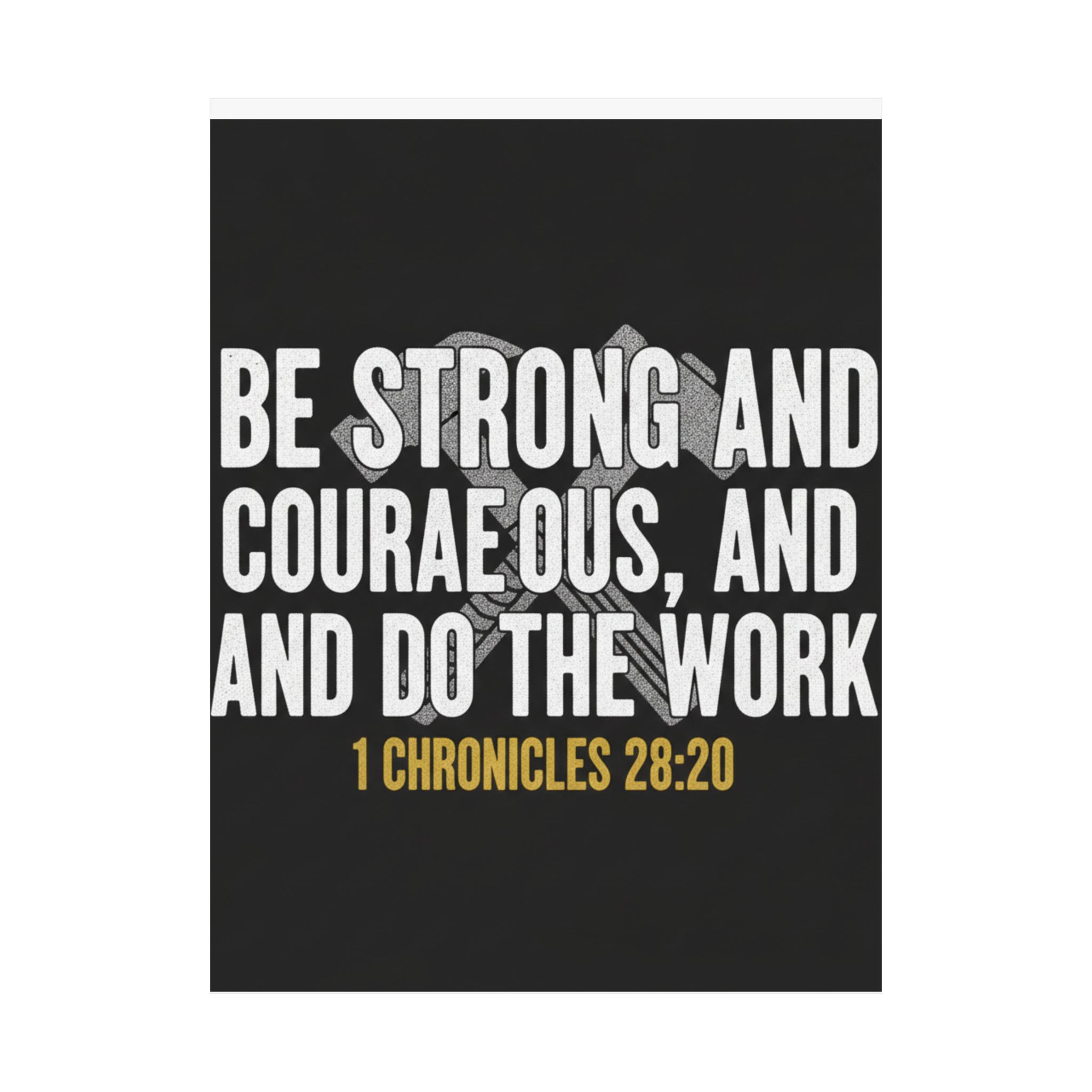 A bold, satin-finish poster that speaks straight to the steady, faithful heart. Thick museum-grade paper and pigment-rich inks bring the white-and-gold typography to life against the deep charcoal background. The design frames a short, powerful scripture—1 Chronicles 28:20—so the message reads clearly from across a room. Hang it in a home office, entryway, church nook, or workshop to anchor a space with quiet resolve and steady encouragement. The low-glare satin surface keeps contrast sharp without harsh reflection, and multiple orientation and size options let you place this statement where it will steady you or someone you love during seasons of decision and duty.