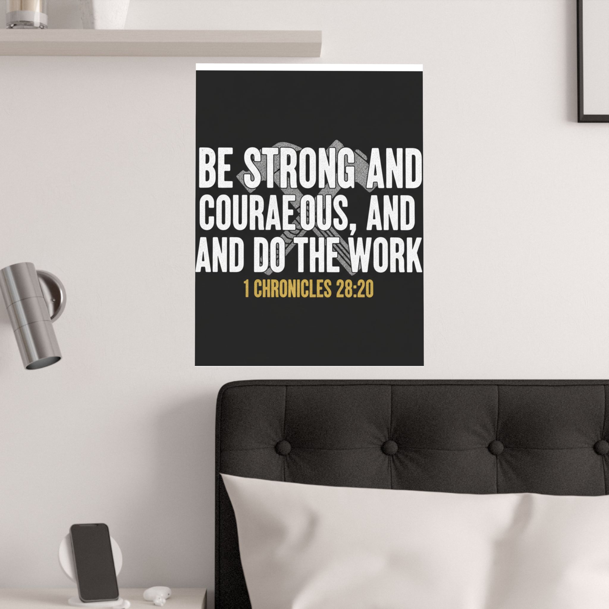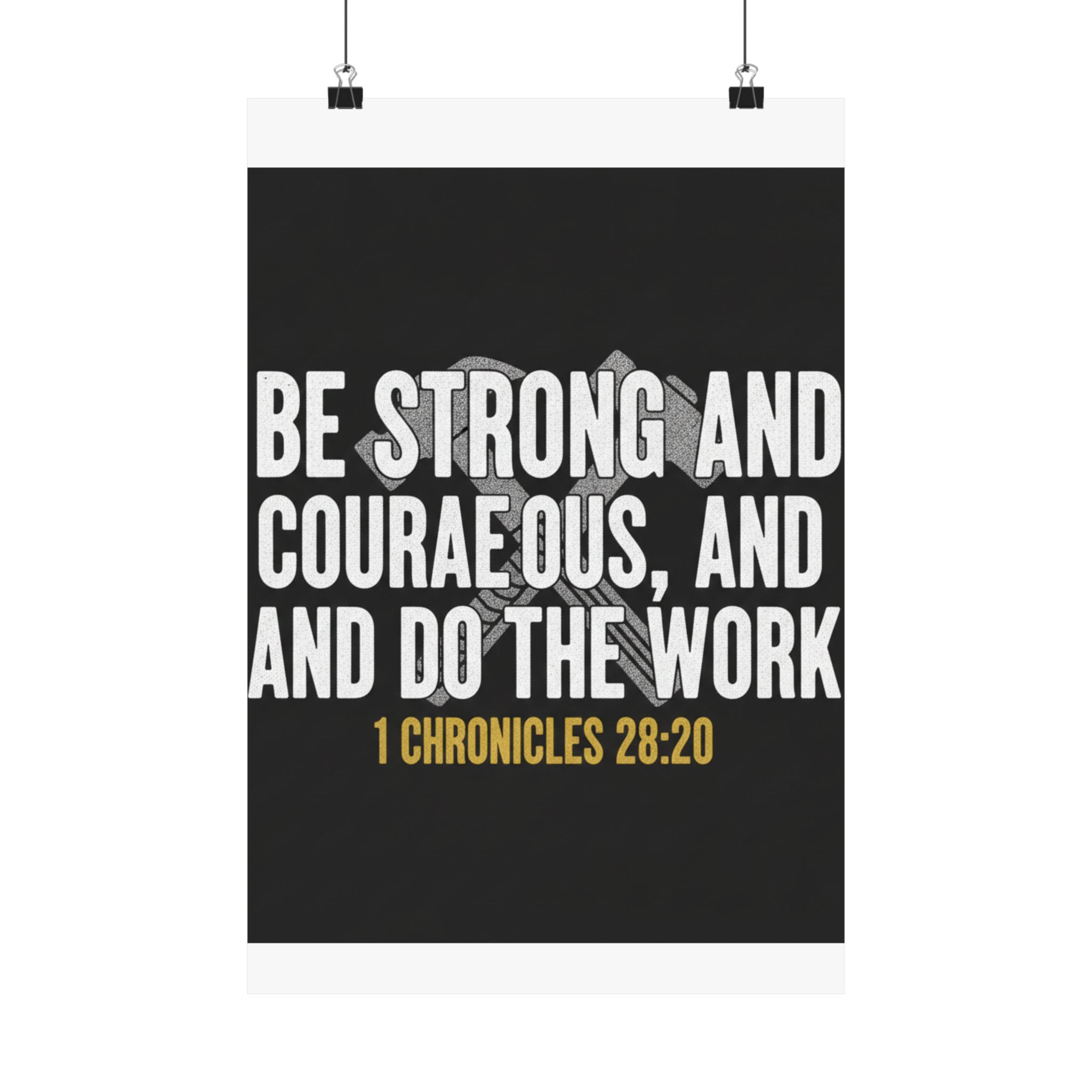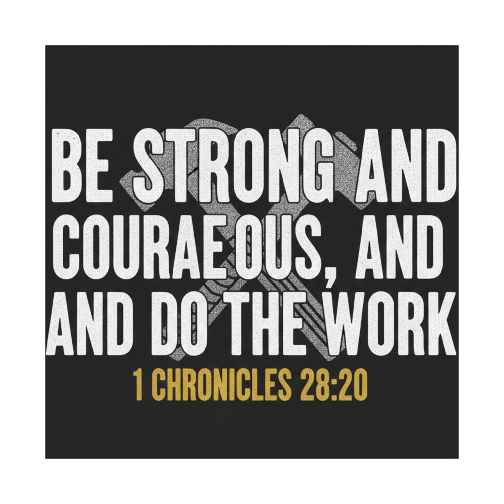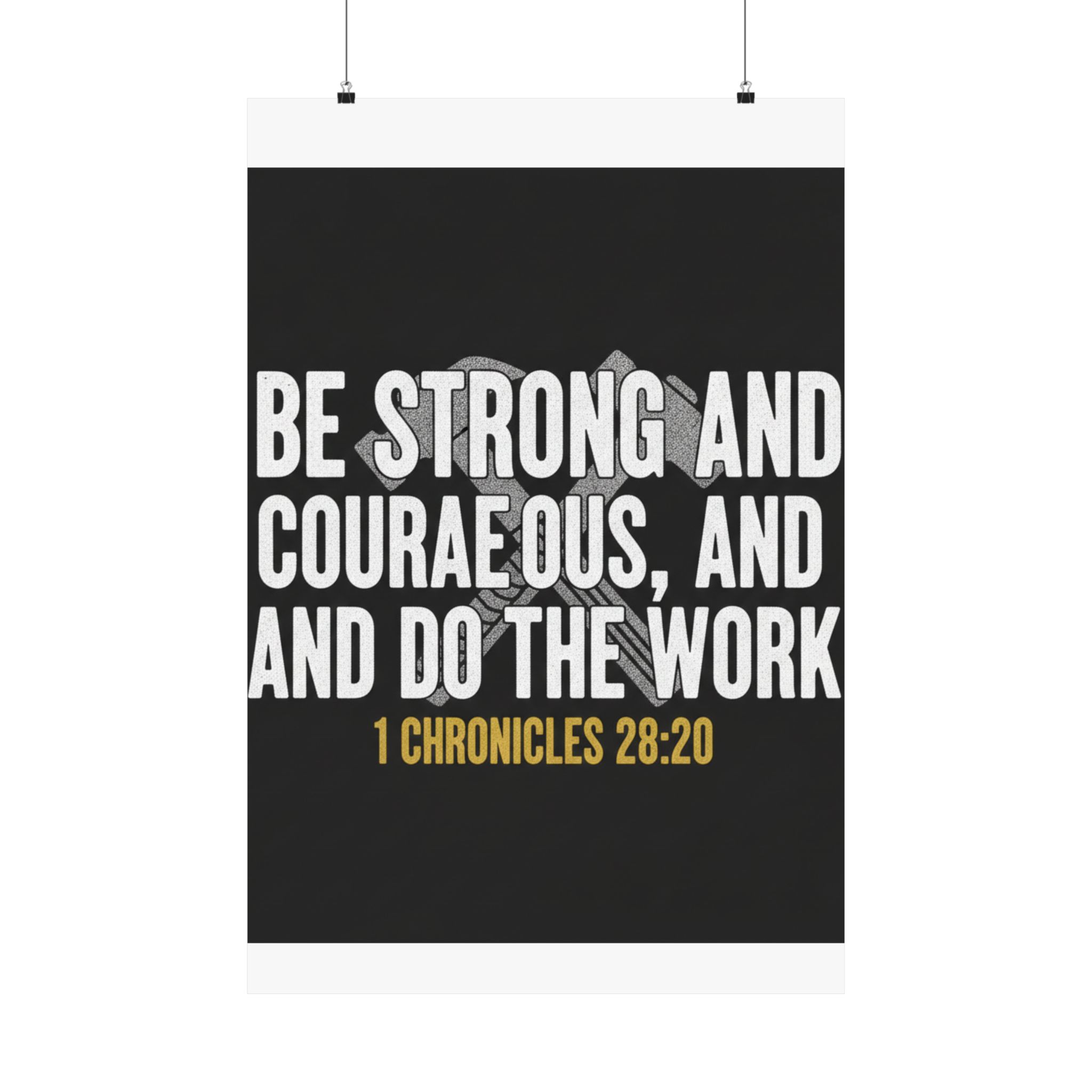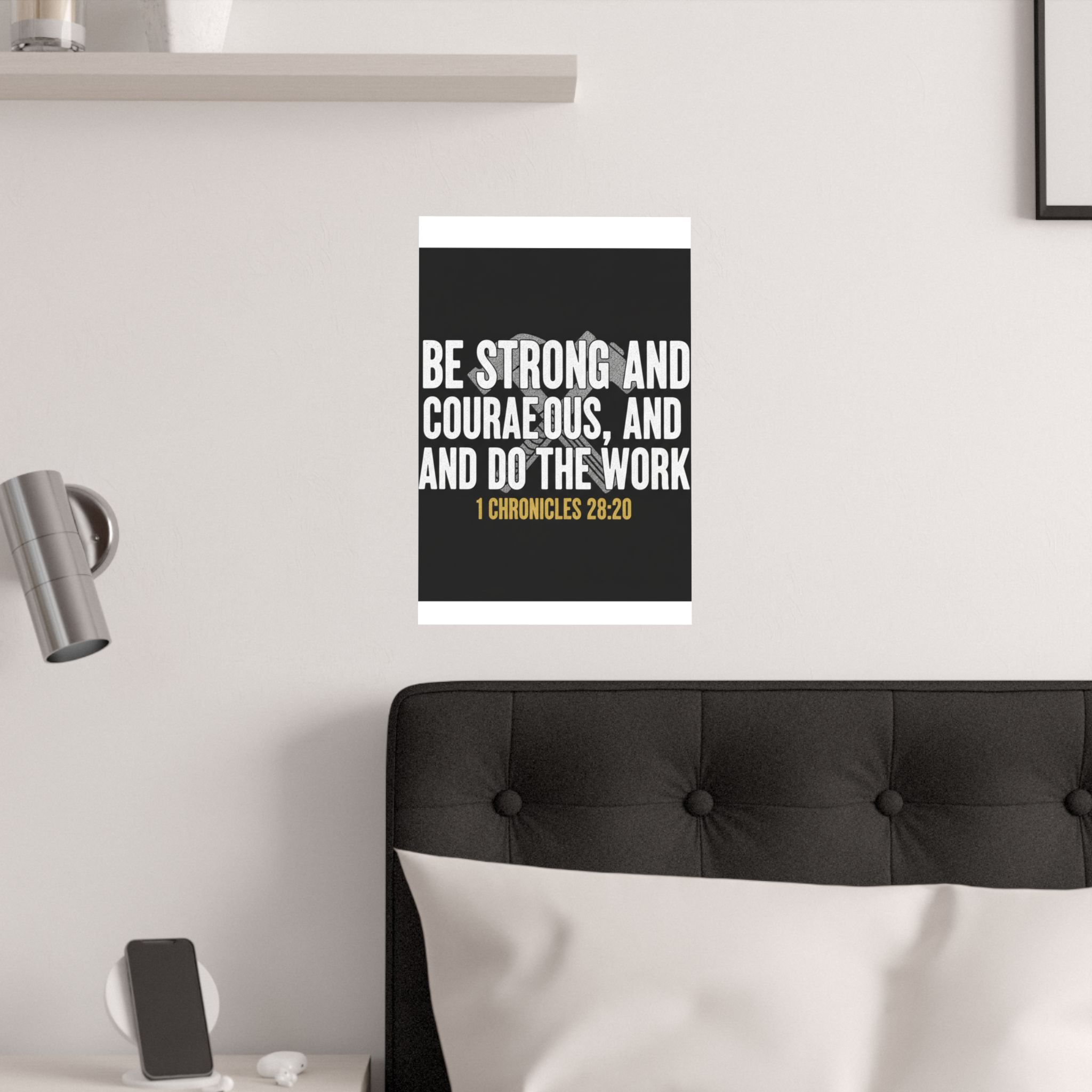 A bold, satin-finish poster that speaks straight to the steady, faithful heart. Thick museum-grade paper and pigment-rich inks bring the white-and-gold typography to life against the deep charcoal background. The design frames a short, powerful scripture—1 Chronicles 28:20—so the message reads clearly from across a room. Hang it in a home office, entryway, church nook, or workshop to anchor a space with quiet resolve and steady encouragement. The low-glare satin surface keeps contrast sharp without harsh reflection, and multiple orientation and size options let you place this statement where it will steady you or someone you love during seasons of decision and duty.