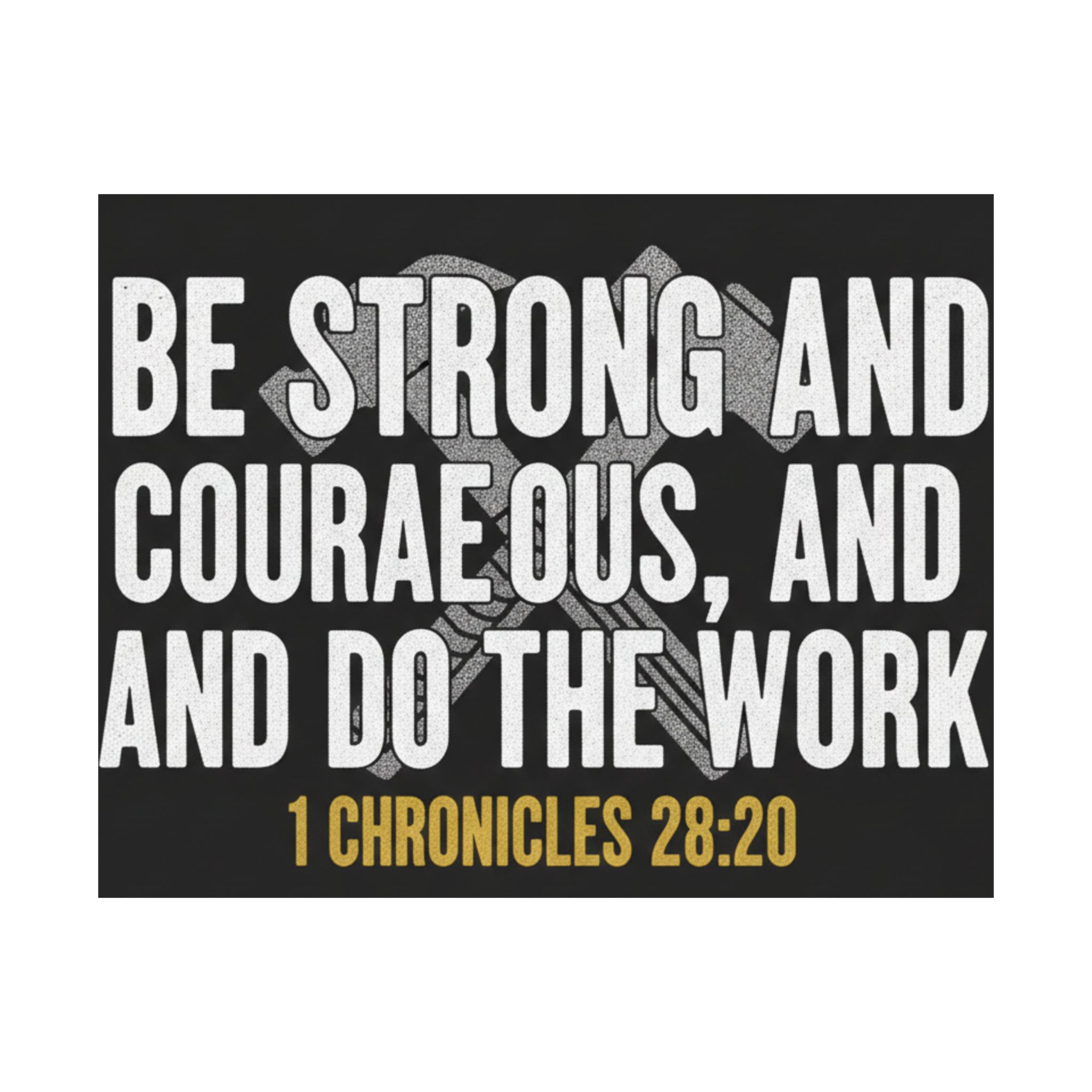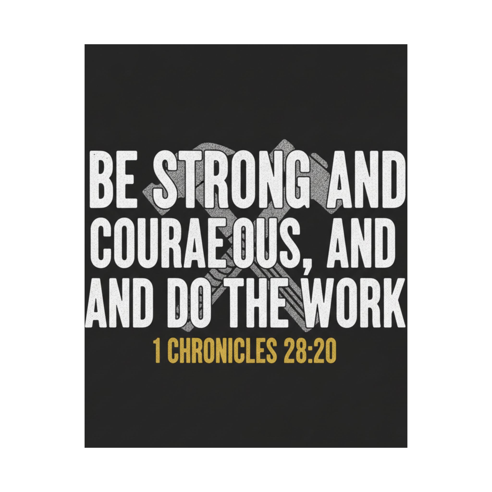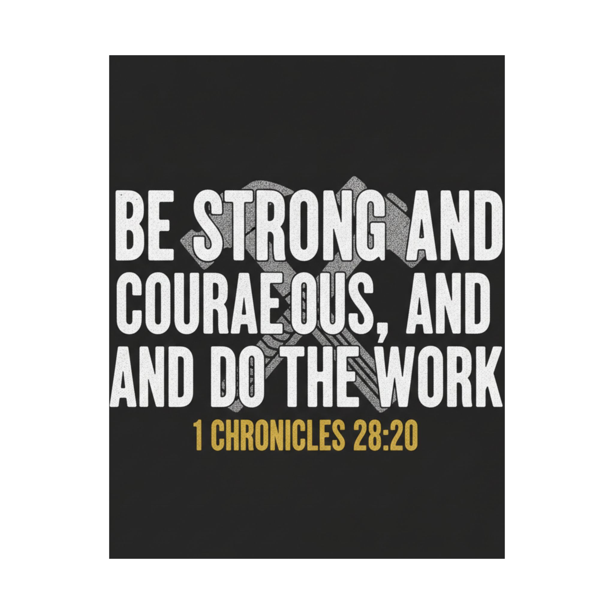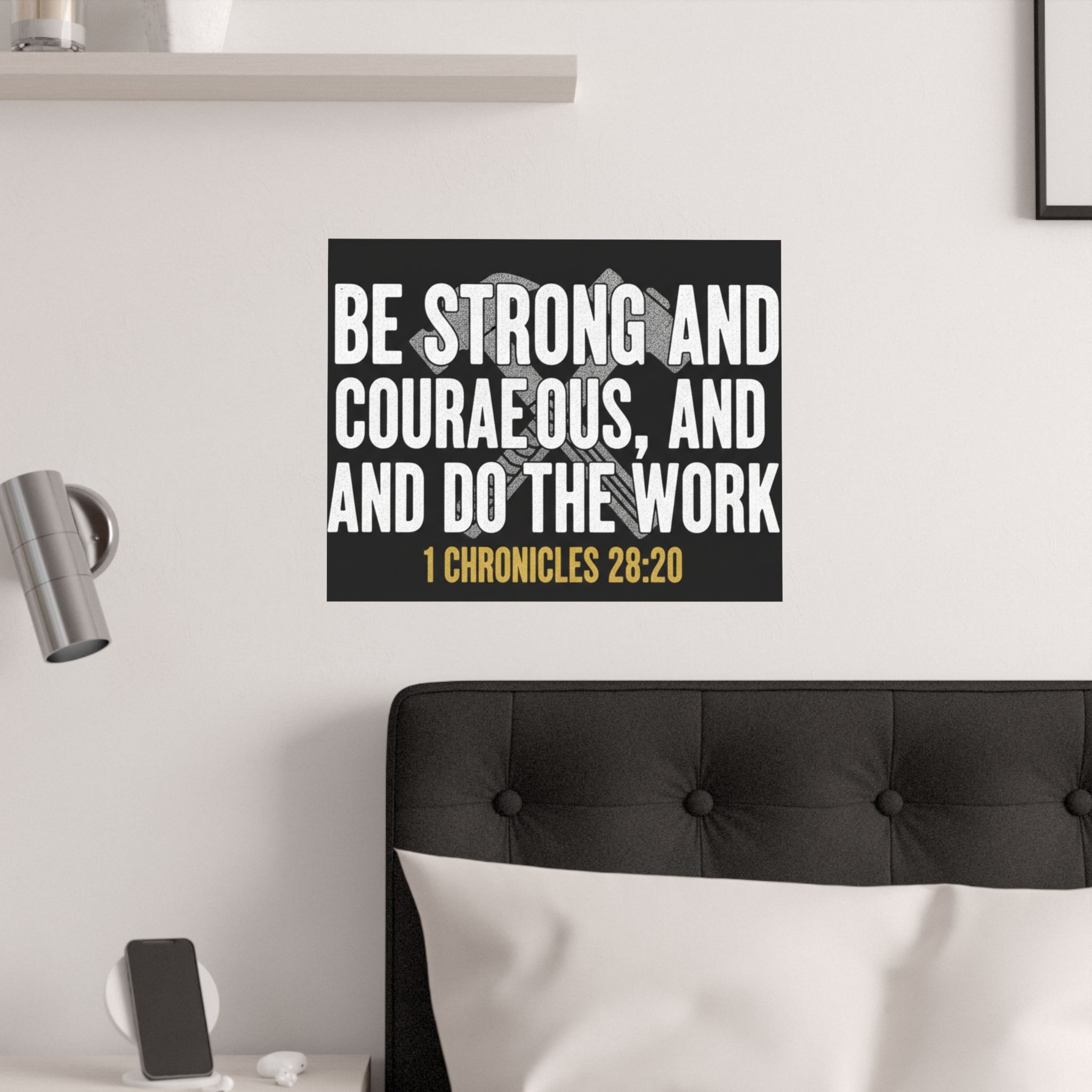 A bold, satin-finish poster that speaks straight to the steady, faithful heart. Thick museum-grade paper and pigment-rich inks bring the white-and-gold typography to life against the deep charcoal background. The design frames a short, powerful scripture—1 Chronicles 28:20—so the message reads clearly from across a room. Hang it in a home office, entryway, church nook, or workshop to anchor a space with quiet resolve and steady encouragement. The low-glare satin surface keeps contrast sharp without harsh reflection, and multiple orientation and size options let you place this statement where it will steady you or someone you love during seasons of decision and duty.