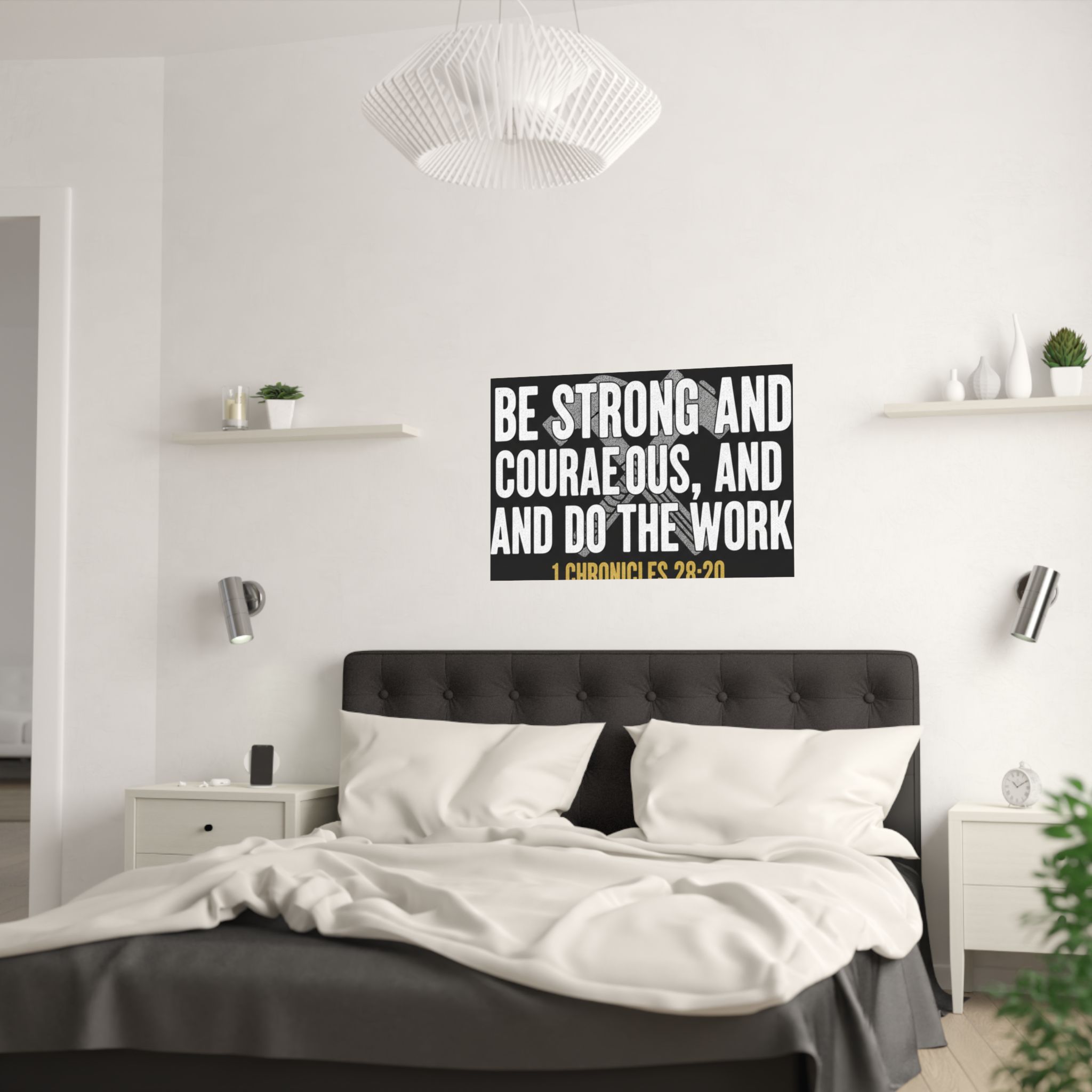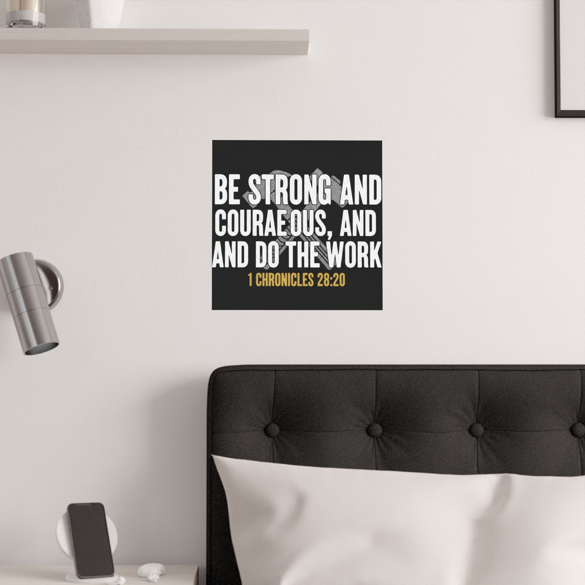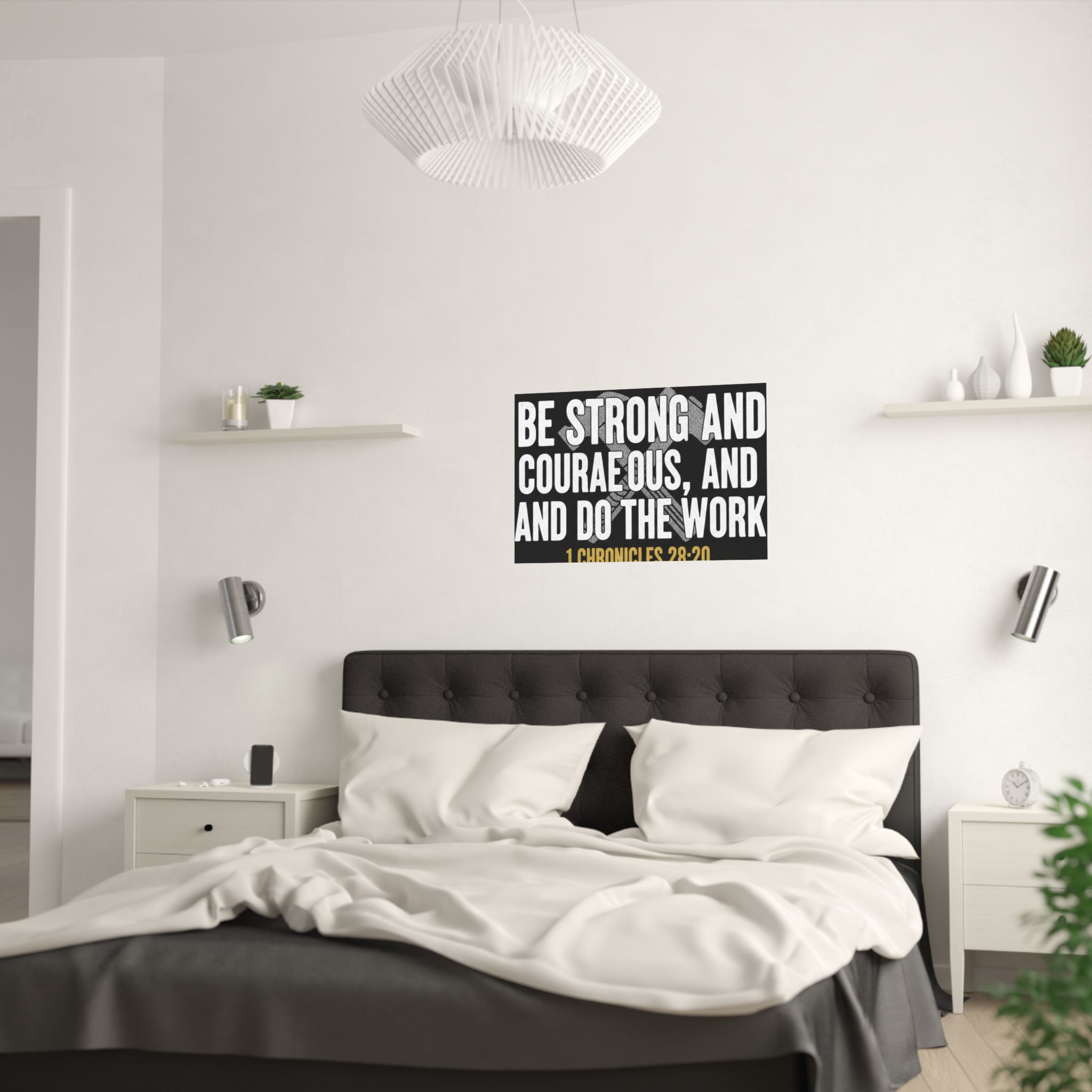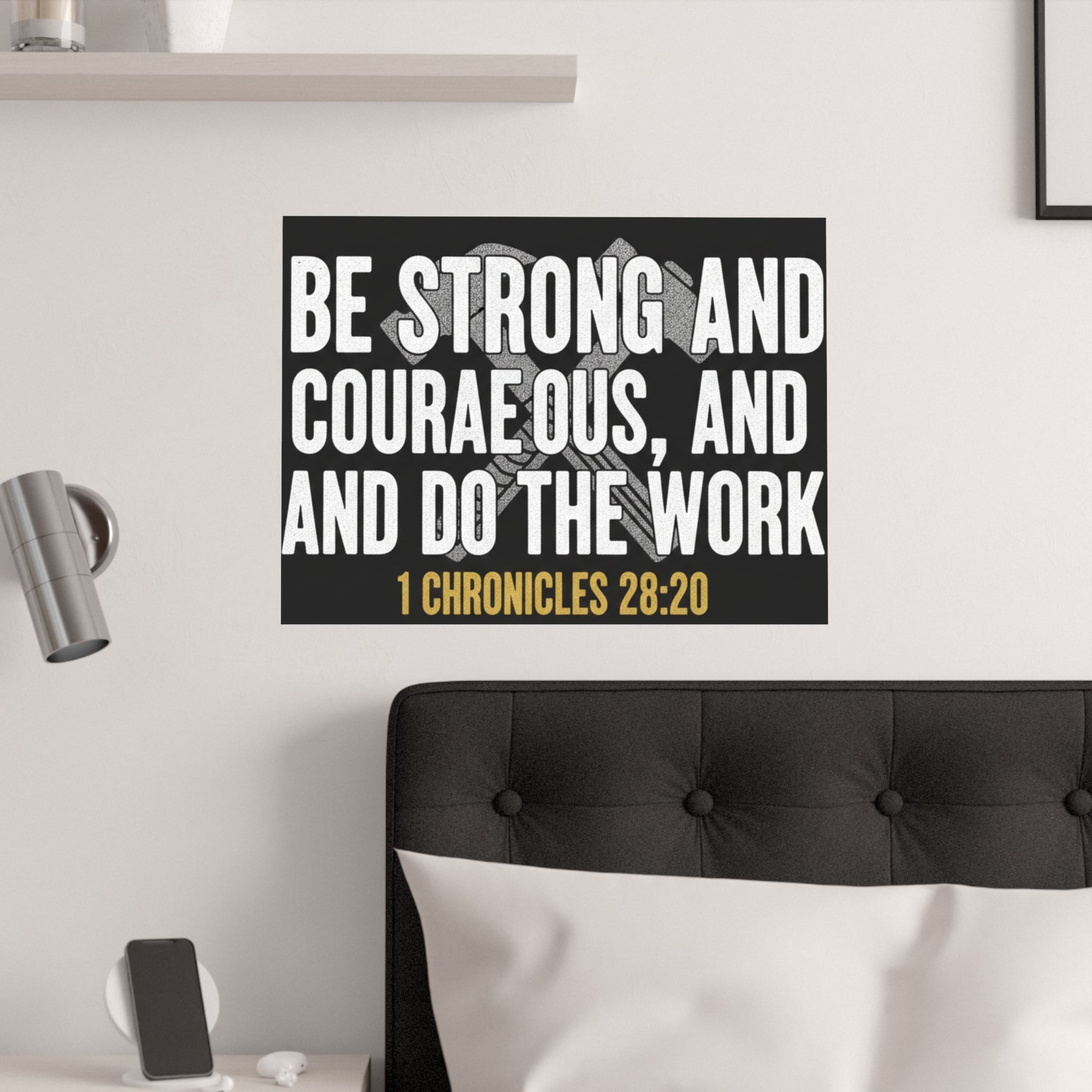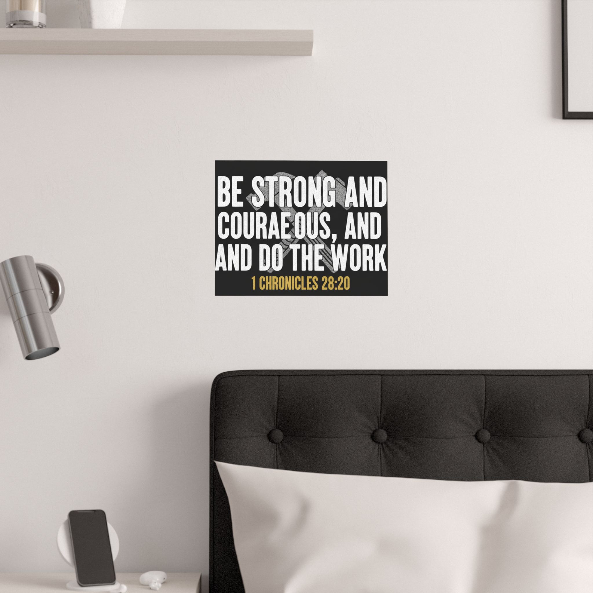 A bold, satin-finish poster that speaks straight to the steady, faithful heart. Thick museum-grade paper and pigment-rich inks bring the white-and-gold typography to life against the deep charcoal background. The design frames a short, powerful scripture—1 Chronicles 28:20—so the message reads clearly from across a room. Hang it in a home office, entryway, church nook, or workshop to anchor a space with quiet resolve and steady encouragement. The low-glare satin surface keeps contrast sharp without harsh reflection, and multiple orientation and size options let you place this statement where it will steady you or someone you love during seasons of decision and duty.