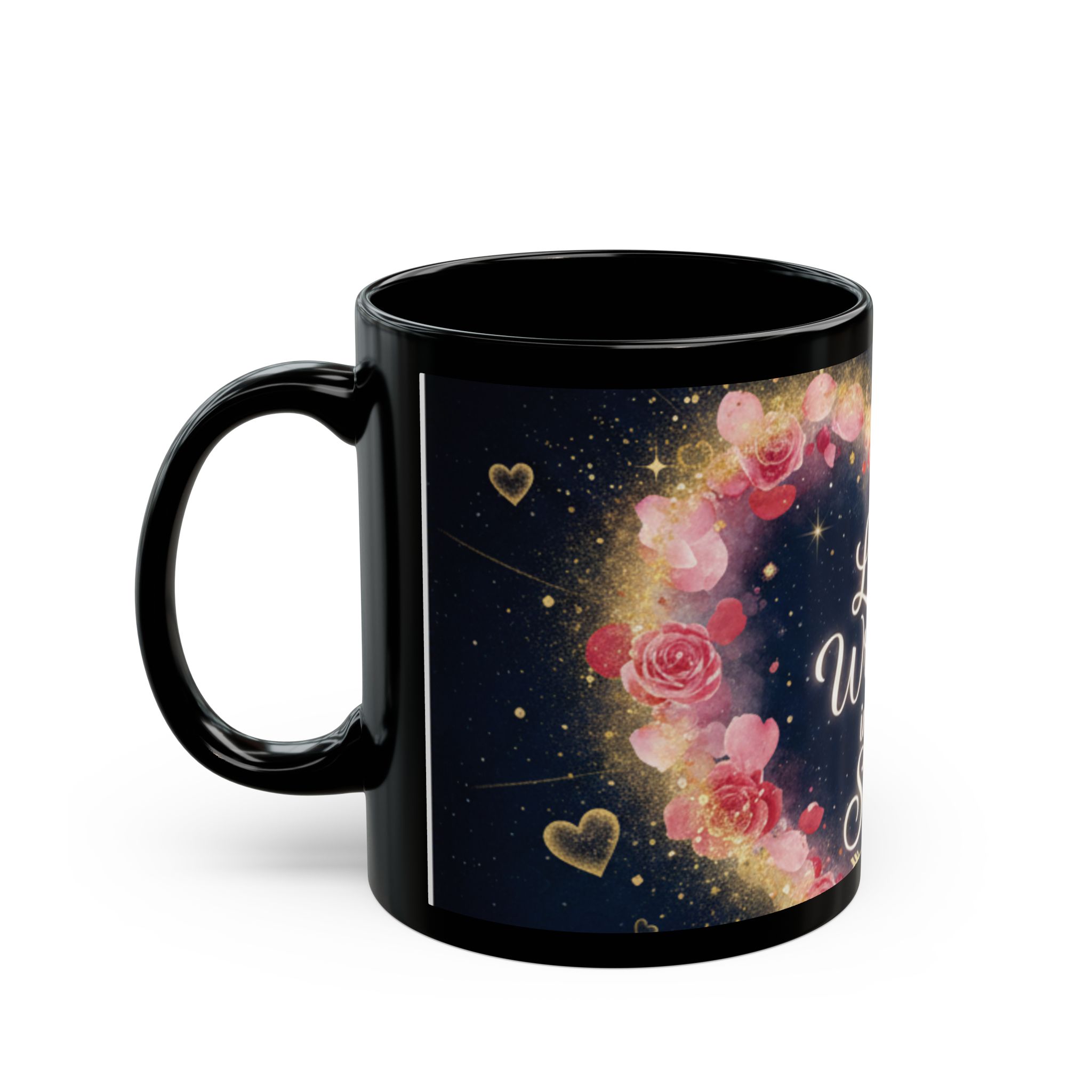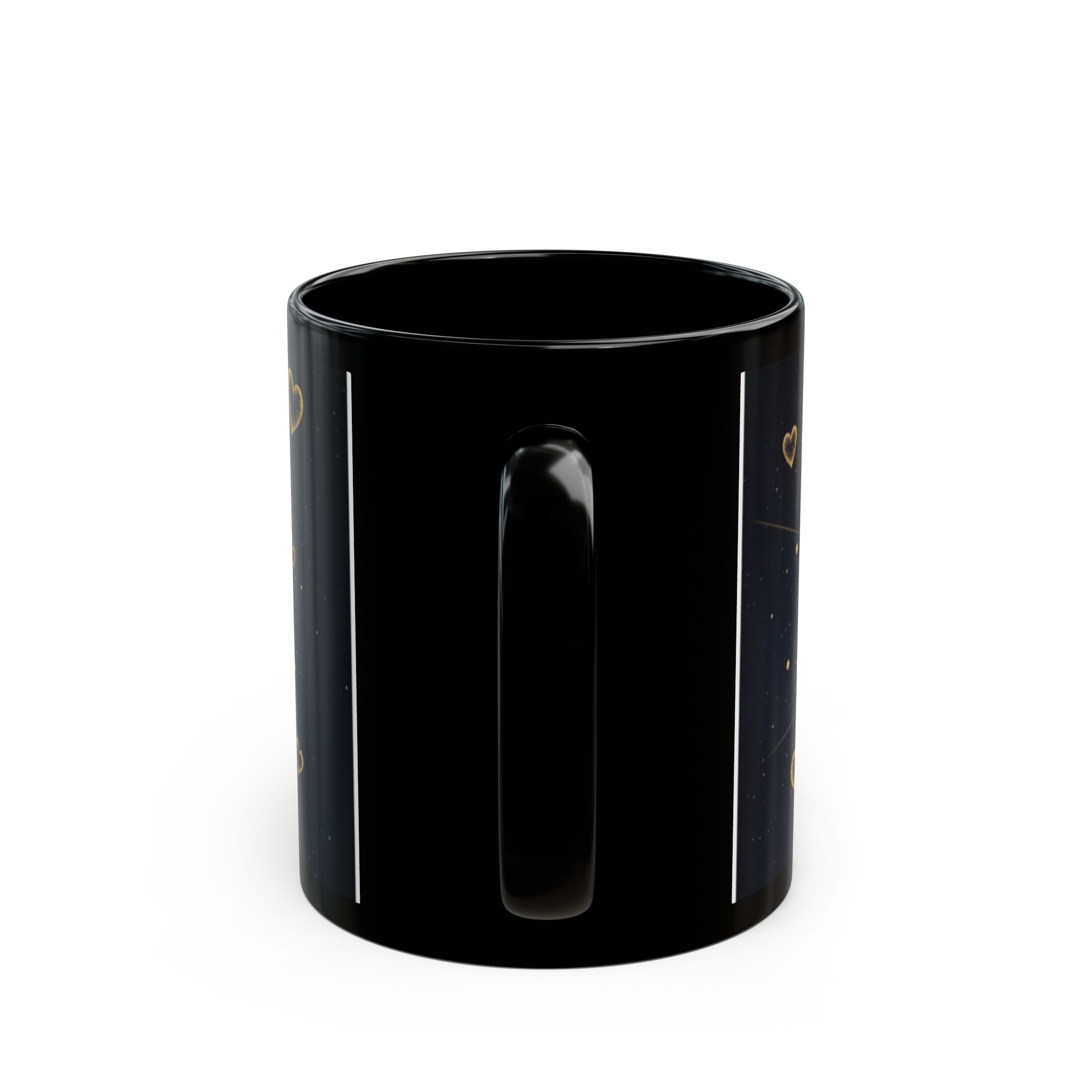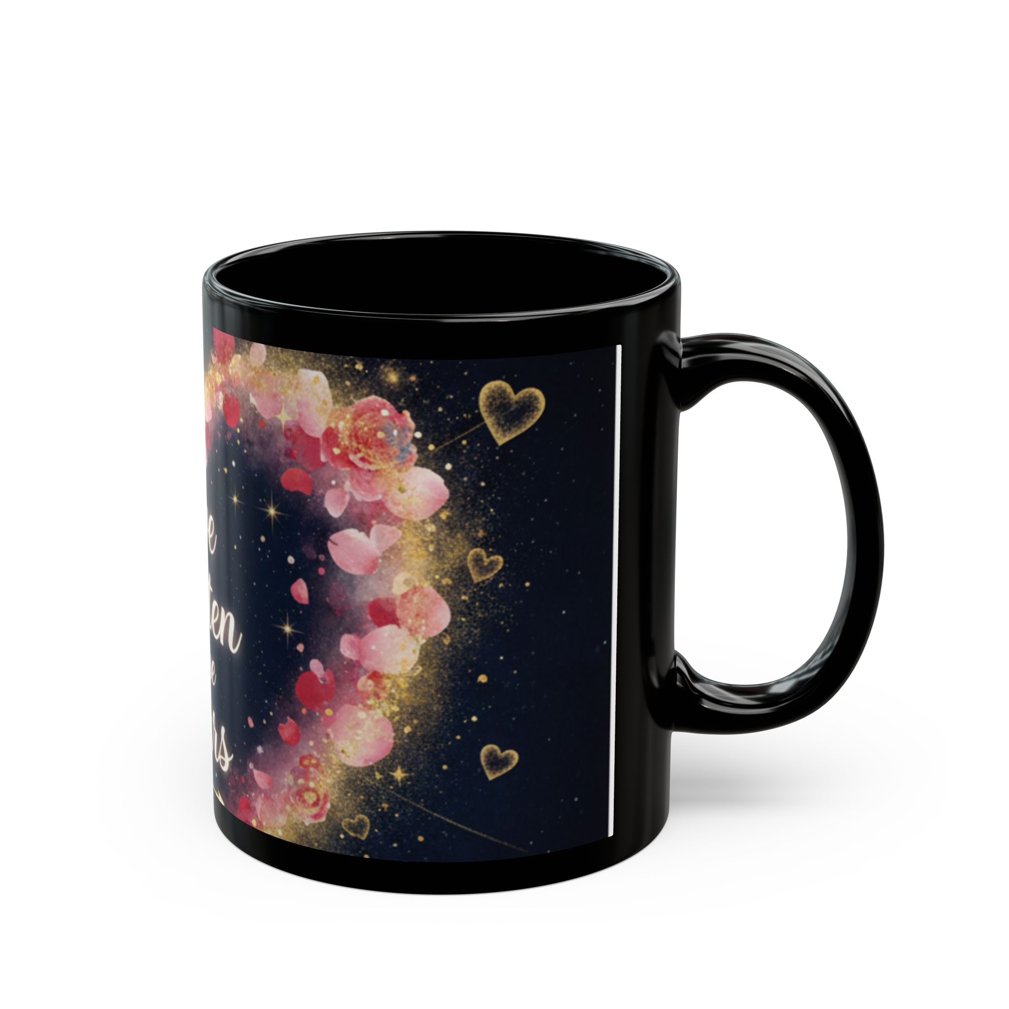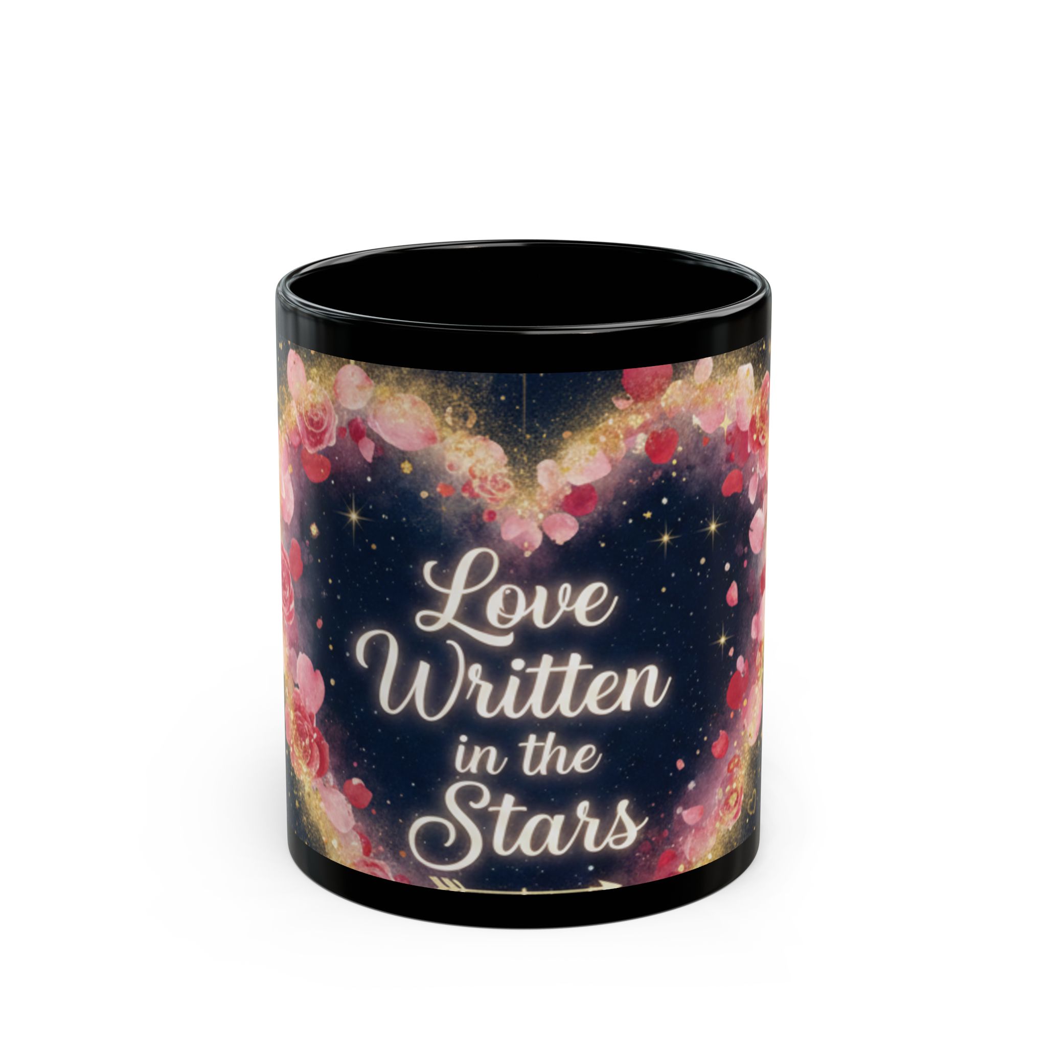 Warmth in your hands and a quiet, starry moment between sips. This black glossy ceramic mug wraps a midnight backdrop with shimmering gold specks and a soft wreath of pink blooms that frame the phrase “Love Written in the Stars.” It feels like a slow morning on the porch, a cosy pause after a long day, or a whispered message shared across late-night conversations. The deep black body makes the colors pop, while the comfortable C-shaped handle keeps your grip steady. Use it for tea, coffee, cocoa, or as a little shrine for pens and notes on your desk — it brings a touch of romantic wonder to ordinary rituals and moments that matter.