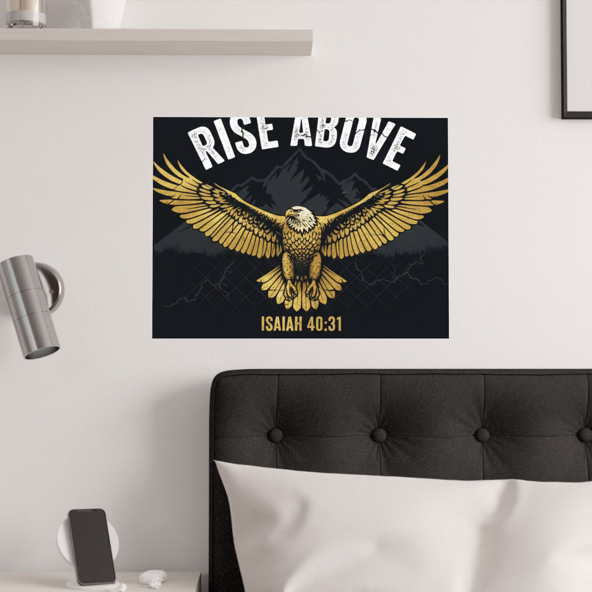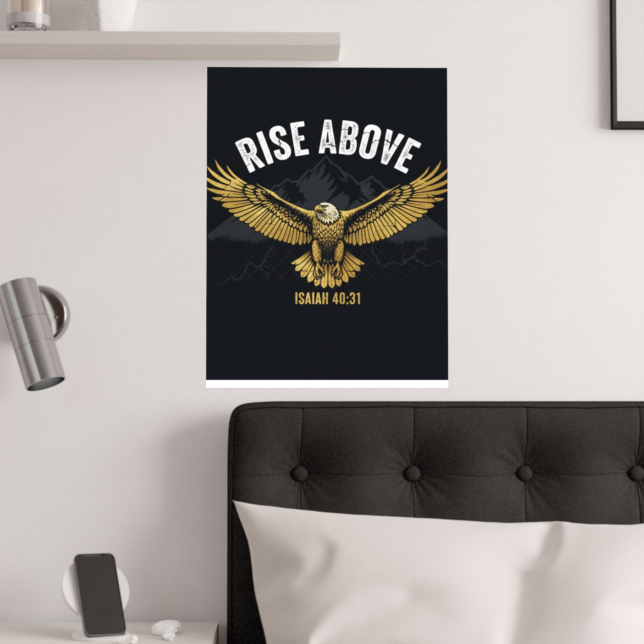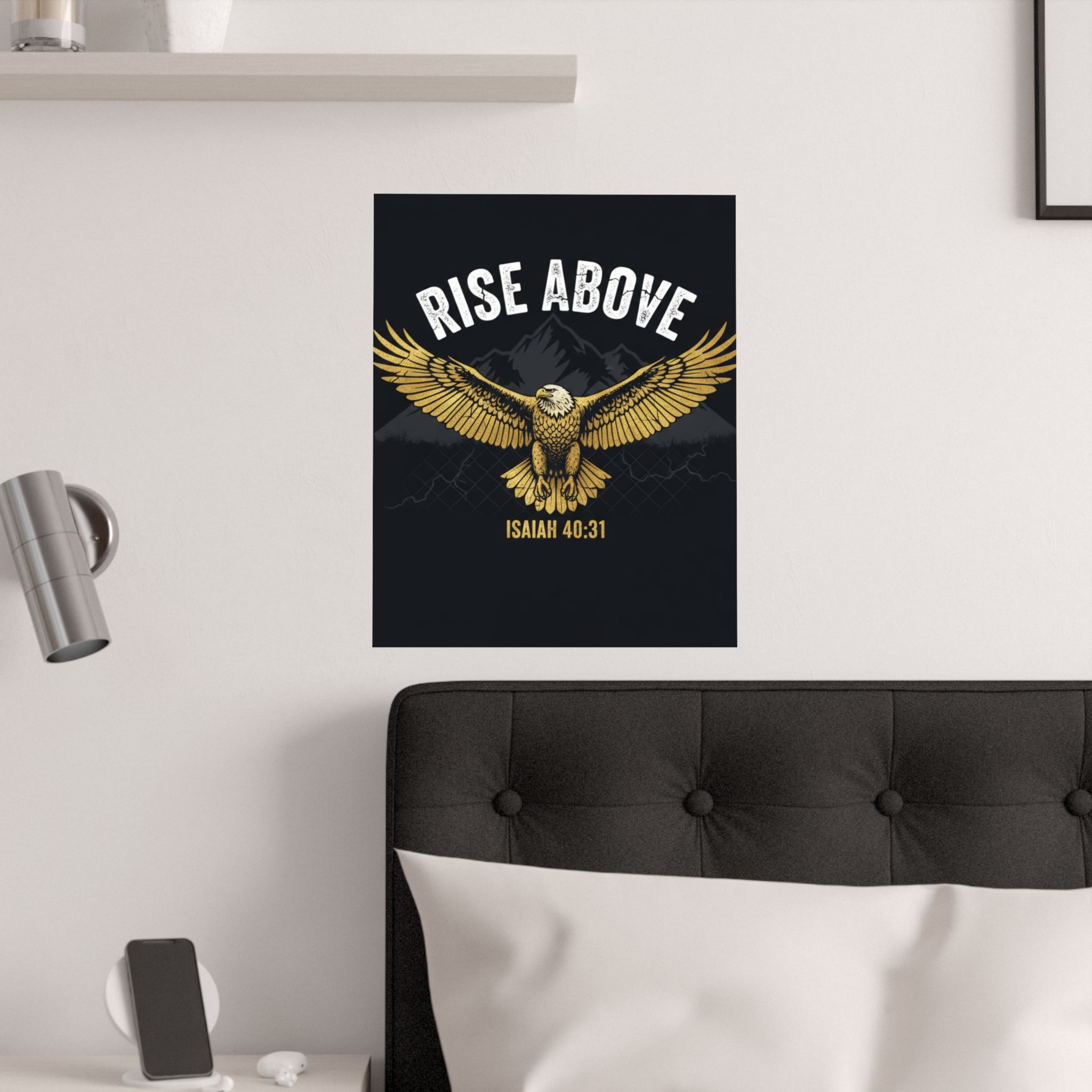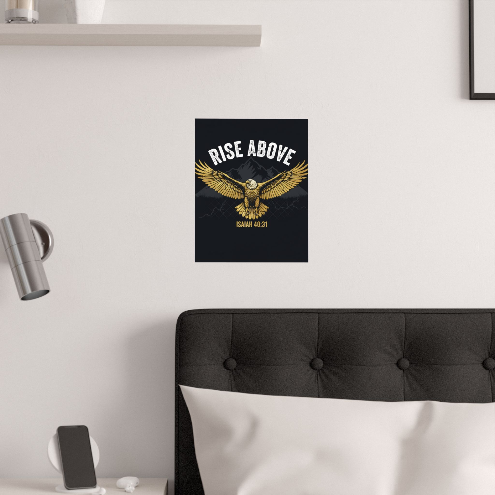 A bold satin poster that brings a room to life with deep, low-glare blacks and shimmering gold tones. An eagle with outstretched wings soars over shadowed mountains beneath the rallying words “RISE ABOVE” and the scriptural anchor Isaiah 40:31. Printed on museum-grade paper with pigment inks, the image stays bright and true for years. Hang it on a bedroom wall, above a desk, or in a quiet prayer corner to summon courage and steady focus during long days and late nights.