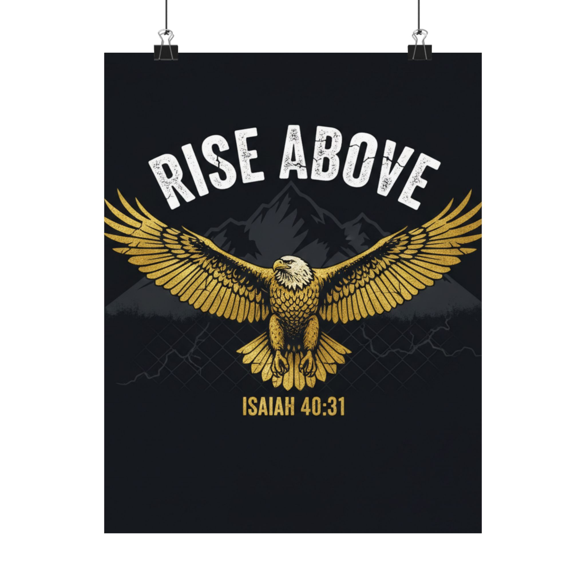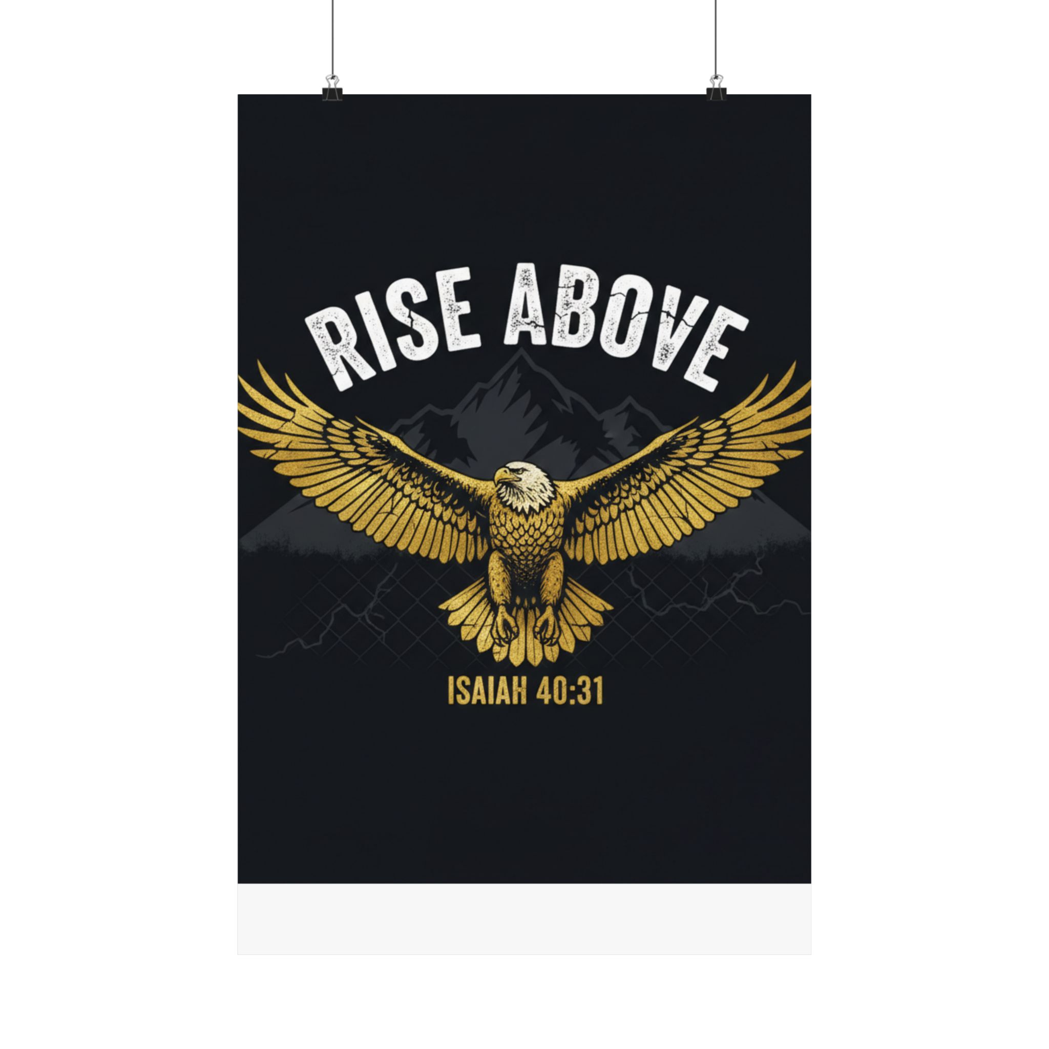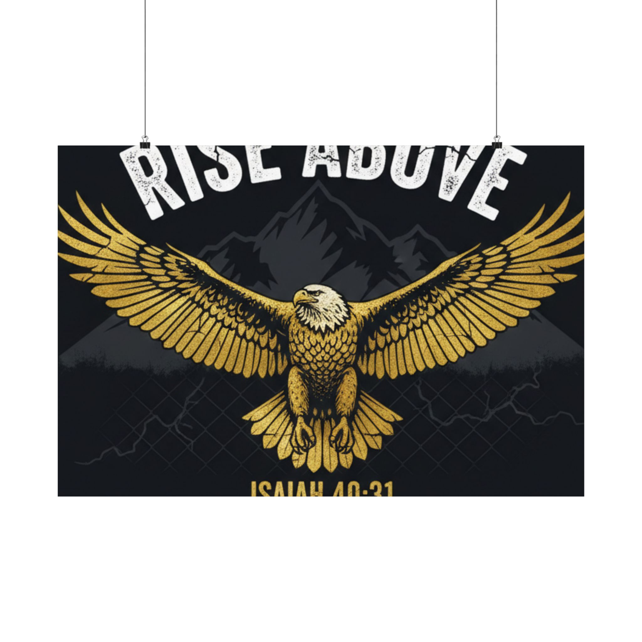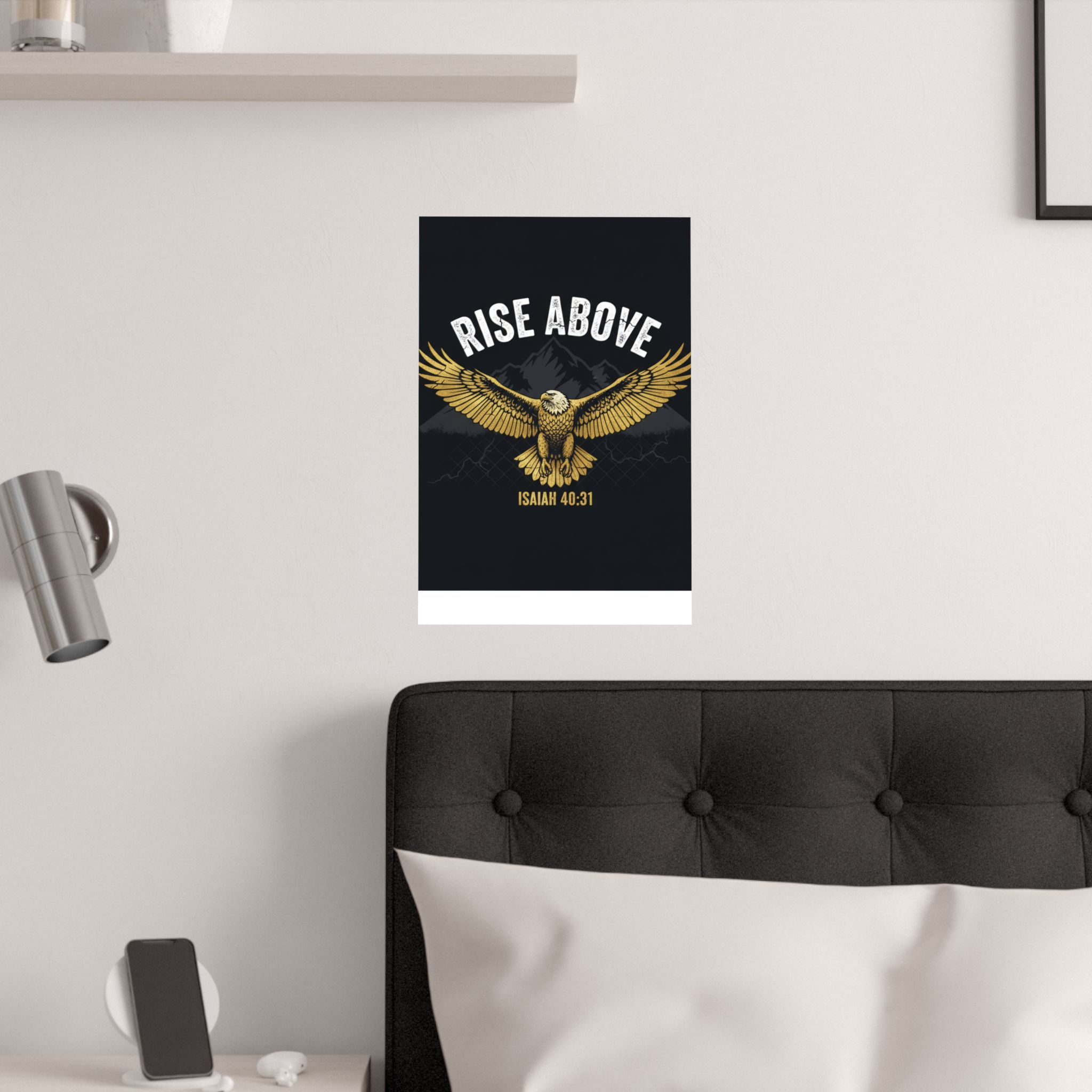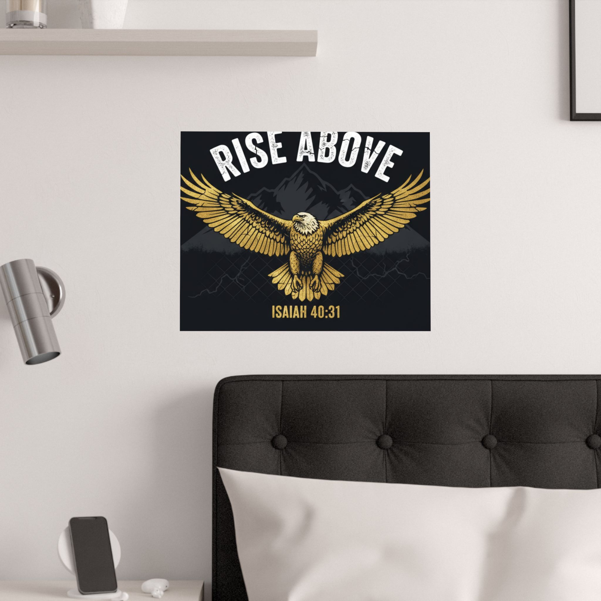 A bold satin poster that brings a room to life with deep, low-glare blacks and shimmering gold tones. An eagle with outstretched wings soars over shadowed mountains beneath the rallying words “RISE ABOVE” and the scriptural anchor Isaiah 40:31. Printed on museum-grade paper with pigment inks, the image stays bright and true for years. Hang it on a bedroom wall, above a desk, or in a quiet prayer corner to summon courage and steady focus during long days and late nights.
