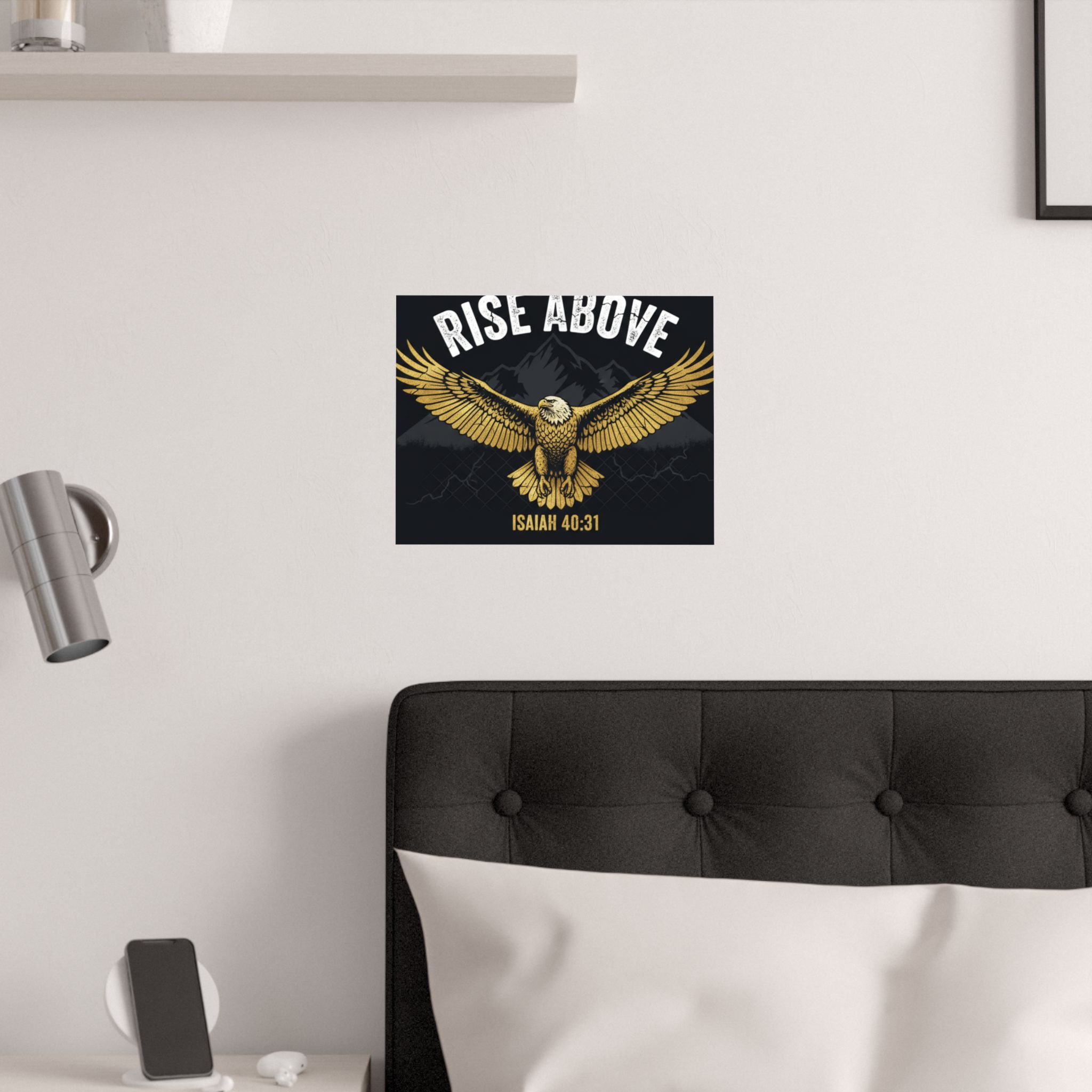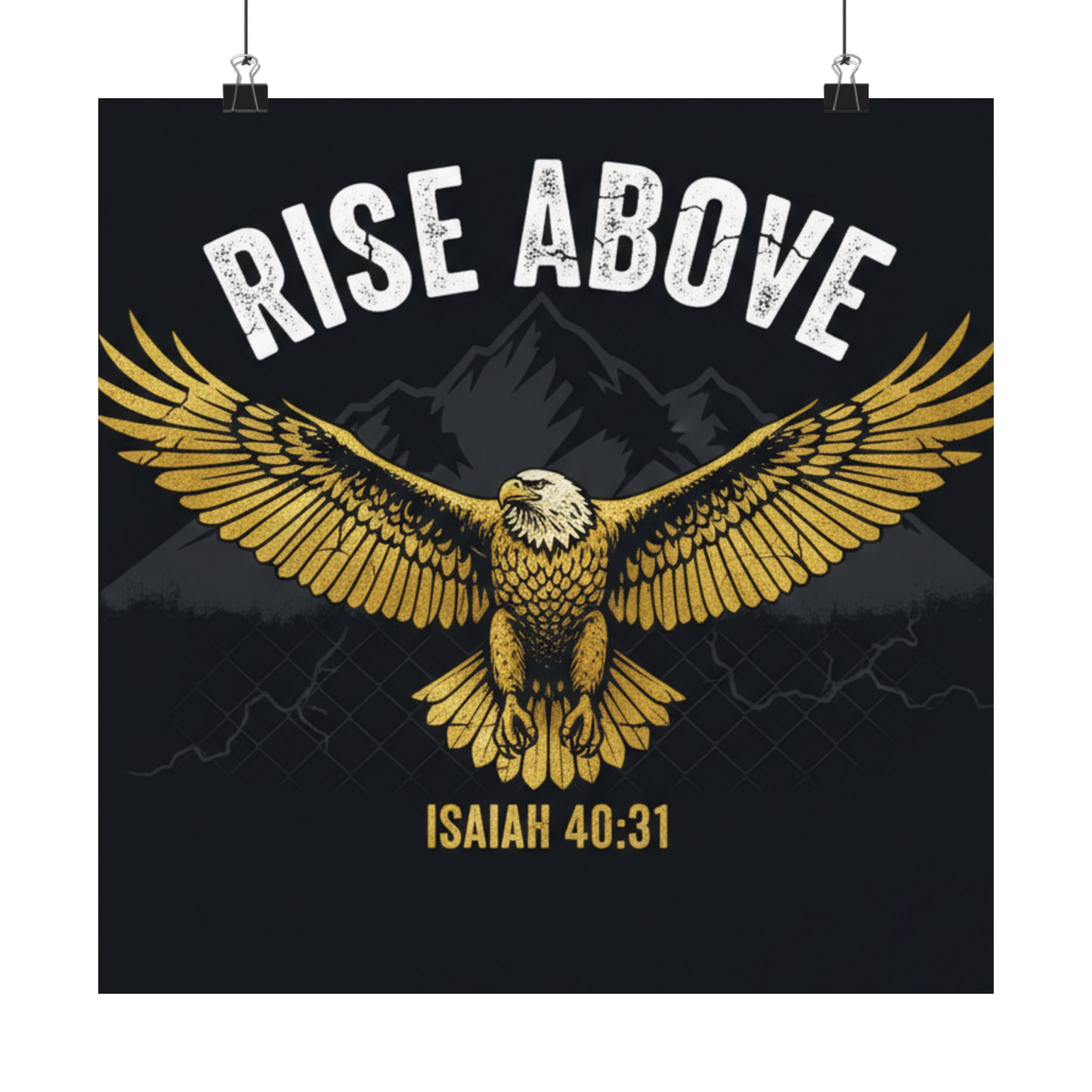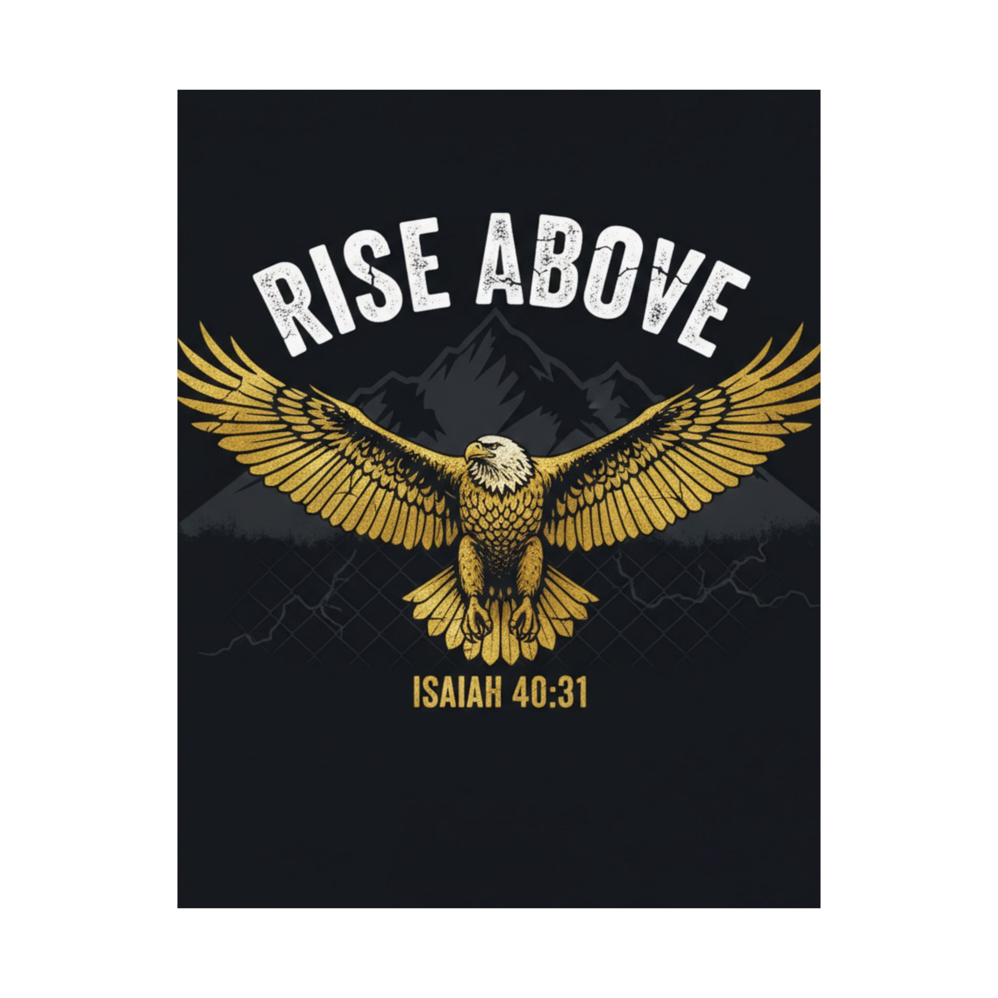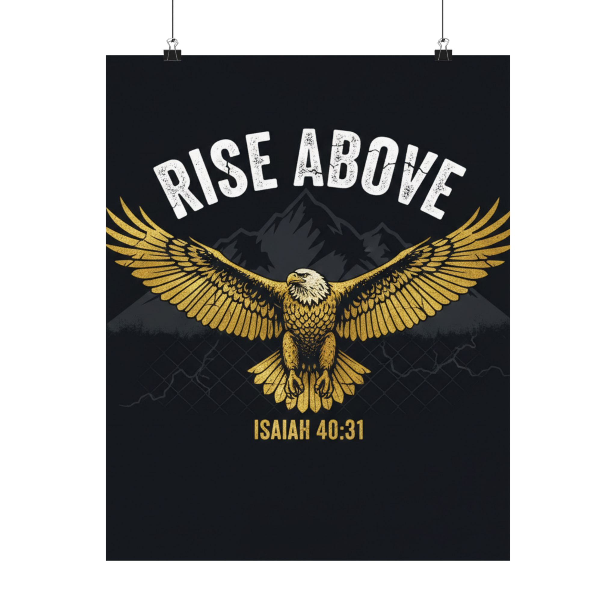 A bold satin poster that brings a room to life with deep, low-glare blacks and shimmering gold tones. An eagle with outstretched wings soars over shadowed mountains beneath the rallying words “RISE ABOVE” and the scriptural anchor Isaiah 40:31. Printed on museum-grade paper with pigment inks, the image stays bright and true for years. Hang it on a bedroom wall, above a desk, or in a quiet prayer corner to summon courage and steady focus during long days and late nights.