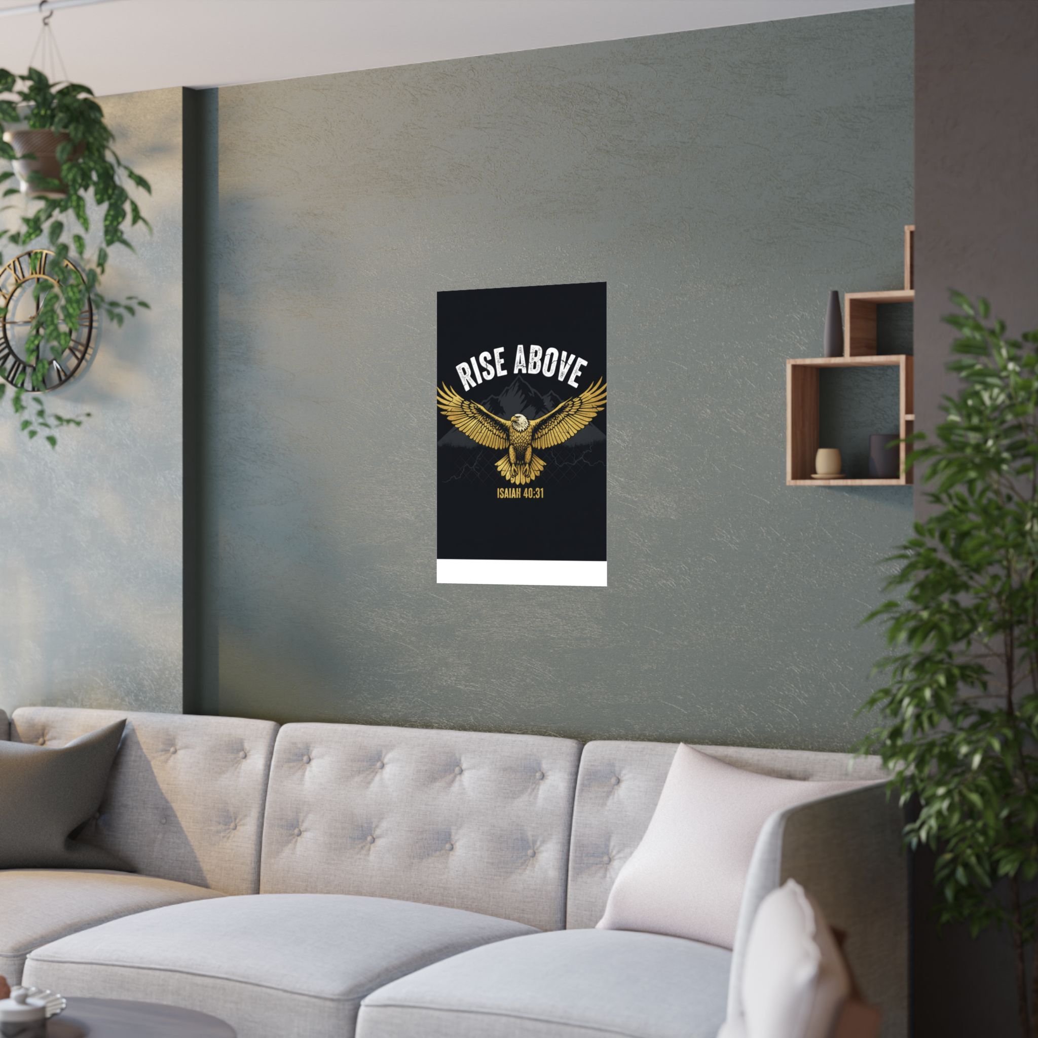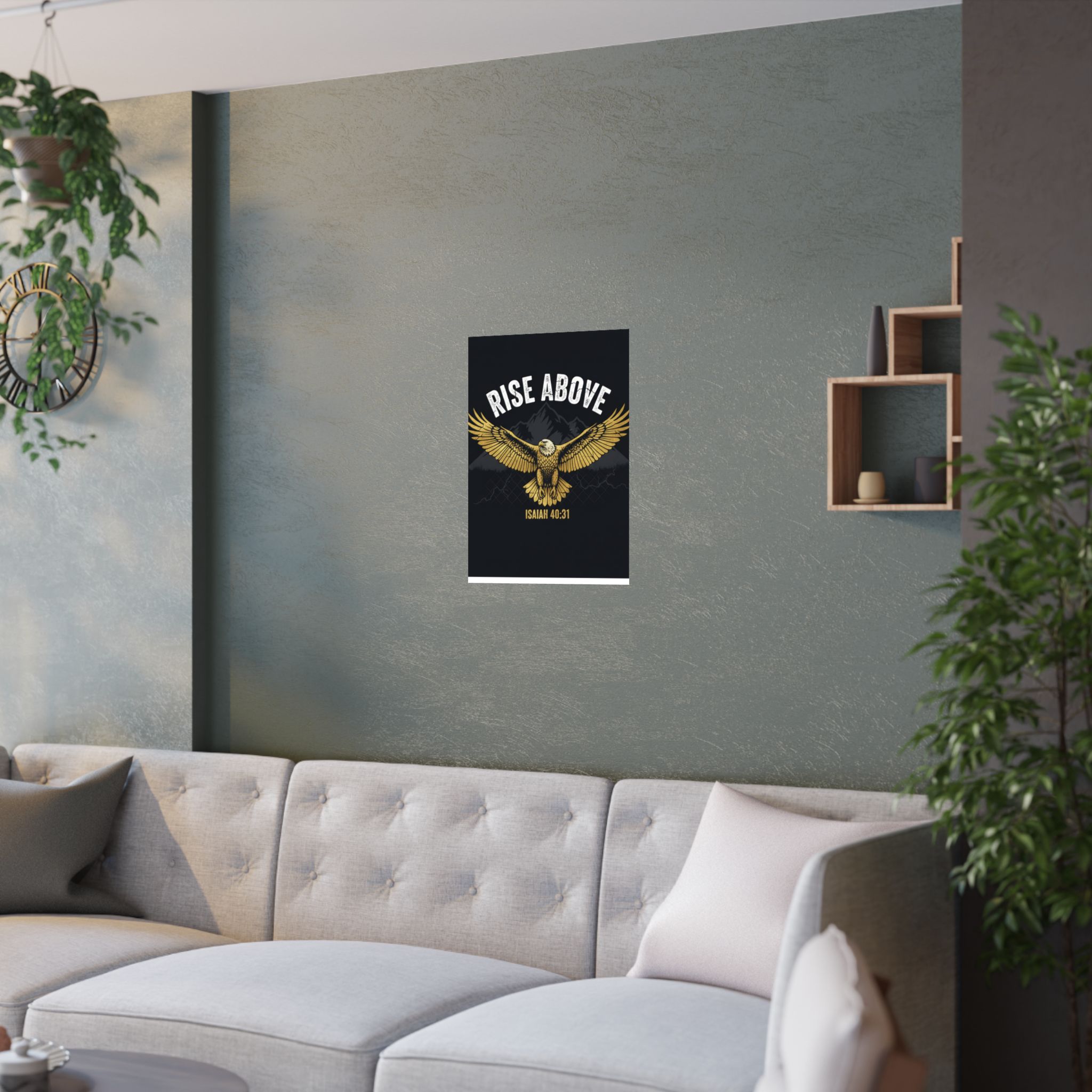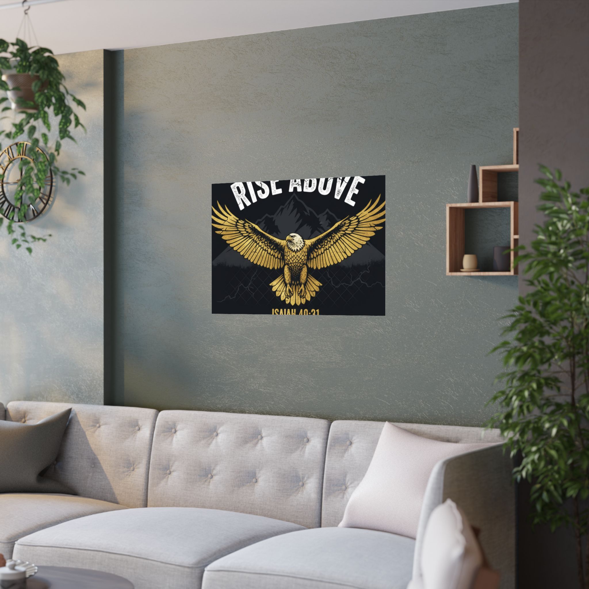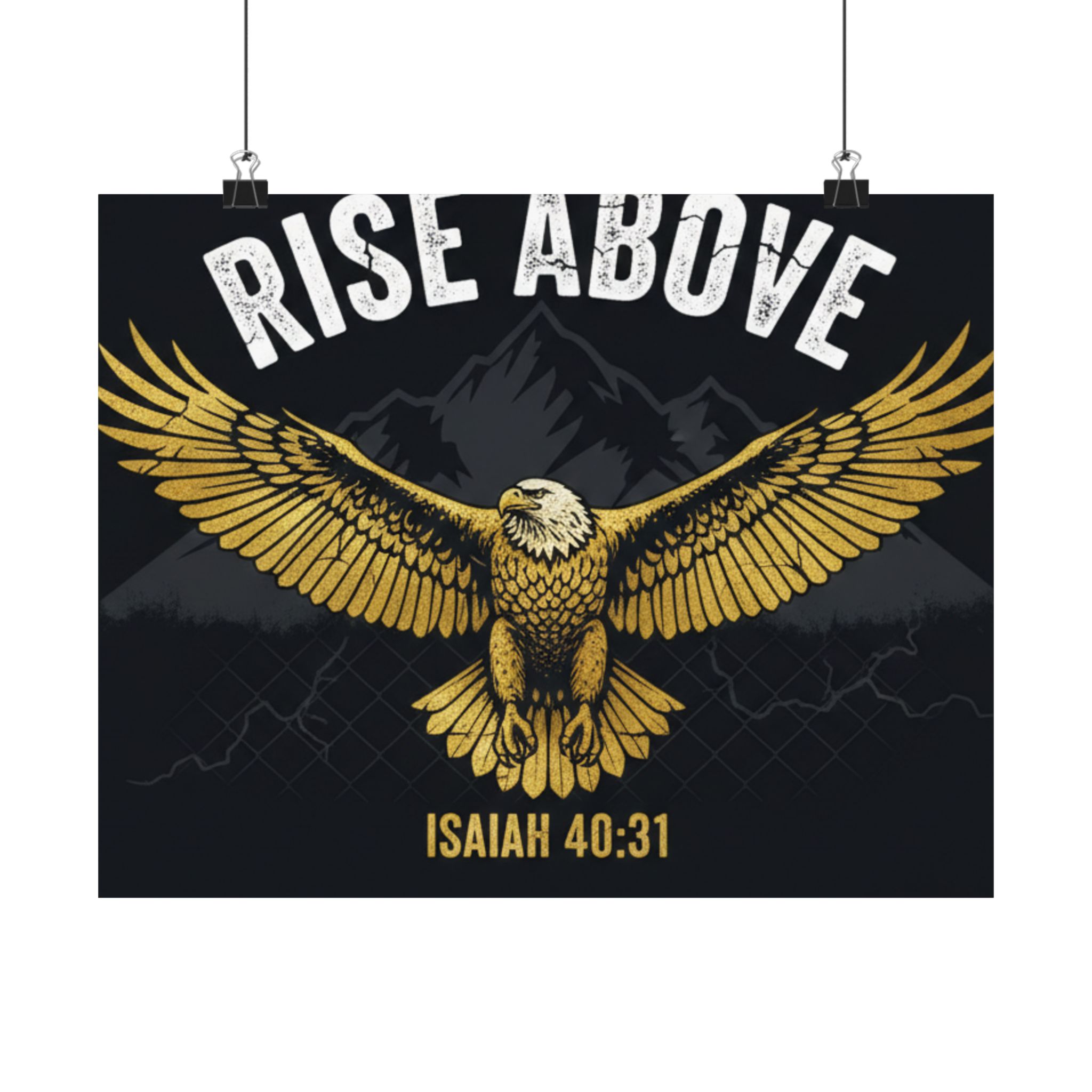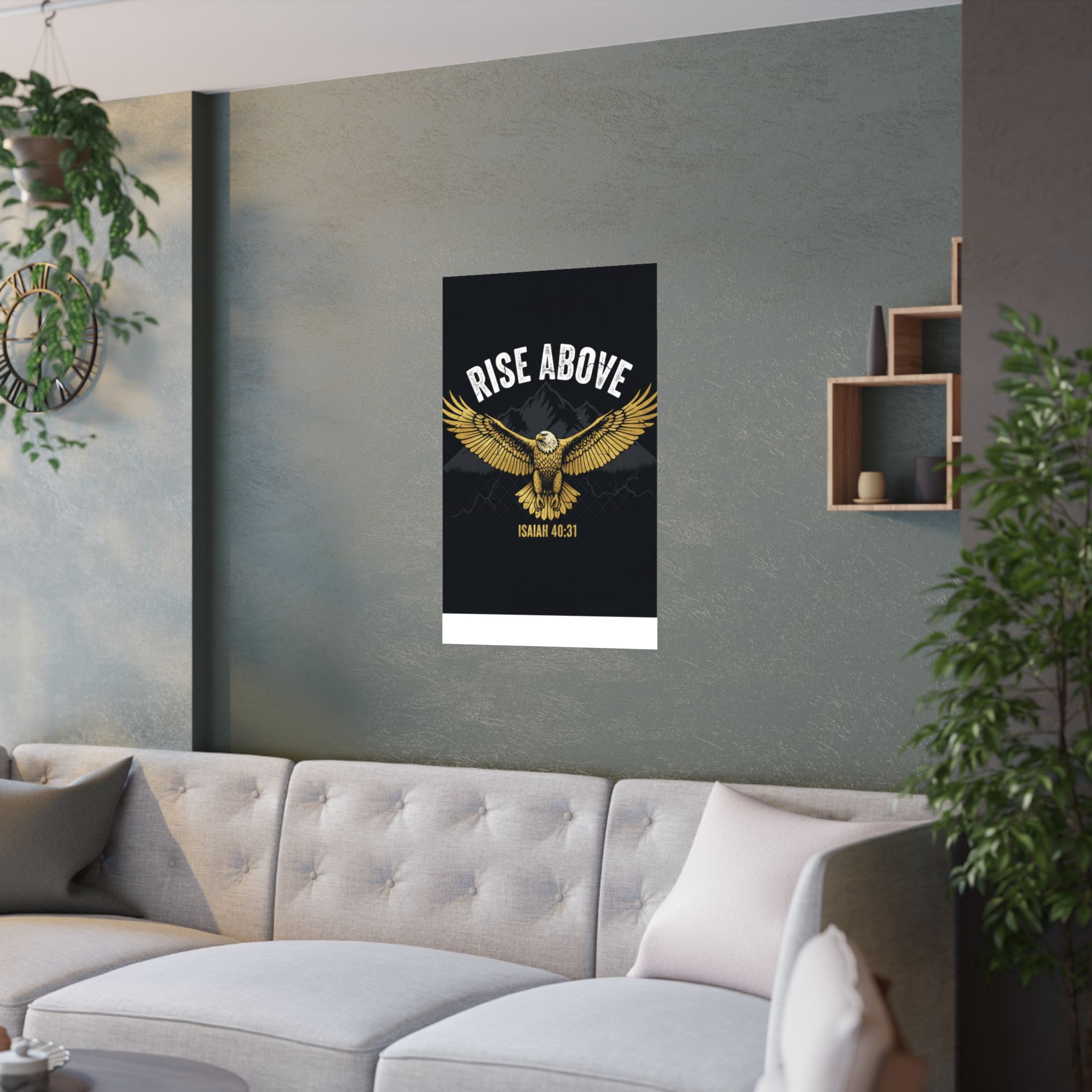 A bold satin poster that brings a room to life with deep, low-glare blacks and shimmering gold tones. An eagle with outstretched wings soars over shadowed mountains beneath the rallying words “RISE ABOVE” and the scriptural anchor Isaiah 40:31. Printed on museum-grade paper with pigment inks, the image stays bright and true for years. Hang it on a bedroom wall, above a desk, or in a quiet prayer corner to summon courage and steady focus during long days and late nights.