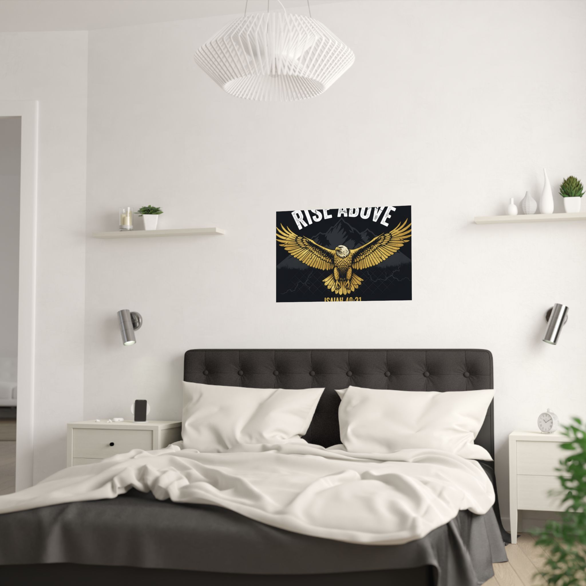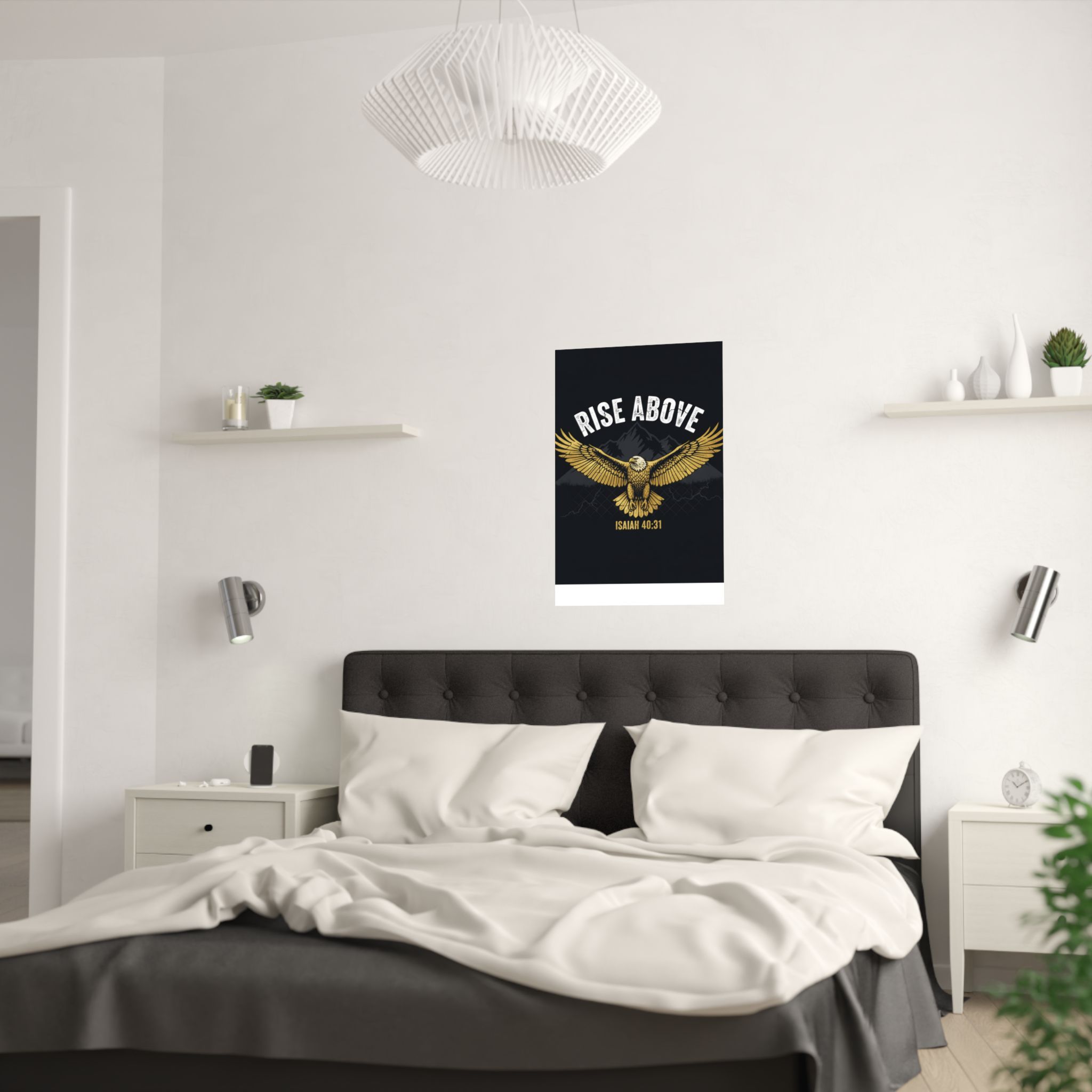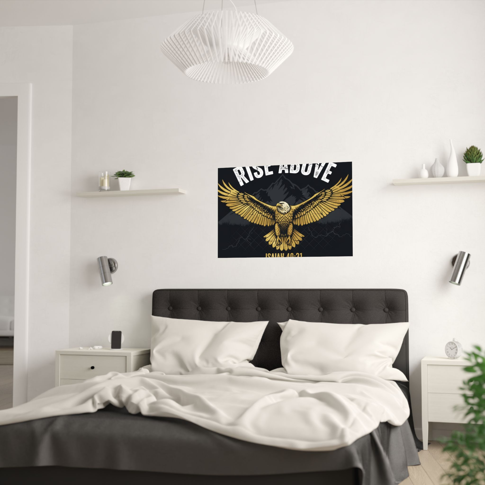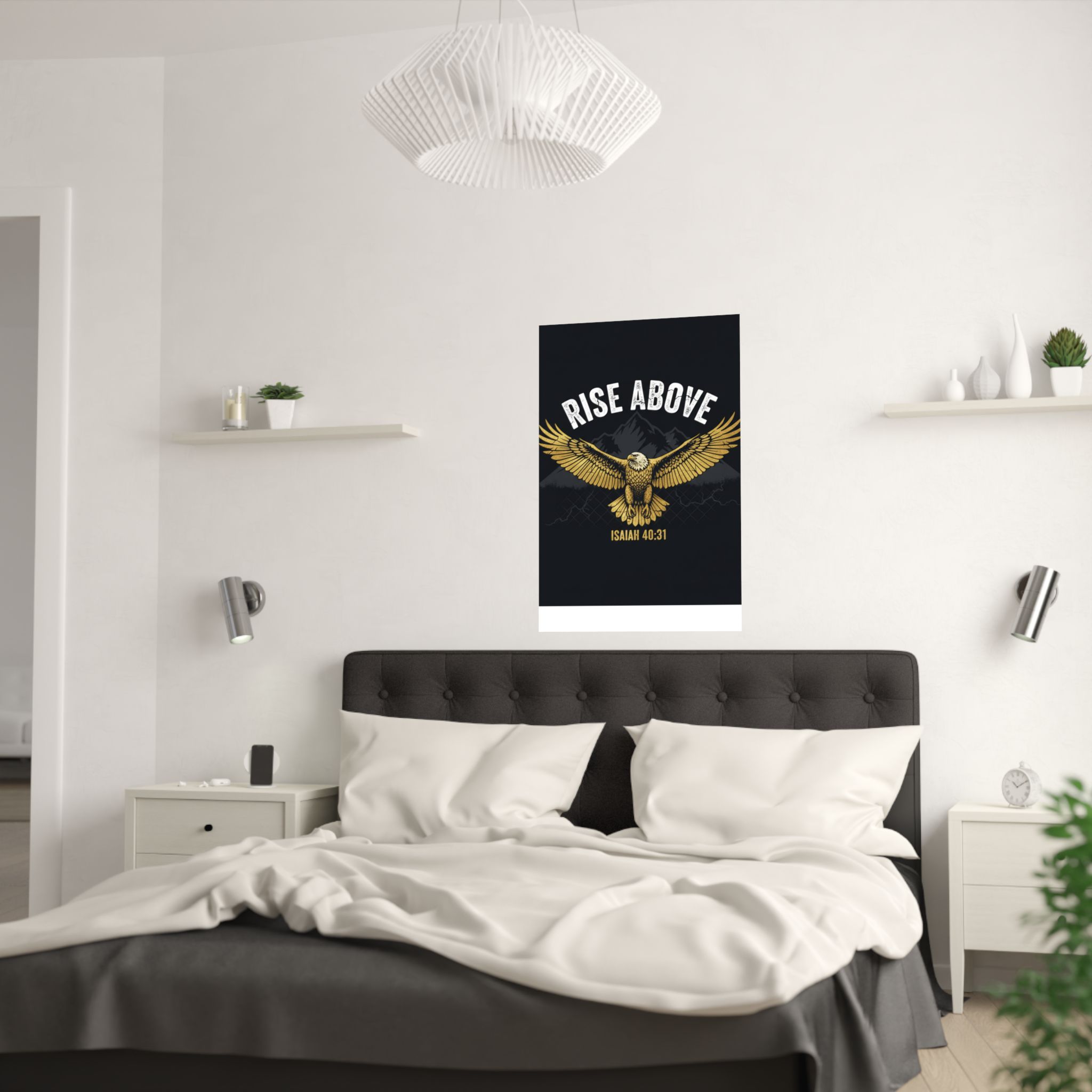 A bold satin poster that brings a room to life with deep, low-glare blacks and shimmering gold tones. An eagle with outstretched wings soars over shadowed mountains beneath the rallying words “RISE ABOVE” and the scriptural anchor Isaiah 40:31. Printed on museum-grade paper with pigment inks, the image stays bright and true for years. Hang it on a bedroom wall, above a desk, or in a quiet prayer corner to summon courage and steady focus during long days and late nights.