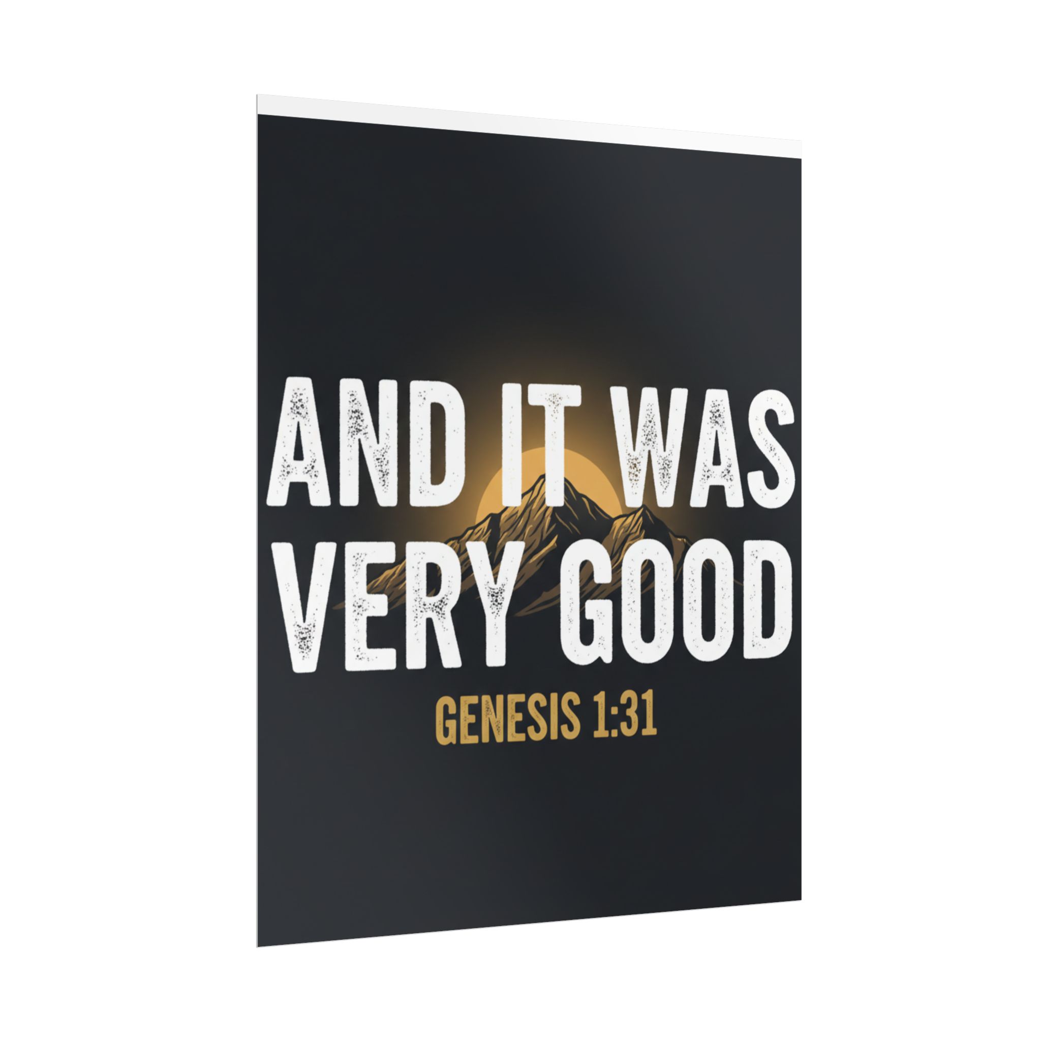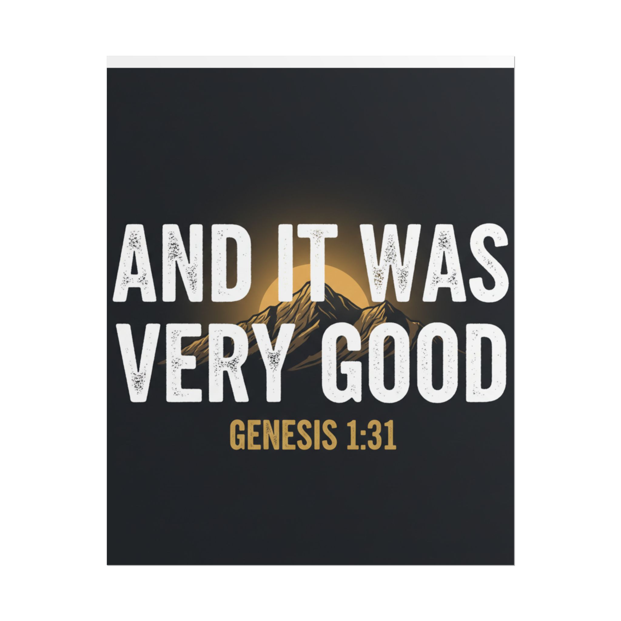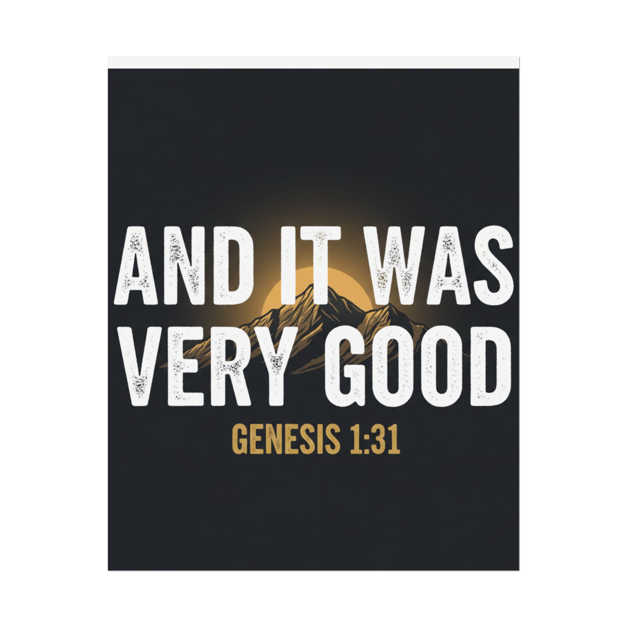 Crisp, rolled art prints that bring a quiet, hopeful moment to your walls. The design centers on bold, textured lettering—”And It Was Very Good”—with a warm sunrise behind a mountain silhouette and the scripture reference Genesis 1:31 beneath. Choose Fine Art, Matte, or Semi-Glossy paper and a vertical or horizontal layout to match your space. Each print arrives carefully rolled for easy framing or mounting, and the archival-quality options hold color and texture true over time so the glow of that sunrise keeps shining in your home.