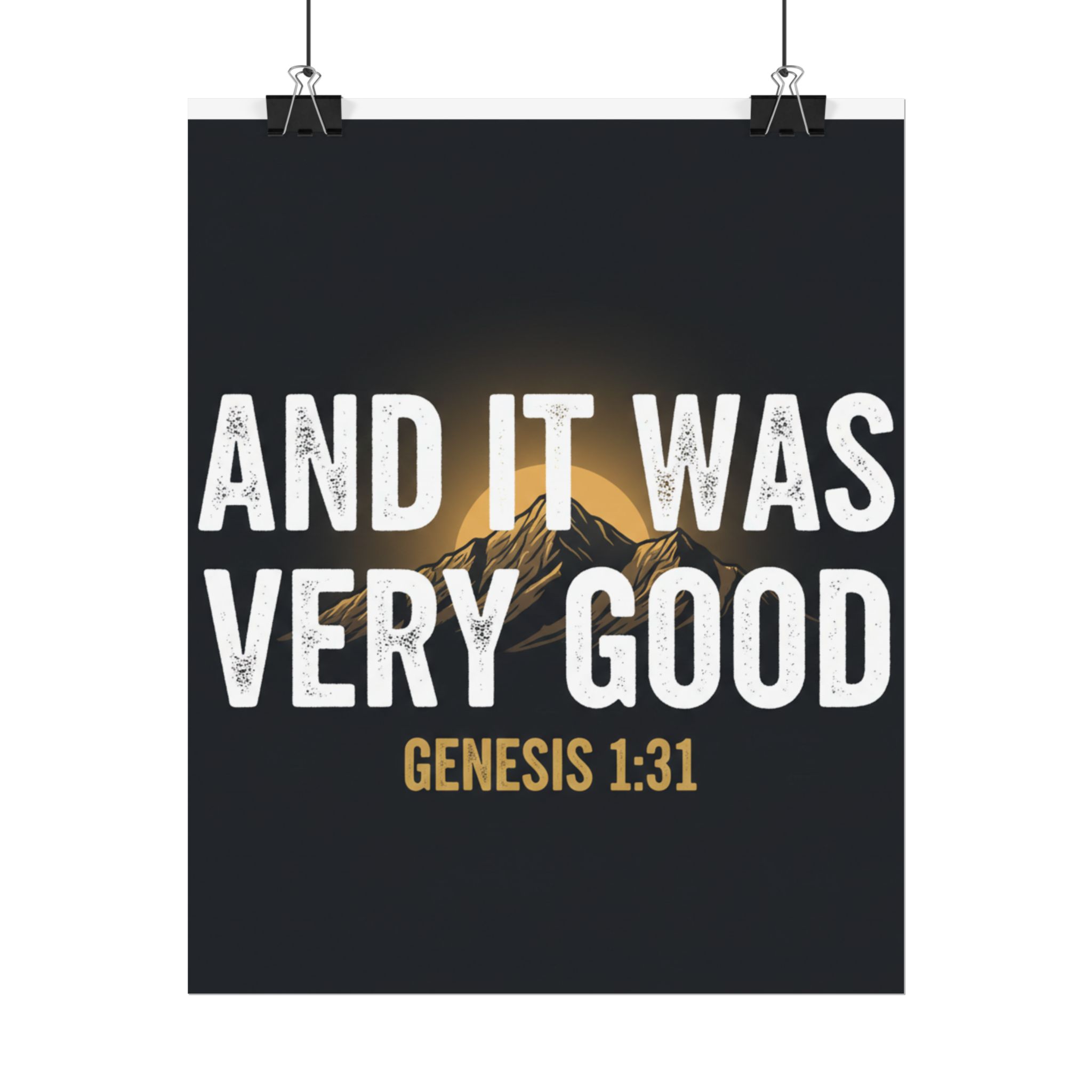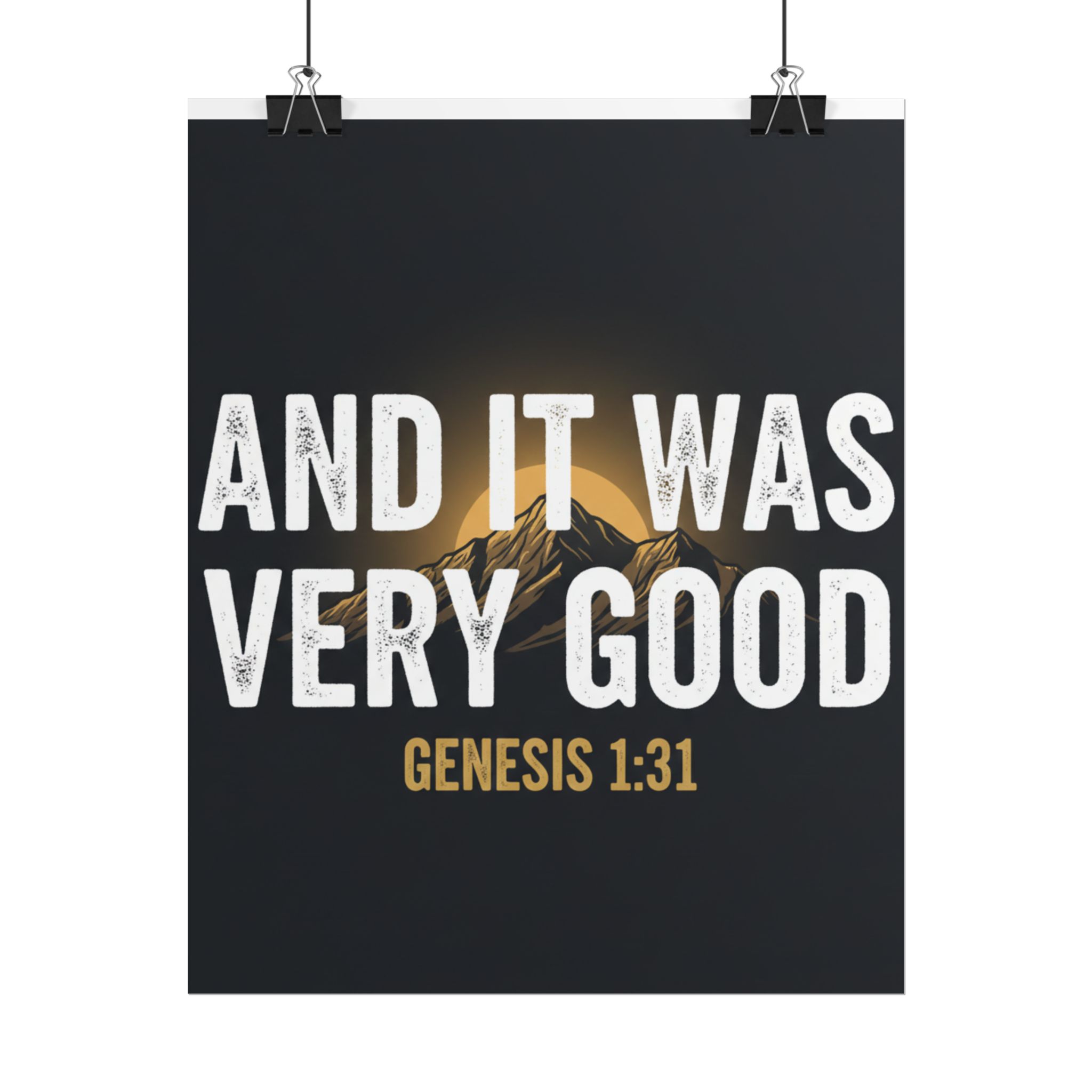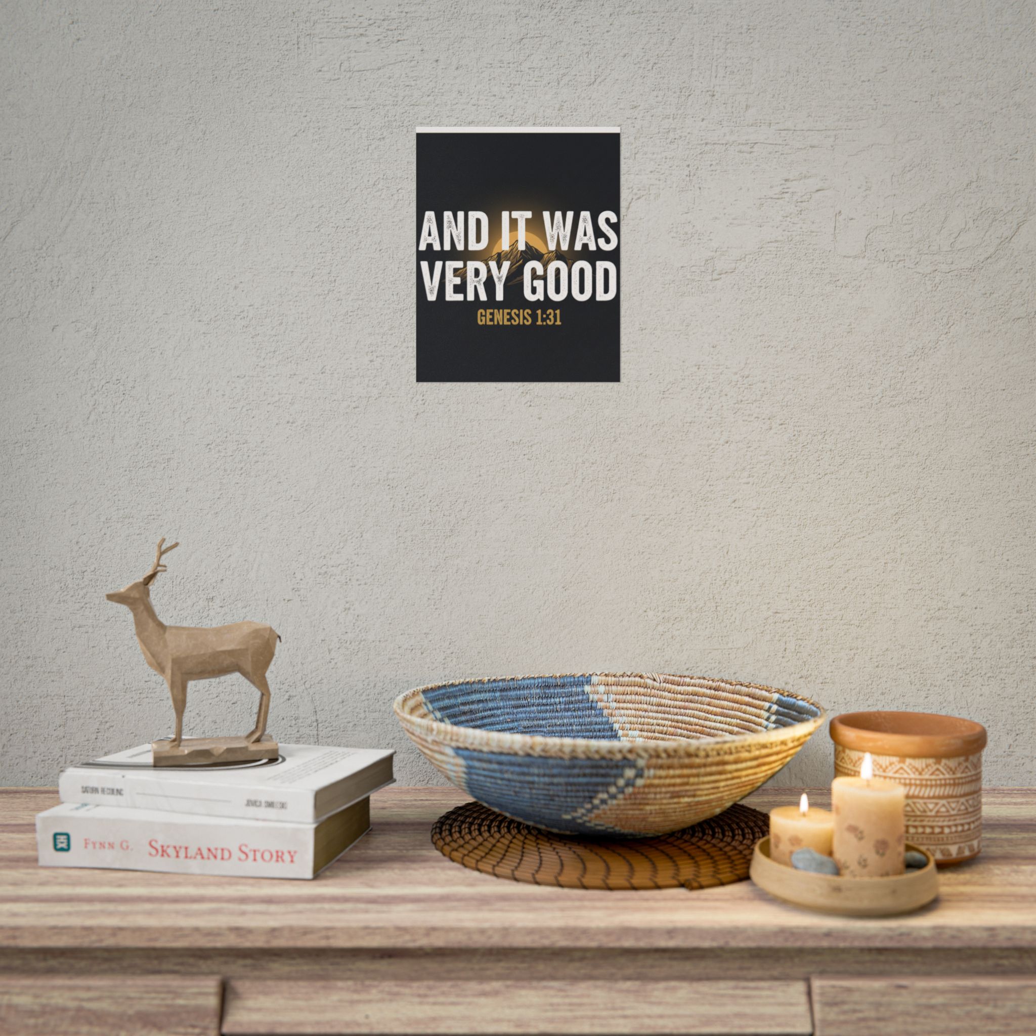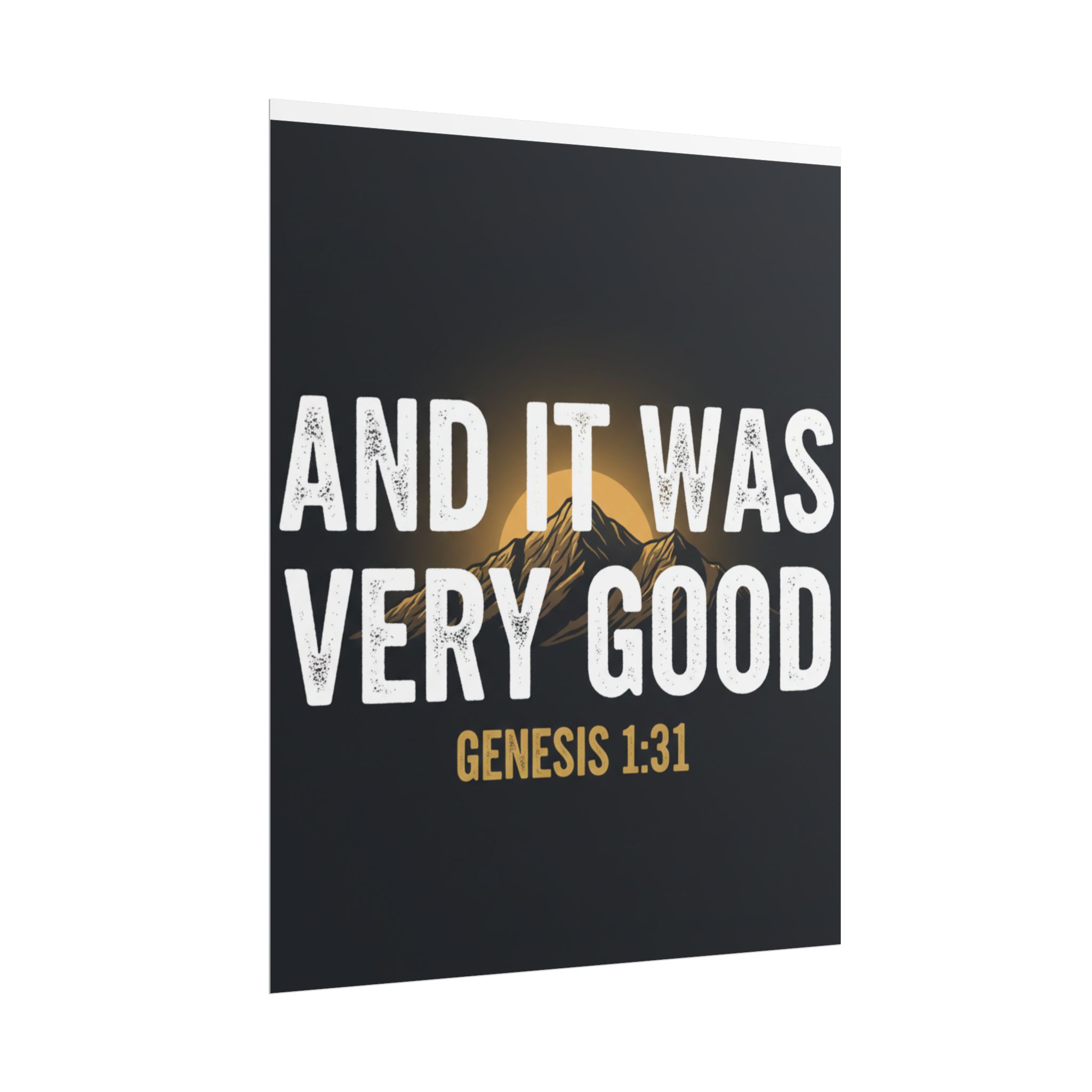 Crisp, rolled art prints that bring a quiet, hopeful moment to your walls. The design centers on bold, textured lettering—”And It Was Very Good”—with a warm sunrise behind a mountain silhouette and the scripture reference Genesis 1:31 beneath. Choose Fine Art, Matte, or Semi-Glossy paper and a vertical or horizontal layout to match your space. Each print arrives carefully rolled for easy framing or mounting, and the archival-quality options hold color and texture true over time so the glow of that sunrise keeps shining in your home.