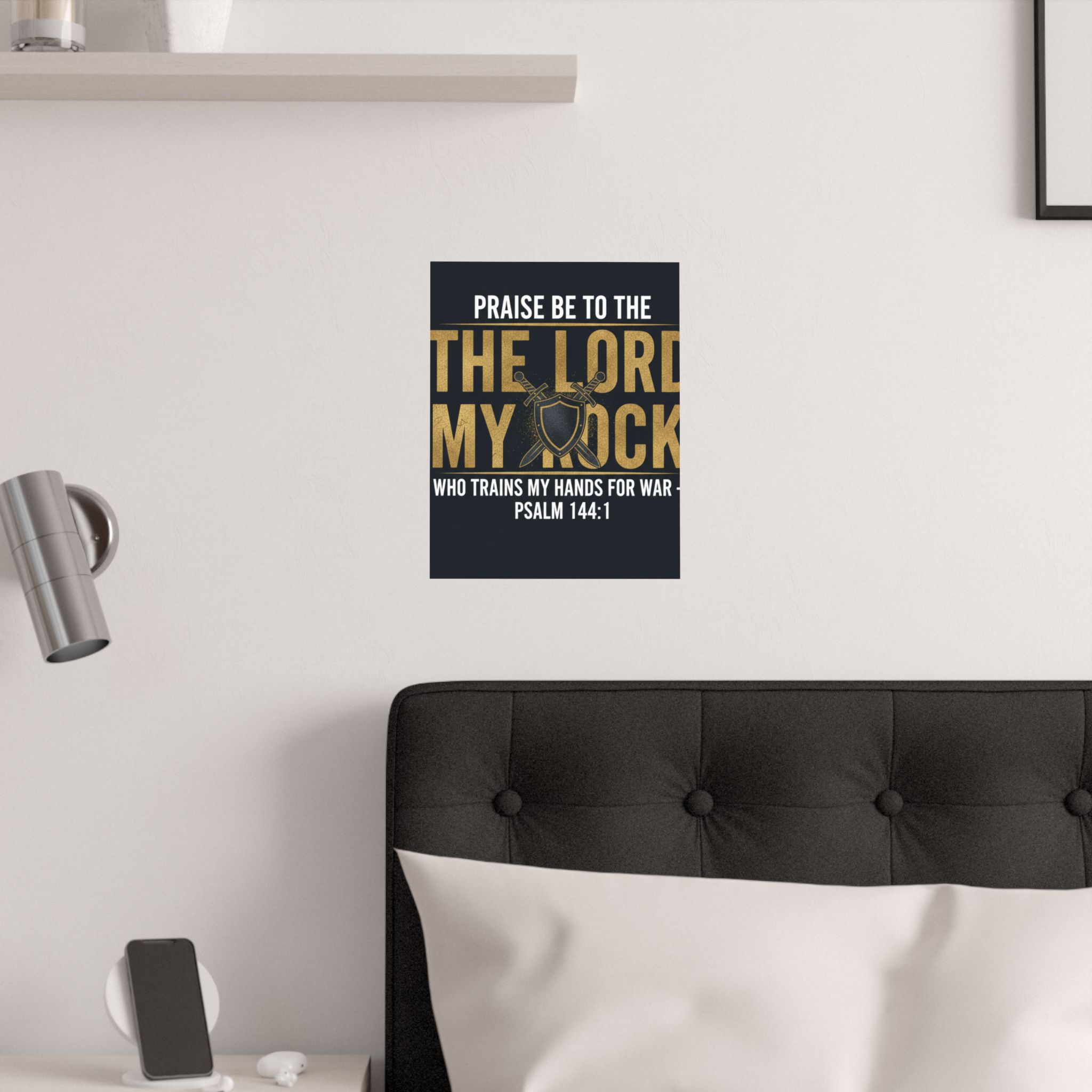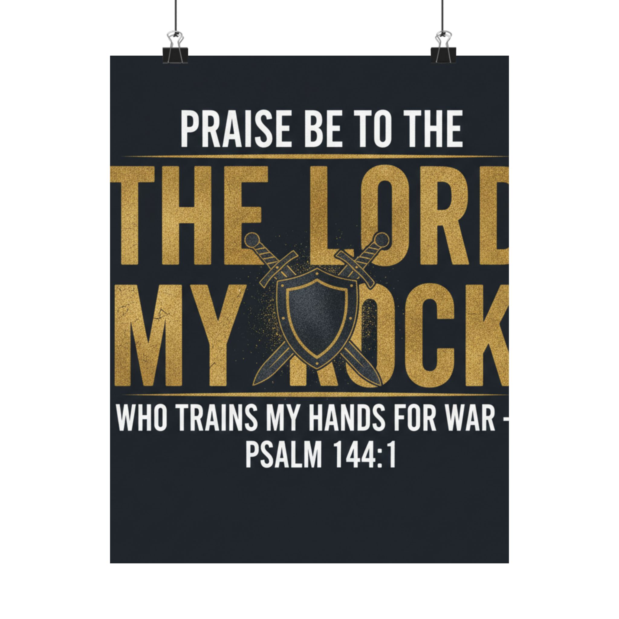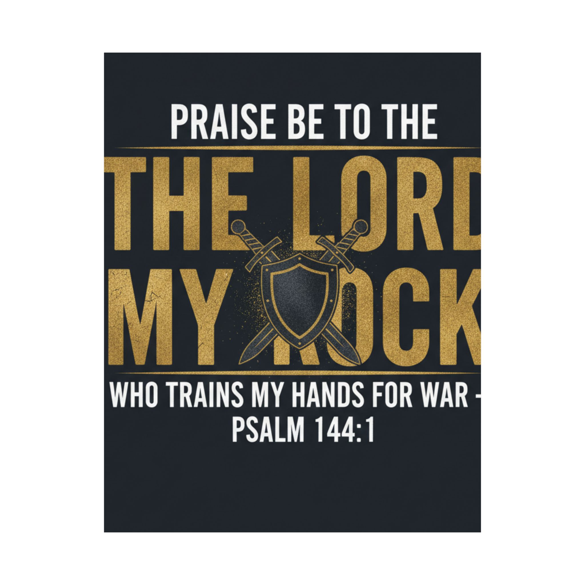 A bold, devotional poster that speaks to strength and faith. Deep charcoal background and rich gold lettering frame the phrase “Praise be to the Lord my rock” with crossed swords and a shield at the center — a visual declaration of spiritual armor and readiness. The low-glare, museum-grade satin finish keeps colors vivid without harsh reflections, so the design reads clearly in a living room, study, church foyer, or home office. Hang it framed or with simple tacks to create a quiet, steady reminder of courage and training through scripture: Psalm 144:1 sits plainly beneath the emblem, grounding the art in reverent confidence.