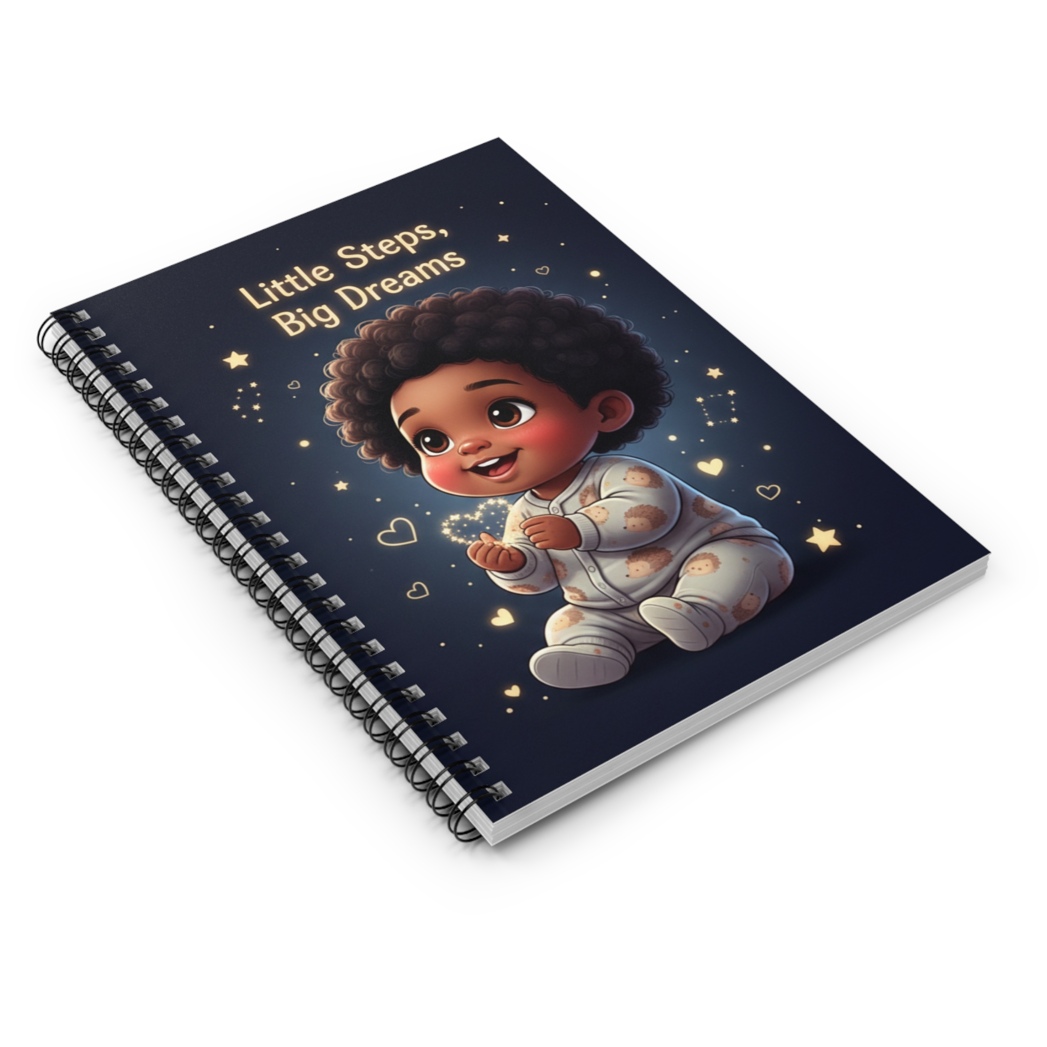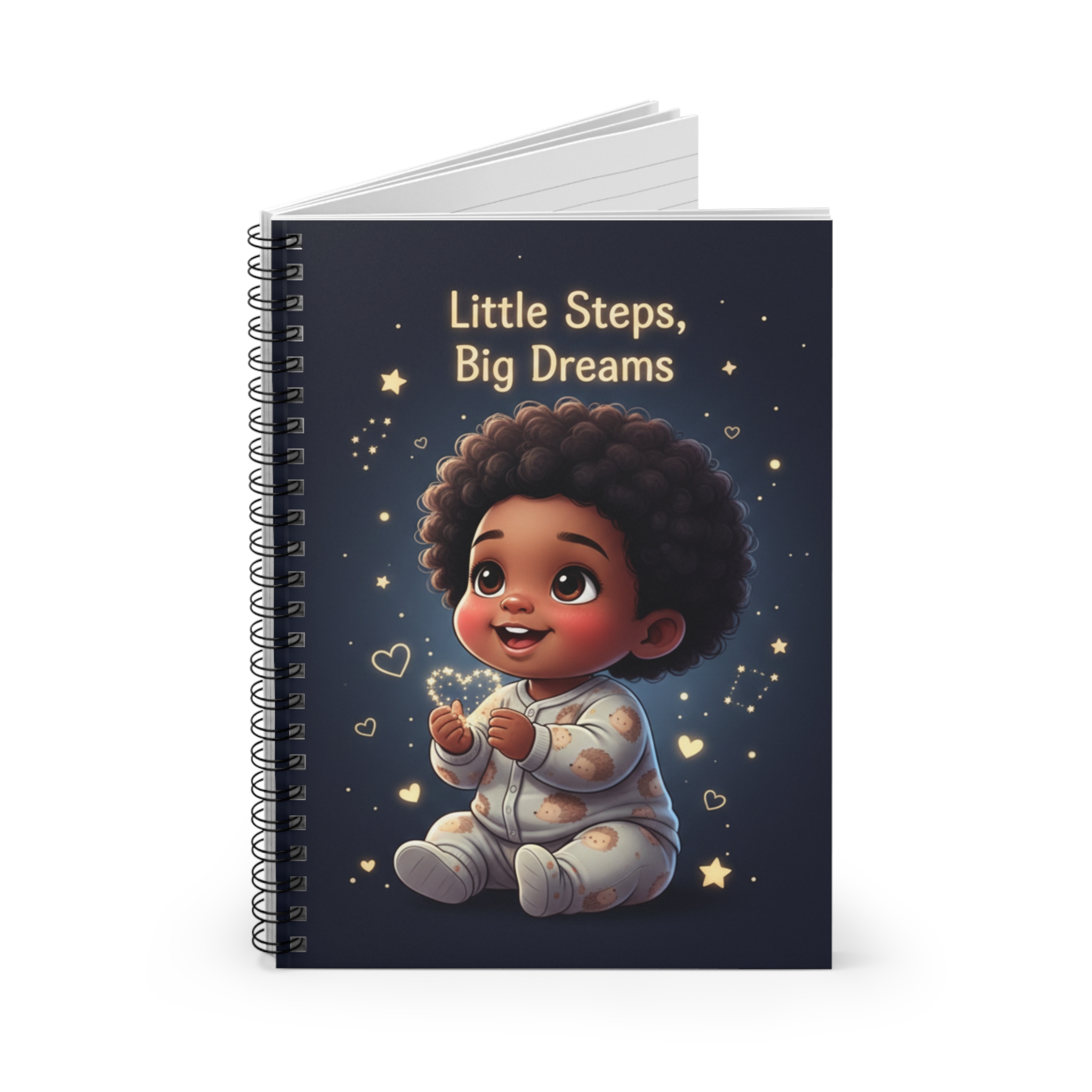 Softly glowing stars and a wide-eyed little dreamer invite quiet moments of note-taking and imagination. This 6″ x 8″ ruled spiral notebook feels like a tiny pocket of wonder—thick, smooth 90gsm pages for steady handwriting, a sturdy 350gsm cover printed with a warm, encouraging illustration, and a metal spiral that lies flat while you jot thoughts, lists, or bedtime memories. The inside back cover includes a document pocket to keep keepsakes or loose notes safe. Use it for daily reflections, nursery planning, or to track a child’s milestones with a design that celebrates small steps and big hopes.